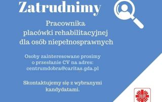 CENTRUM POMOCOWE CARITAS im. św. Jana Pawła II ul. Fromborska 24, Gdańsk ogłasza nabór na stanowisko: OPIEKUN w Domu Pomocy Społecznej WYMAGANIA: Wykształcenie -średnie (mile widziane kwalifikacje zawodowe) – umiejętność pracy w zespole – punktualność, rzetelność, odpowiedzialność – wysoka kultura osobista, – życzliwy i pełen wyrozumiałości stosunek do osób [...]