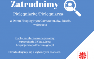 Dom Hospicyjny Caritas im. św. Józefa - Al. Niepodległości 632, Sopot - ogłasza nabór na stanowisko: Opiekunka/Opiekun Medyczny Wymagania: Wykształcenie średnie (mile widziane kwalifikacje zawodowe opiekuna medycznego) Umiejętność pracy w zespole Wysoka kultura osobista Życzliwy i pełen wyrozumiałości stosunek do pacjentów Zakres obowiązków: Wykonywanie czynności higieniczno – pielęgnacyjnych Karmienie i [...]