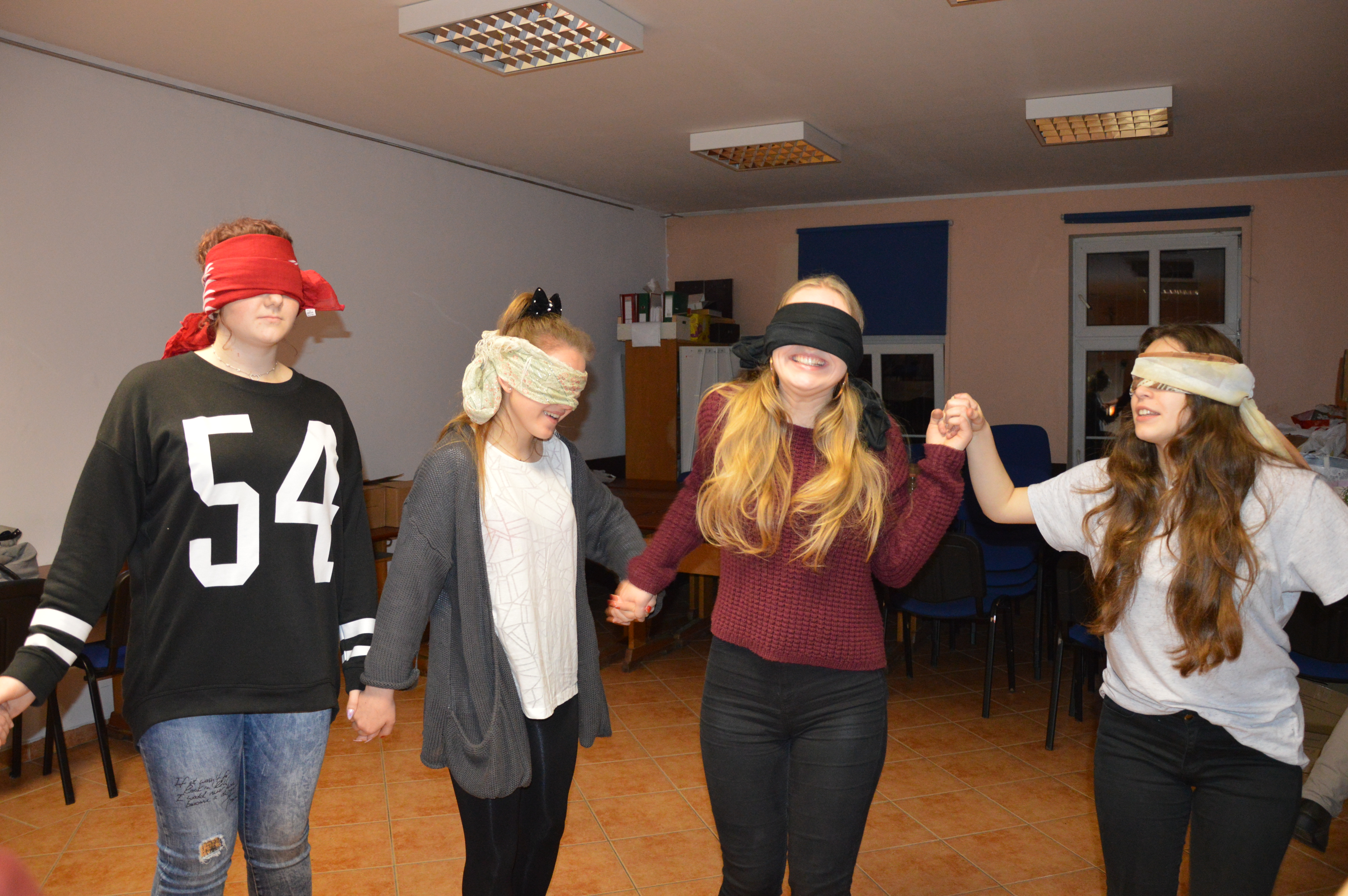 Listopadowe zajęcia młodzi liderzy rozpoczęli od nauki dobrej organizacji i planowania pracy. Na wejściu czekał na nich długi kij, jeszcze dłuższy sznur i chusty do zawiązania oczu… Co się działo dalej możecie zobaczyć na zdjęciach. Jak to na warsztatach uczestnicy zgłębiali temat od strony praktycznej – doświadczając na sobie co jest ważne we współpracy oraz planowaniu i organizowaniu działań. Po omówieniu ćwiczeń zasiedli do kolejnego zadania, którym było stworzenie plakatu ich grupy. Razem „wznieśli się na wyżyny”…