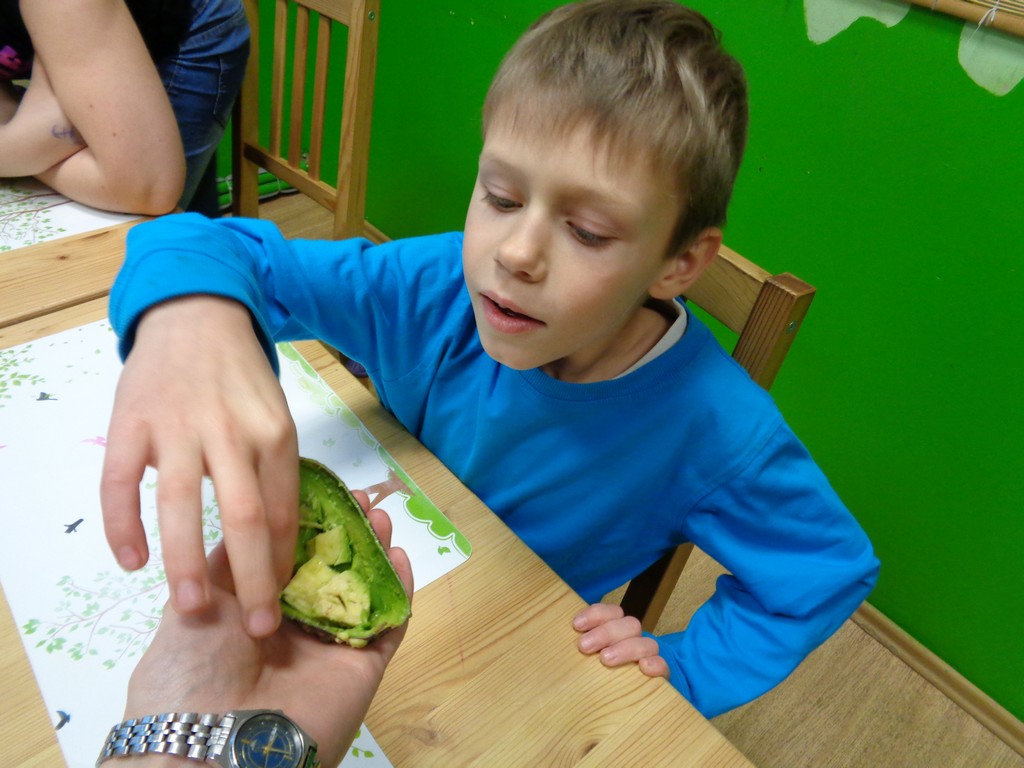 Awokado wśród podopiecznych Centrum Frassati wzbudziło nie lada zdziwienie. Dla niektórych był to pierwszy kontakt z tym egzotycznym owocem. Dzieciaki zainteresował ciekawy wygląd awokado, jego szorstka skórka, kolor, duża pestka… jednak oswojenie kubków smakowych wymagało więcej czasu i odwagi. Grupa „Sparta” postanowiła przygotować mleczny koktail z awokado, młodsi próbowali kawałków owowcu podanego w naturalnej skórce. Niewątpliwie walory zdrowotne tego owocu przekonywały bardziej niż jego smak 🙂