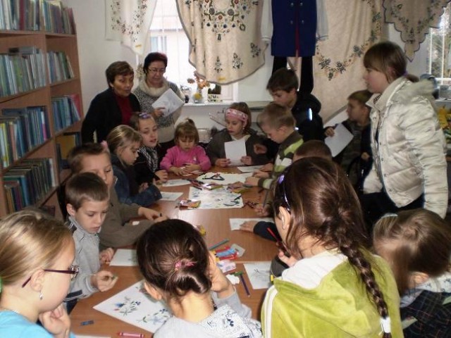 Natomiast w przeddzień pierwszej rocznicy powstania Świetlicy Środowiskowej, Biblioteka Publiczna znów miała przyjemność nas gościć, zapraszając na wystawę haftów kaszubskich. Przybyła również pani Krystyna Dering, która bardzo ciekawie opowiedziała o kolorach widniejących na haftach, jak i również o tym co symbolizują i jakie wyróżniamy rodzaje wzorów. Barwnie przedstawiła swą wiedzę na ten temat, rozmawiając z dziećmi oraz wolontariuszami parafialnego zespołu Caritas. Przybyli otrzymali kartki obrazujące kontury haftów kaszubskich, które mieli pokolorować wzorując się na bibliotecznej wystawie, przygotowanej przez koło Haftu Mereżka ze Strzebielina. Wystawa wyszywanych obrusów oraz strojów kaszubskich zaciekawiła młodzież, jak i dzieci oraz zachęciła wielu do pogłębienia wiedzy na ich temat.