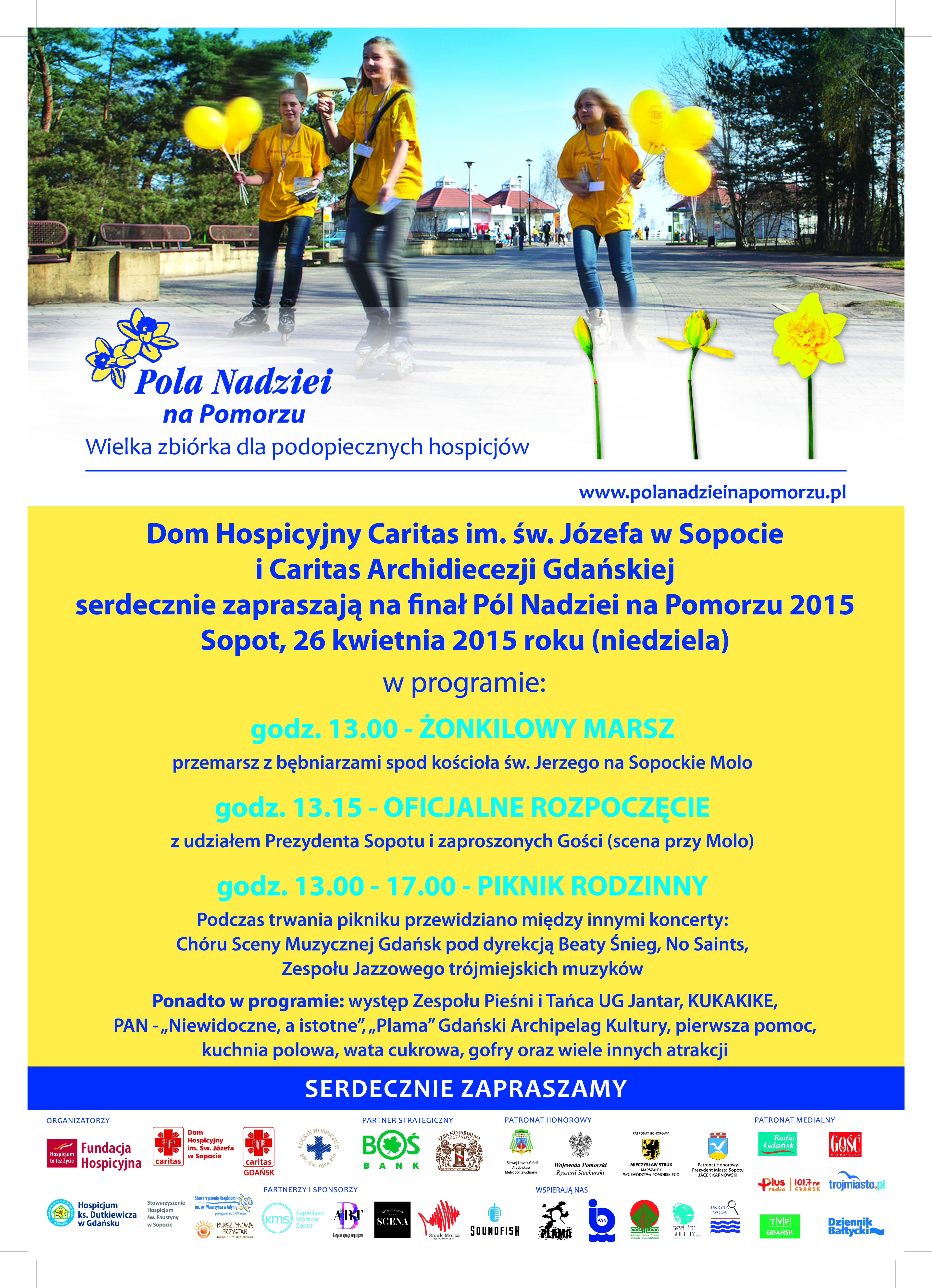 Przyszła wiosna, a wraz z nią zakwitają żonkile i nadzieja! Finał kolejnej edycji akcji Pola Nadziei na Pomorzu 2015 już 26 kwietnia. Jej celem jest pozyskiwanie środków na potrzeby hospicjów i promowanie wolontariatu. Tego dnia w Sopocie, Pucku, Gdyni i Gdańsku odbywać się będą różne atrakcje. Sopocki Piknik Rodzinny przygotowuje Dom Hospicyjny Caritas im. św. Józefa wraz z Caritas Archidiecezji Gdańskiej.