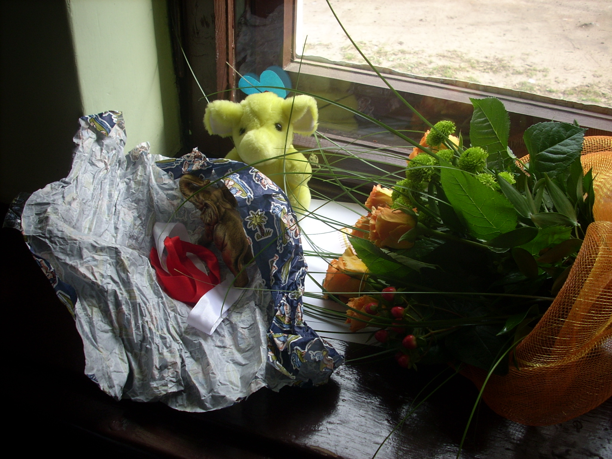 Wracając do 4 maja to przedpołudniem odbyły się normalne zajęcia(ale smutek wisiał już w powietrzu), a po południu zrobiliśmy pożegnanie. Zasłoniliśmy Cioci oczy podczas wejścia c. Oli oraz dzieci z prezentem. Wszyscy ustawili się w kręgu, delegacja wręczyła Cioci Tani bukiet róż oraz prezenty. Każdy osobiście chciał się pożegnać i uściskać z ciocią i oczywiście zrobić sobie pamiątkowe zdjęcie. Z trudem powstrzymywaliśmy łzy. Nasza kochana grupa „Klaudisus i Olusus” (nazwa grupy przypadkowo wymyślona przez autora podczas pisania artykułu) zaśpiewała piosenkę na temat Cioci pobytu oraz dośpiewała, że będziemy tęsknić. Będziemy na pewno.
