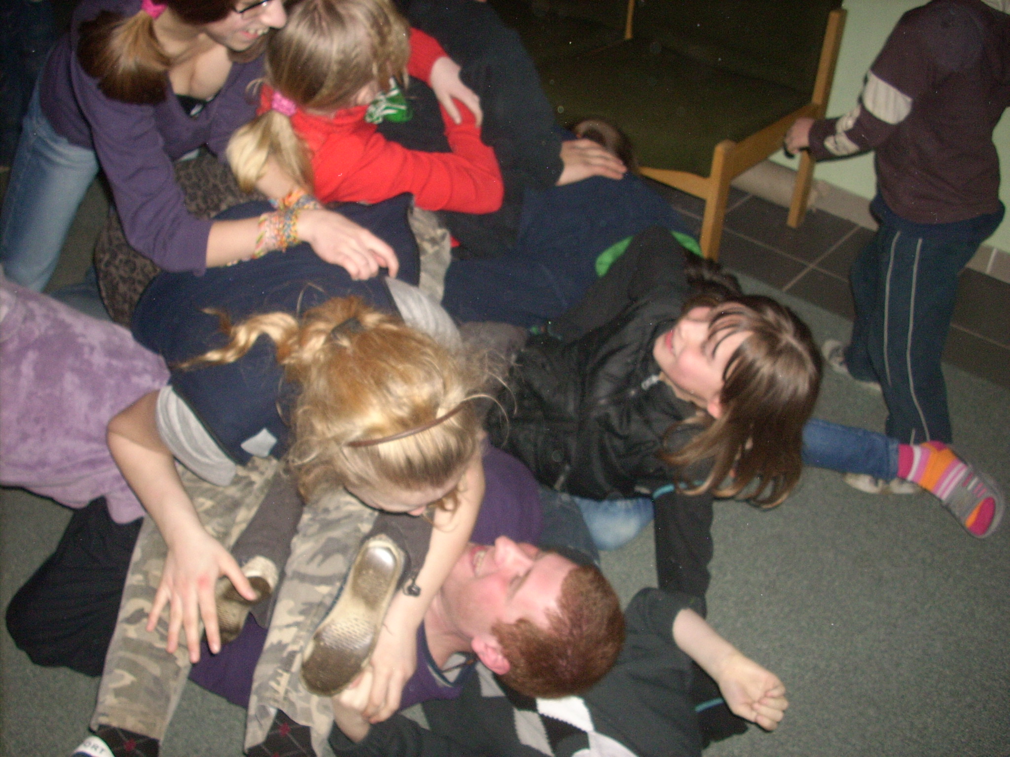 Dziś, czyli 22 lutego naszą placówkę ogarnął smutek. Musieliśmy pożegnać się z naszym wujkiem Gio – czas jego pobytu w naszej placówce dobiegł końca. Zajęcia świetlicowe, rozpoczęły się tradycyjnie od odrabiania lekcji. Później spotkaliśmy się w kręgu, każdy mógł powiedzieć jak się czuję. Wujek zaproponował zabawy: „Kapitana” i „Zbijaka”. W tym samym czasie, kiedy inni świetnie się bawili, Natalia i Sylwia w kuchni, toczyły walkę z mąką i innymi produktami, by potem wyjść z niej zwycięsko i jako łupy wojenne przyniosły wspaniałe ciasteczka z kawałkiem jabłka i cynamonem (tak naprawdę, żadnej wojny nie było, dziewczyny po prostu je upiekły). Potem spotkaliśmy się przy stole na słodki poczęstunek, by po chwili wrócić do kręgu. Byliśmy świadkami uroczej scenki pożegnalnej, przygotowanej przez Emilę i Julię specjalnie dla wujka. Aby wujek o nas nie zapomniał daliśmy Mu koszulkę z odbitymi naszymi dłońmi, każdy mógł powiedzieć wujkowi kilka miłych słów, przytulić się, zrobiliśmy jeszcze pożegnalne zdjęcia i nadszedł czas powrotu do domu. Wujek Gio był z nami od września, będziemy miło wspominać ten czas i na pewno długo pozostanie w naszej pamięci.