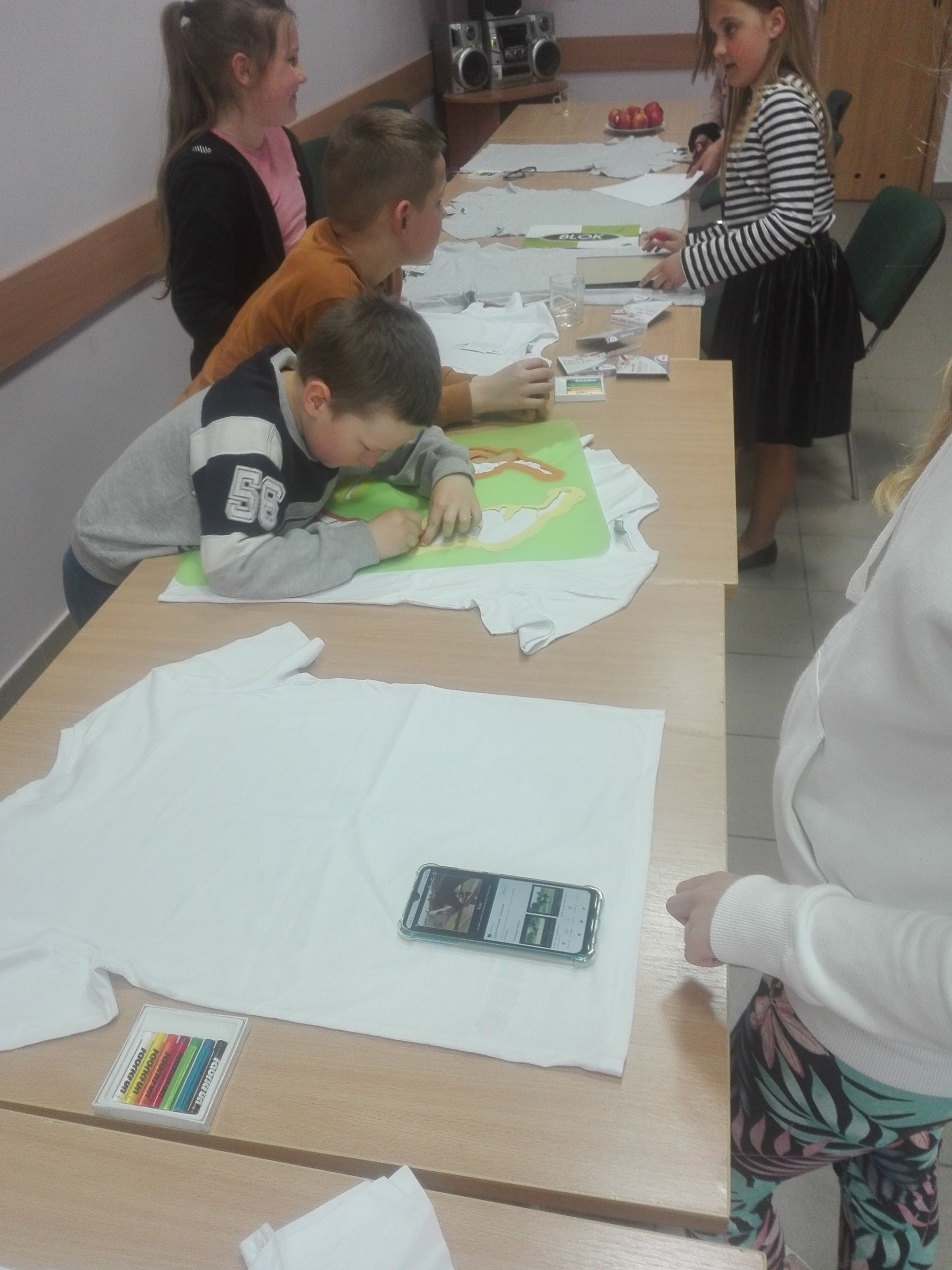 Ostatnio na zajęciach w naszej świetlicy w Łapinie ozdabialiśmy koszulki własnymi rysunkami i napisami. Niektórzy uczestnicy zdecydowali, że zrobią koszulkę dla mamy. Młodsze dzieci skorzystały z szablonów malarskich. Starsze miały własne pomysły. Zajęcia sprawiły dużo radości i satysfakcji.