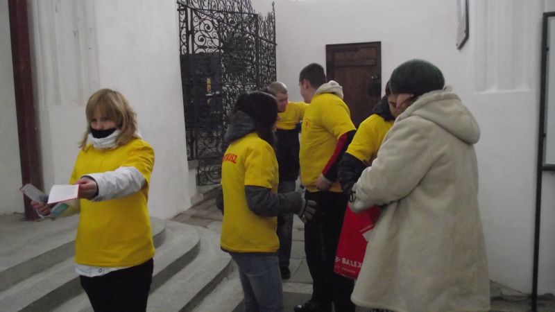 Chociaż niedzielny poranek był bardzo mroźny (-10 C) nasi Wolontariusze wstawili się do akcji prowadzonej na terenie parafii pw. Św. Piotra i Pawła oraz Matki Boskiej Wniebowziętej (Bazylika Mariacka). Z powodu silnego mrozu myślałam o odwołaniu akcji ale Oni byli, więc do pracy! Rozdawaliśmy ulotki i zachęcaliśmy wiernych do przekazu 1 % podatku na Caritas Archidiecezji Gdańskiej. Pieniądze zebrane podczas tej akcji przeznaczone zostaną na potrzeby dzieci i młodzieży z rodzin ubogich, rehabilitację oraz Hospicjum Caritas. Dobrze, że mamy takich księży jak ks. Sławek Skoblik, który wyszedł nam na pomoc. Otworzył ciepłą salkę, w której czekała gorąca herbata i coś słodkiego. Ksiądz nas pamięta i mile wspomina czas pracy w naszym gimnazjum. Jego dobre słowo zachęciło nas do dalszego działania. Michał H. i Damian W. pomagali księdzu służąc przy ołtarzu podczas Mszy Św. Zostało nam trochę ulotek. W ramach zajęć SKC wyruszymy w teren. Może aura będzie sprzyjająca. Z przyjemnością kieruję słowa podziękowań dla Pani Anity Szymańskiej za pomoc w prowadzeniu akcji. Mimo mroźnego przedpołudnia Pani po prostu była i zajęła się młodzieżą. Dziękuję!