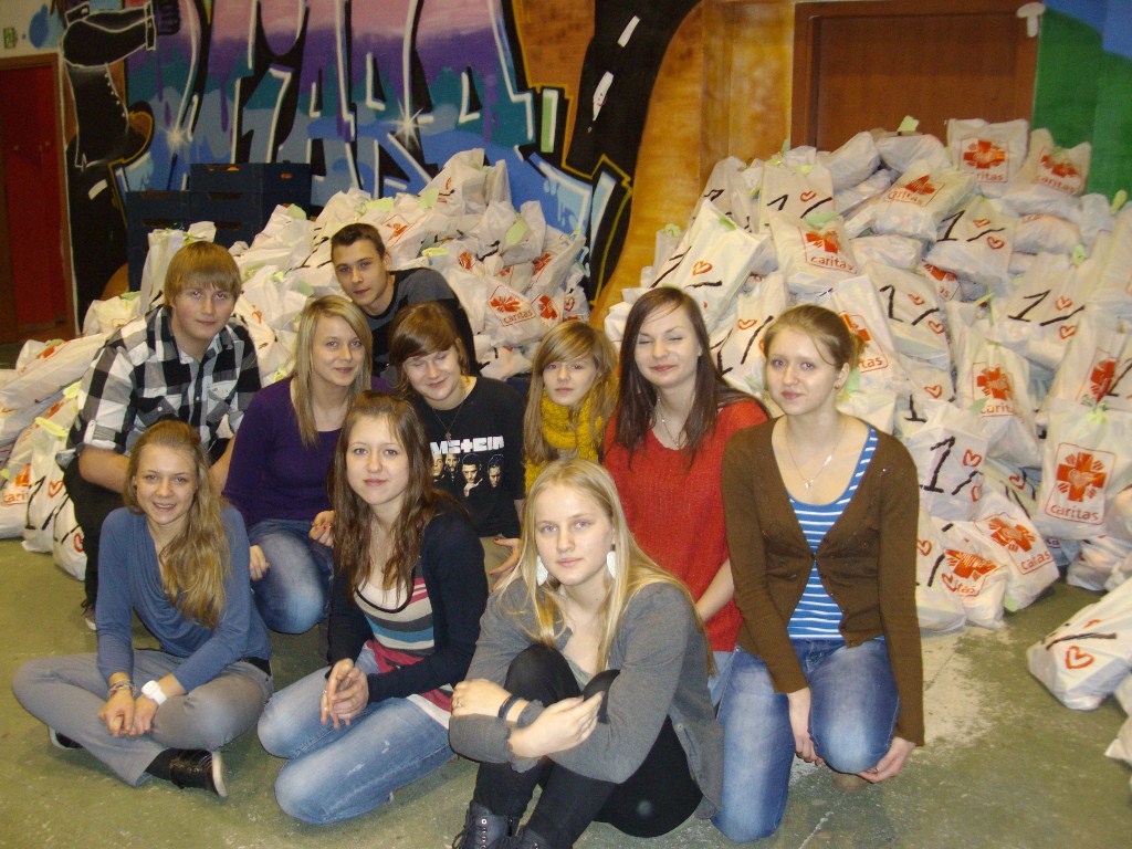 Od ubiegłego czwartku w Centrum Wolontariatu na Jesionowej we Wrzeszczu trwają intensywne przygotowania do akcji „Puk! Puk! Tu Święty Mikołaj Caritas!”. W akcję bardzo licznie zaangażowali się wolontariusze Szkolnych Kół Caritas z Gimnazjum nr 23 w Oliwie, II Liceum Ogólnokształcącego we Wrzeszczu oraz Gimnazjum nr 8 w Gdańsku na Dolnym Mieście. Pomagali nam również uczestnicy projektu Druga Szansa i Wolontariusze Centrum Wolontariatu. Oj działo się! Najpierw było rozładowywanie i sortowanie przywożonych artykułów, przygotowanie „linii produkcyjnej”, no i wreszcie pakowanie! Na tym nie koniec – spakowane już paczki, trzeba było zawiązać i przyczepić do nich papierowe chmurki z życzeniami świątecznymi. Tutaj ogromną pomocą wsparły nas dzieci i wychowawcy z Centrum Frassatiego we Wrzeszczu, którzy w jeden dzień wycieli 2000 chmurek!