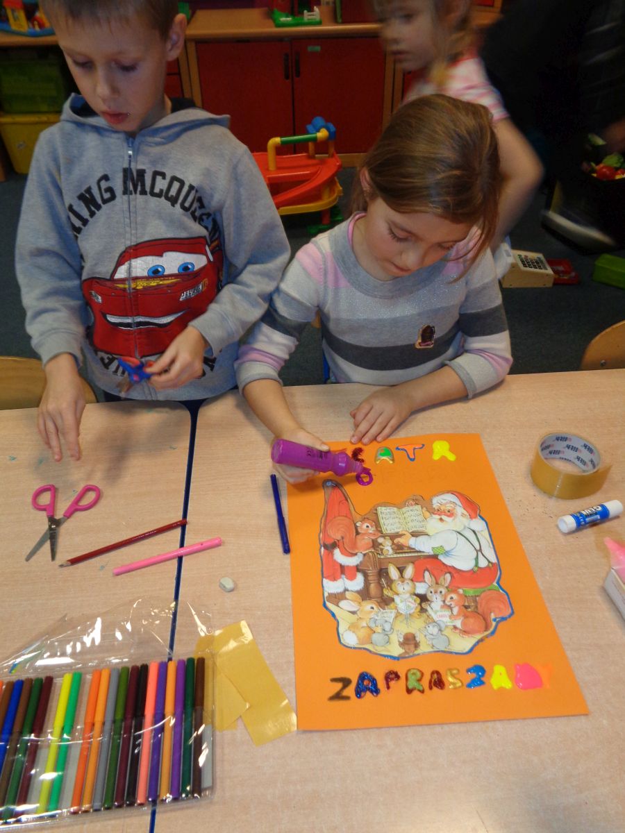 Dzieciaki z Jesionowej przygotowują sie do mikołajkowego przedstawienia Teatru „Qfer”. Z entuzjazmem podopieczni wykonali pięknie zdobione zaproszenia i okolicznościowy plakat. W ramach projektu: „Teatralny Qfer” w tą sobotę w naszym Centrum będziemy mieli okazję uczestniczyć w interaktywnym przedstawieniu teatru kukiełkowego, na które dzieci czekają z niecierpliwością.