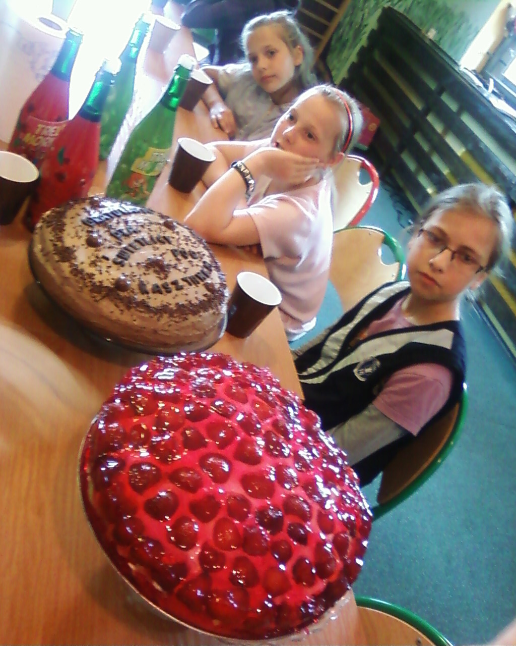 Od niedzielnego poranka cieszymy się z naszej wygranej. Wczoraj dobra wiadomość dotarła do wszystkich, którzy nie słuchali „Zagadkowej Niedzieli” w Radiowej Trójce, a dziś (wtorek) przyszła do nas Zuzia – nasza wolontariuszka i inicjatorka całego „guzikowego przedsięwzięcia”. Przyniosła… DWA PIĘKNE TORTY, które upiekła razem z mamą i szampany (oczywiście bezalkoholowe!) – wszystko po to, żebyśmy mogli uczcić nasze zwycięstwo! Trzeba dodać, że torty były nie tylko piękne, ale i pyszne (czego niestety nie zobaczycie na zdjęciach), a szampan – za sprawą wujka Floriana – tryskał z butelki niczym przy wielkich tryumfach kolarskich. Przy stole było wesoło i bardzo słodko, a ciasta było tyle, że zostało nam jeszcze na następny dzień.