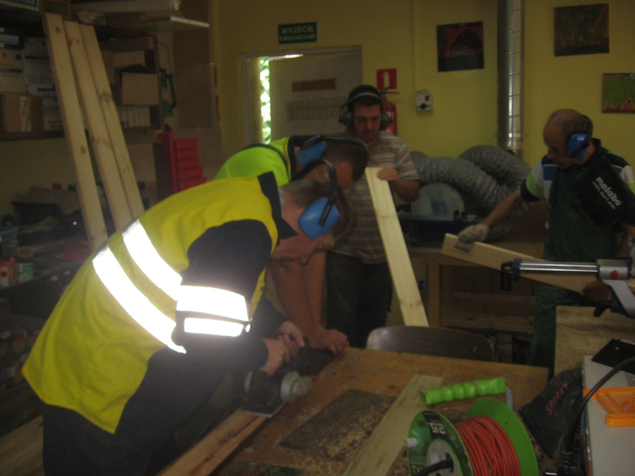 Jednym z zadań terapeutycznych w pracowni stolarskiej w WTZ w Łapinie jest rehabilitacja zawodowa. Podczas zajęć uczestnicy w/w pracowni pod okiem instruktora terapii Pana Łukasz, uczą się obróbki drewna- heblują, szlifują, wkręcają śruby, wbijają gwoździe. Podczas zajęć uczestnicy nabywają umiejętności posługiwania się podstawowymi narzędziami stolarskimi. Pracownia stolarska współpracuje z innymi pracowniami  na ich rzecz których wykonują ramki do obrazów a także naprawiają różnego rodzaju przedmioty (stoły, krzesła, półki). Na dzisiejszych zajęciach panowie heblują i ręcznie szlifują deski do ławek, które stoją pod naszym ośrodkiem.