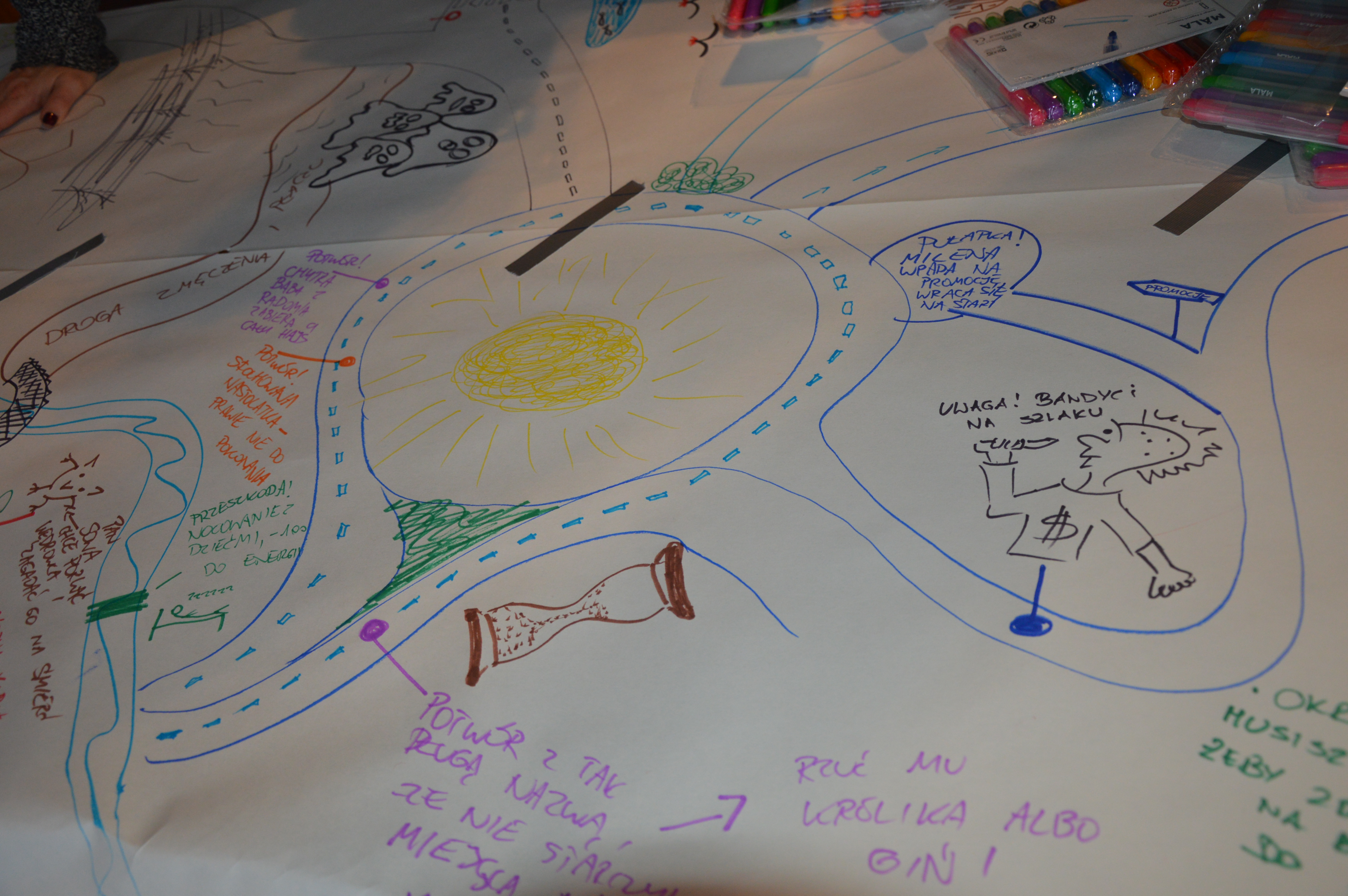 Wczoraj nasza kadra ze świetlic trójmiejskich uczestniczyła w warsztatach z budowania zespołu. Szkolenie zorganizowało dla nas Stowarzyszenie „Menedżerowie Marzeń”, a poprowadził je Pan Jarek Łojewski – coach z firmy Kreatyw.pro. Na parę godzin przenieśliśmy się w wyimaginowany świat z Rycerzem Bobem i Księżniczką Gwiazdą Śledziową na czele, gdzie razem tworząc grę planszową staraliśmy się osiągnąć wspólnie postawiony cel wykorzystując przy tym indywidulane moce stworzonych przez nas postaci.
