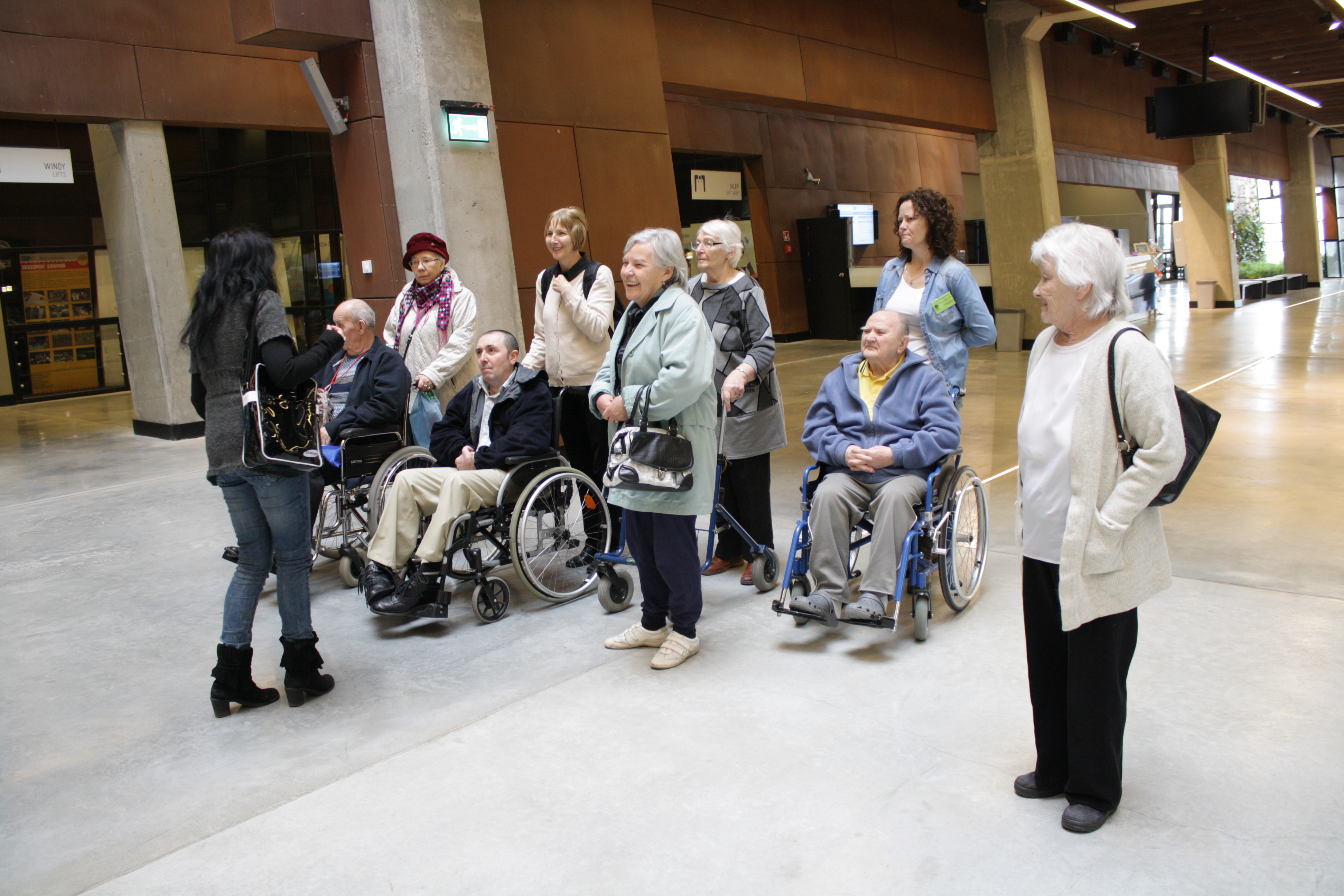 Uczestnicy początkowo nie byli przekonani co do miejsca, które mają zwiedzać. Związane to było z powrotem do dawnych, często trudnych chwil oraz obawą czy dadzą radę przemierzyć tak ogromny budynek. Wszelkie ich rozterki i wątpliwości zostały jednak szybko rozwiane. Kiedy przekroczyliśmy drzwi Europejskiego Centrum Solidarności czekała na nas przewodniczka Pani Monika Dudek, która przywitała nas z wielkim uśmiechem. Czas zwiedzania upływał w życzliwej i radosnej atmosferze. Przeogromna wiedza, zapał i entuzjazm przewodniczki zachwycił mieszkańców CPC im. Jana Pawła II. Nowoczesność połączona z dawną historią Solidarności sprawiły, że seniorów ciężko było zachęcić do powrotu na Fromborską ….. i czy ktoś wcześniej coś wspominał o ograniczeniach fizycznych?