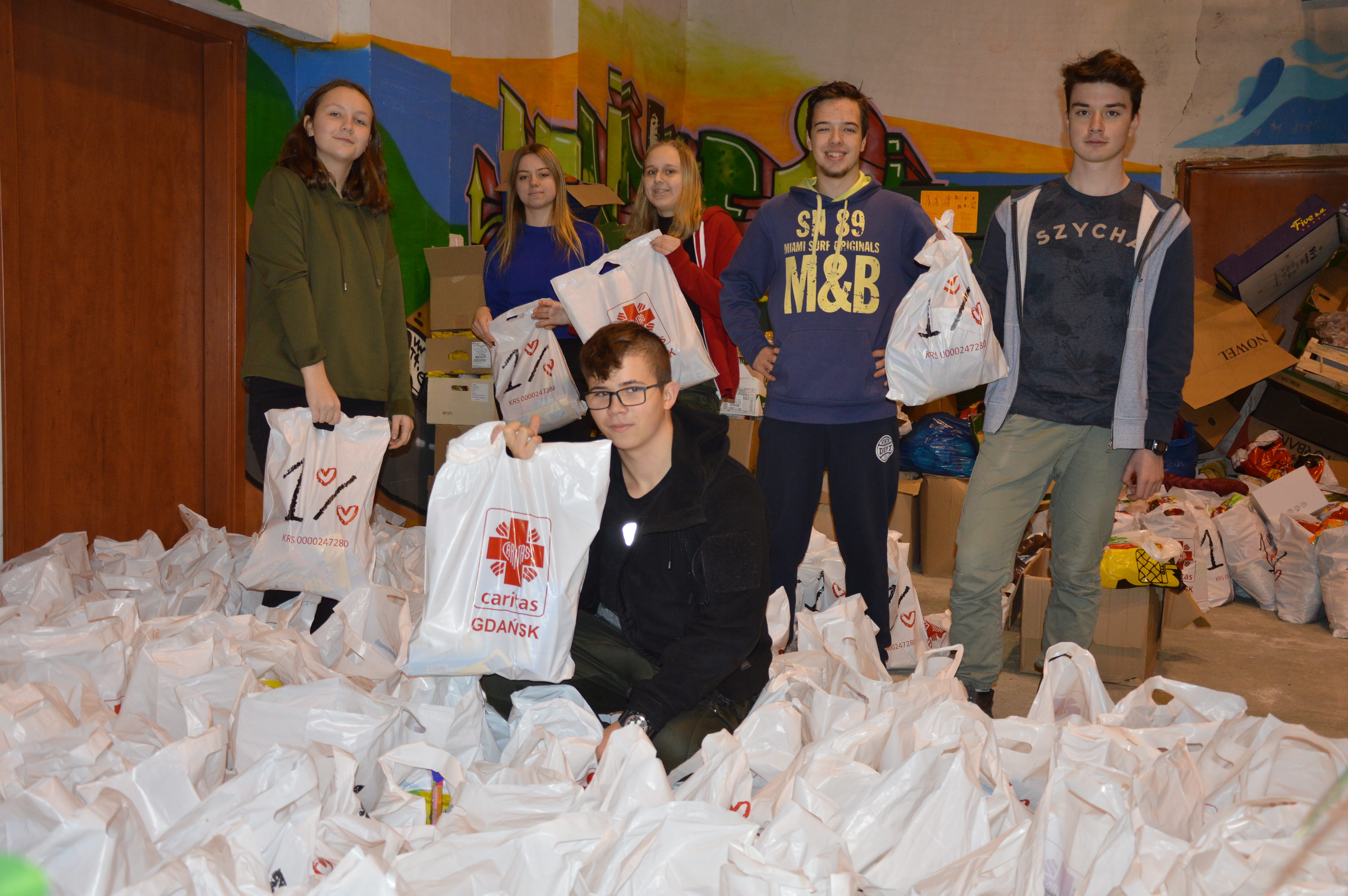 Wczoraj po południu 8 wolontariuszy ze Szkolnego Koła Caritas w SP nr 1 w Gdańsku (dawne Gimnazjum nr 27) przyszło nam pomóc w spakowaniu 230 paczek. Zajeło im to nie całą godzinę. Przy okazji świetnie się bawili. Niektórzy nawet tańczyli co widać na załączonych zdjęciach. Weronika, Natalia, Marta, Wiktoria, Julia, Adam, Nikodem, Sergiusz – bardzo dziękujemy za wczorajszą pomoc!