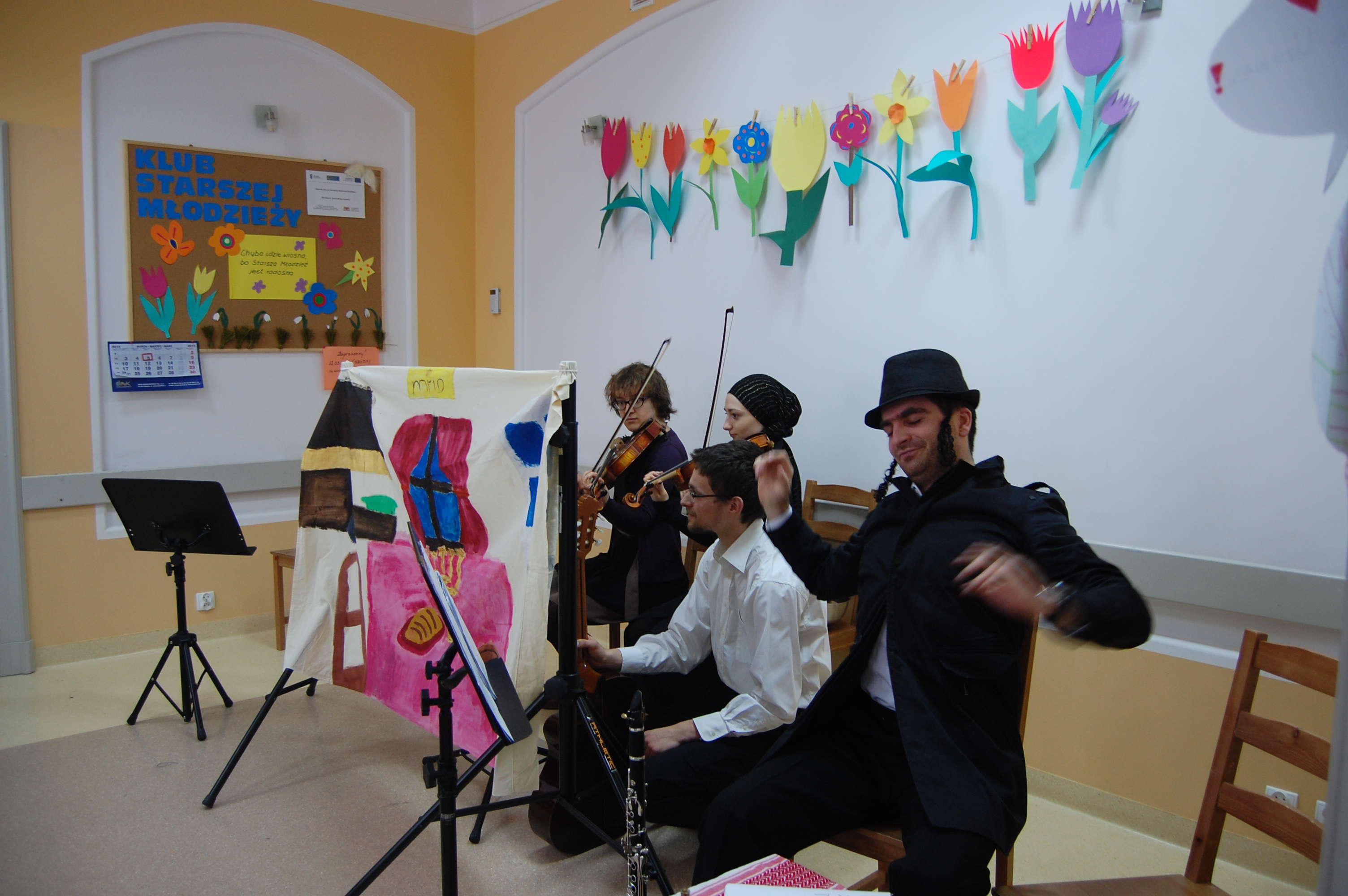 Żydowską tradycjęw muzycznym spekatklu „Skrzypek na dachu”przybliżyła nam Fundacja Art2You , udział wzięli: Roksana Błąkała – skrzypce,Krzysztof Szałek-klarnet,Krzysztof Pawłocki-gitara i Marta Hirsz -altówka.Koncert był wielka przyjemnością zarówno dla Starszej Młodzieży i przedszkolaków.