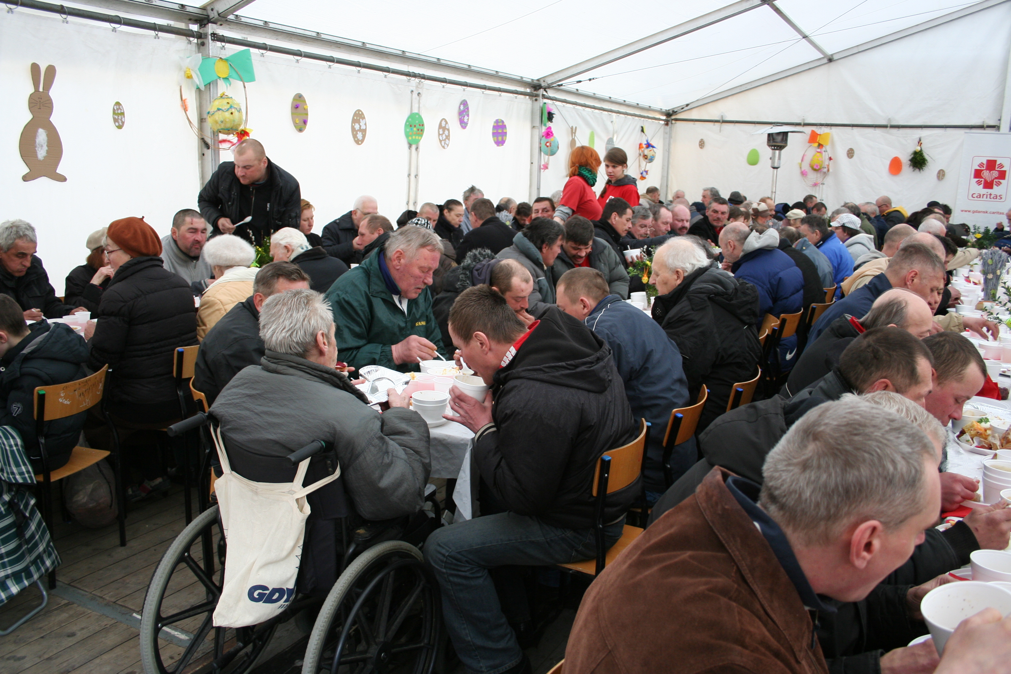 Była wspólna modlitwa, błgosławieństwo pokarmów, serdeczne życzenia. Zaraz potem do stołu zasiadło ponad 300 osób potrzebujących. A na stole – wielkanocne przysmaki przygotowane przez Stołówkę dla ubogich Caritas a podawane przez wolontariuszy. Odświętny nastrój budowały pięknie udekorowane stoły (pracami uczestników WTZ Caritas) oraz piękna muzyka i śpiew – pieśni wielkanocne wykonywane przez grupę muzyczną Neokatechumenatu z Gdańska. By tradycji stało się zadość – po spożyciu posiłku każdy mógł pomalować pisankę. Wiele osób chętnie malowało pobarwione jajka. Na czas świąt goście otrzymali paczki żywnościowe.