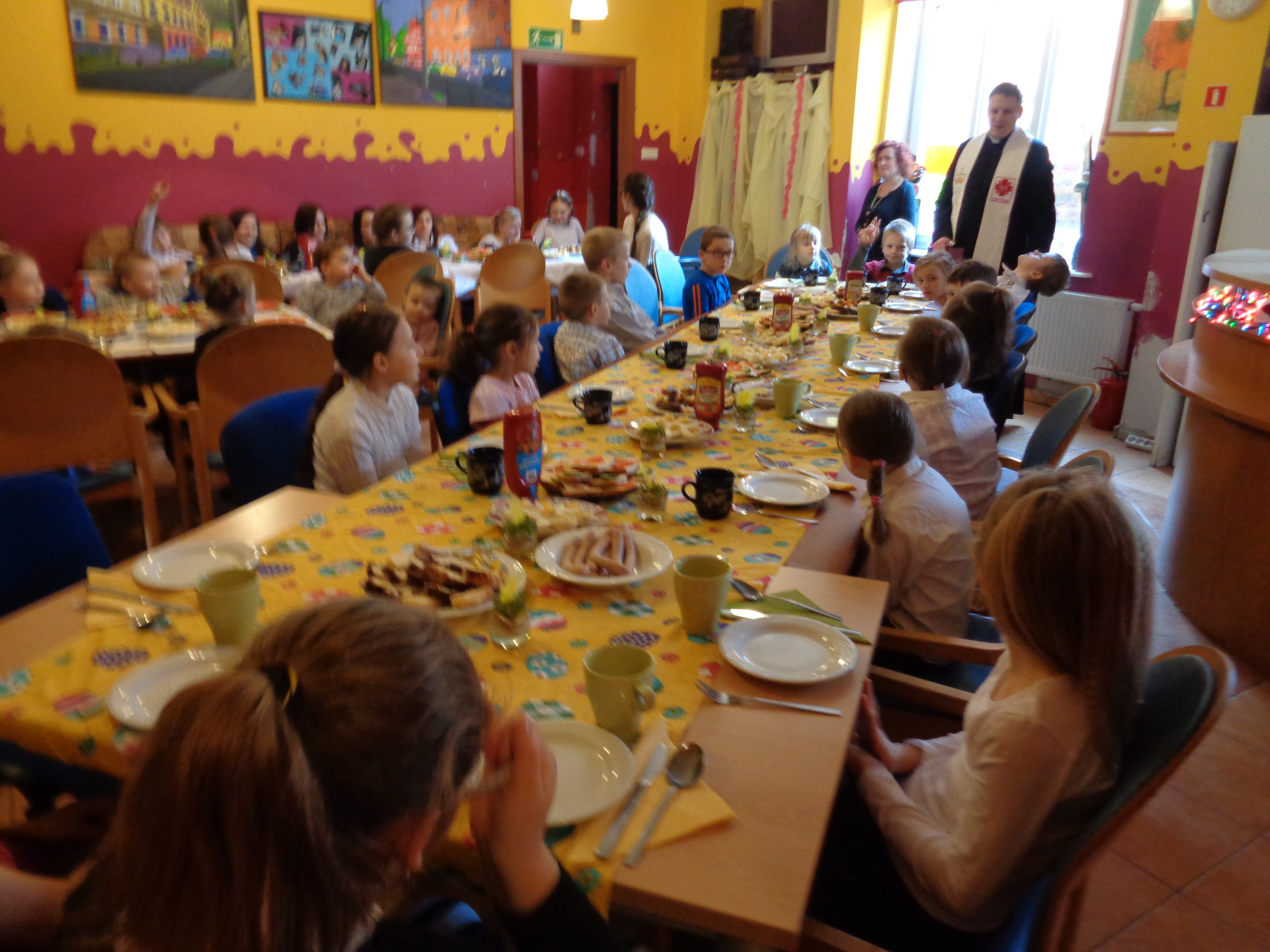 Wczoraj na Jesionowej, według zwyczaju, przy odświętnie zastawionym, wielkanocnym stole, zasiedli podopieczni z wszystkich grup Centrum, wychowawcy oraz ks. Piotr. Po wspólnej modlitwie spożywaliśmy tradycyjne potrawy t.j. żurek, biała kiełbasa, jajka… Każdy dostał też czekoladowe jajko z niespodzianką oraz zajączka. Wspólne świętowanie stwarza okazję do wzmocnienia więzi i kształtowania wartości duchowych.