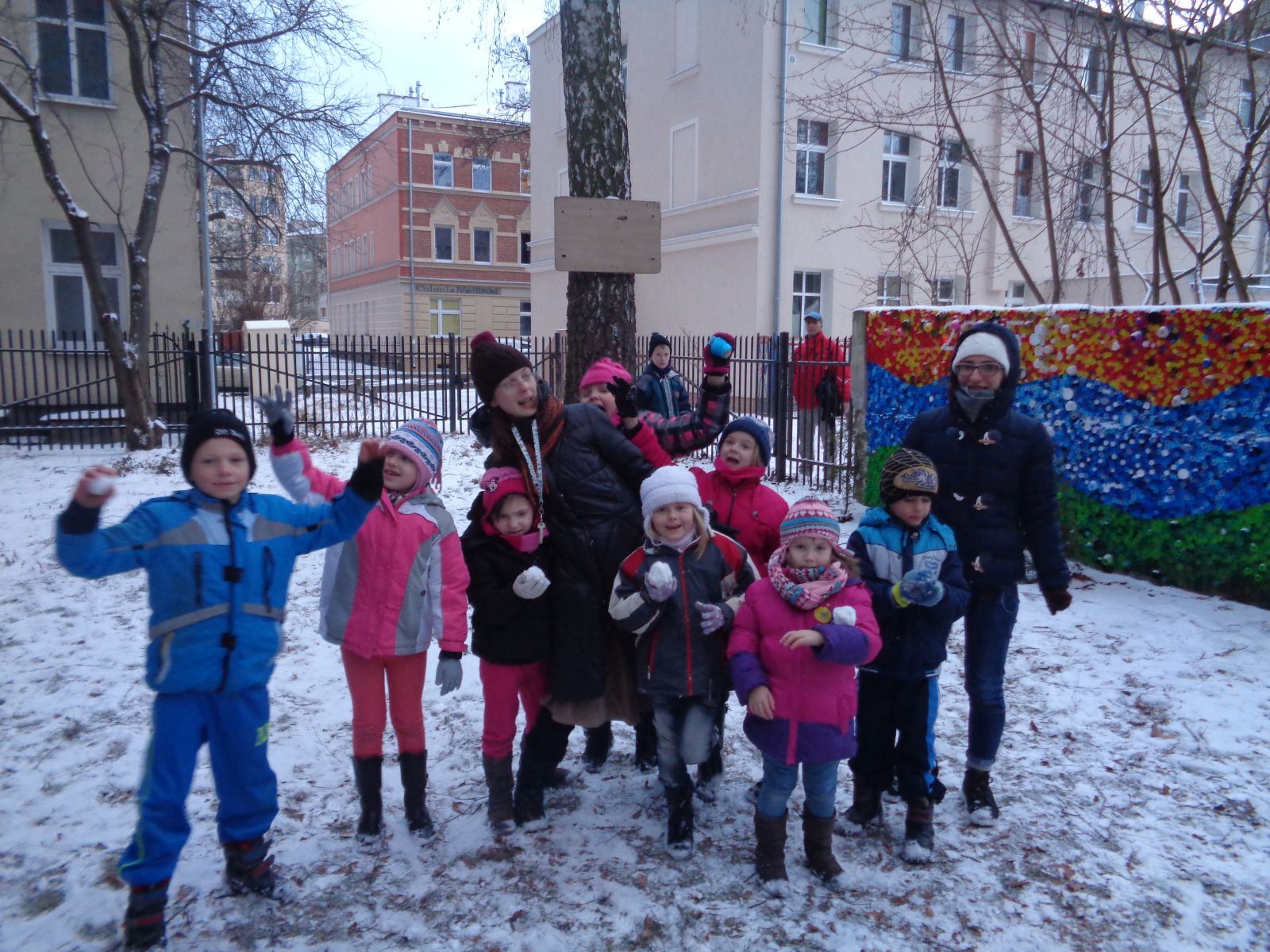 Dzieci z „Anielskiej Krainy” korzystając z zimowych uroków wychodzą od czasu do czasu do naszego ogródka, próbują lepić bałwanki, organizować bitwy na snieżki no i przede wszystkim dotlenić organizmy w ruchu na świeżym powietrzu.