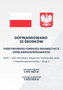 Caritas Archidiecezji Gdańskiej zaprasza osoby niepełnosprawne do udziału w projekcie pn. „SOW-Sieć Ośrodków Wsparcia Caritas dla osób z niepełnosprawnością-etap II”, współfinansowanego ze środków Państwowego Funduszu Rehabilitacji Osób Niepełnosprawnych. Okres realizacji projektu: od dnia 01 kwietnia 2022 r. do dnia 31 marca 2025 r.