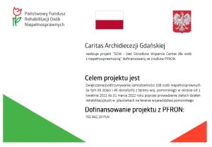 Caritas Archidiecezji Gdańskiej zaprasza osoby niepełnosprawne do udziału w projekcie pn. „SOW-Sieć Ośrodków Wsparcia Caritas dla osób z niepełnosprawnością”, współfinansowanego ze środków Państwowego Funduszu Rehabilitacji Osób Niepełnosprawnych. Okres realizacji projektu: od dnia 01 kwietnia 2019 r. do dnia 31 marca 2022 r.