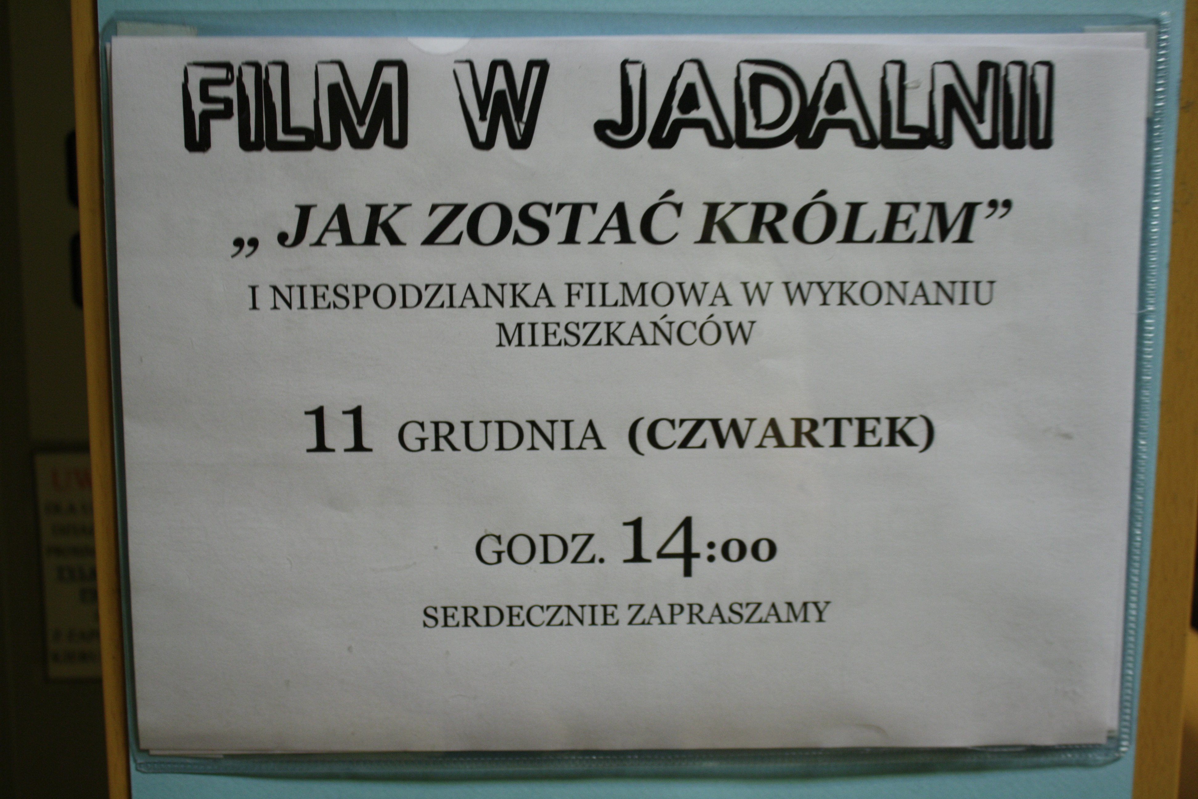 W czwartek po obiedzie jadalnia była wciąż zapełniona. Zgromadzeni seniorzy i wolontariusze czekali na kolejne wydarzenie zorganizowane ze środków finansowych pozyskanych z Regionalnego Centrum Wolontariatu w Gdańsku. Na dziś przygotowane było spotkanie z kulturą – przedstawienie z 2011 roku pt.: „ Kroniki wyśnione” oraz film „Jak zostać królem”, którego reżyserem jest Tom Hooper. Przedstawienie „Kroniki wyśnione”- w wykonaniu podopiecznych naszego Centrum, w rolach głównych wystąpili: Elżbieta Hoppe, Janina Żurawska, Stefan Chrzanowski i Jan Brejza. ”Jak zostać królem” – fascynująca opowieść o człowieku, który uratował królestwo i w przełomowym momencie historii mężnie poprowadził Anglików w walce przeciwko najeźdźcy. Po śmierci króla Jerzego V i szokującej abdykacji Edwarda VIII, książę Albert musi, pomimo wielkich oporów, objąć tron Anglii jako Jerzy VI. Ogromną przeszkodą w wypełnianiu monarszych obowiązków jest prześladujące go od najmłodszych lat…jąkanie. Oddana mężowi królowa Elżbieta (Helena Bonham Carter) dokłada wszelkich starań, aby pomóc mu pozbyć się zawstydzającej przypadłości. Jedyną osobą, która może tego dokonać, okazuje się australijski specjalista o nieortodoksyjnych metodach pracy nad wymową – Lionel Logue (Goeffrey Rush). Rodzi się przyjaźń, która odmieni życie dwóch niezwykłych ludzi i zadecyduje o losach największej z wojen – z samym sobą i swoimi słabościami. Akcja filmu wciągnęła widzów bez reszty, trzymała w napięciu, pochłaniała całkowicie ich uwagę. Po skończonym seansie nie zabrakło dyskusji i wielu refleksji. Z niecierpliwością czekamy na kolejne spotkanie z kulturą.
