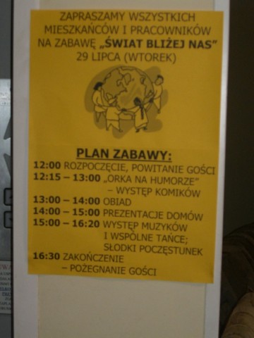 Gościły u nas Domy ze Stegny, Stawisk oraz gdańskich Polanek. W dobry nastrój wszystkich zebranych wprawili Panowie z Agencji Artystyczno – Reklamowej z show Orka na humorze. Pokazano nam m.in. sztuczki, skecze. Poza tym duch został rozradowany poprzez możliwość wykazania swoimi talentami muzyczno — aktorskimi. Domy zgodnie z prośbą i ideą imprezy przygotowały prezentacje związane z różnymi krajami oraz regionami Polski. Zatańczono zorbe, flamenco, zaśpiewano w języku włoskim i angielskim, a także omówiono kulturę Kaszub. Rytmy gitary i akordeonu goszczących muzyków porwały integrujących się uczestników zabawy do tańców i swawoli. Wszelkie punkty imprezy wraz z pysznym poczęstunkiem stanowiły wyśmienitą strawę dla ducha i ciała. Dziękujemy wszystkim gościom za przybycie i wspólną zabawę, a działo się, działo…