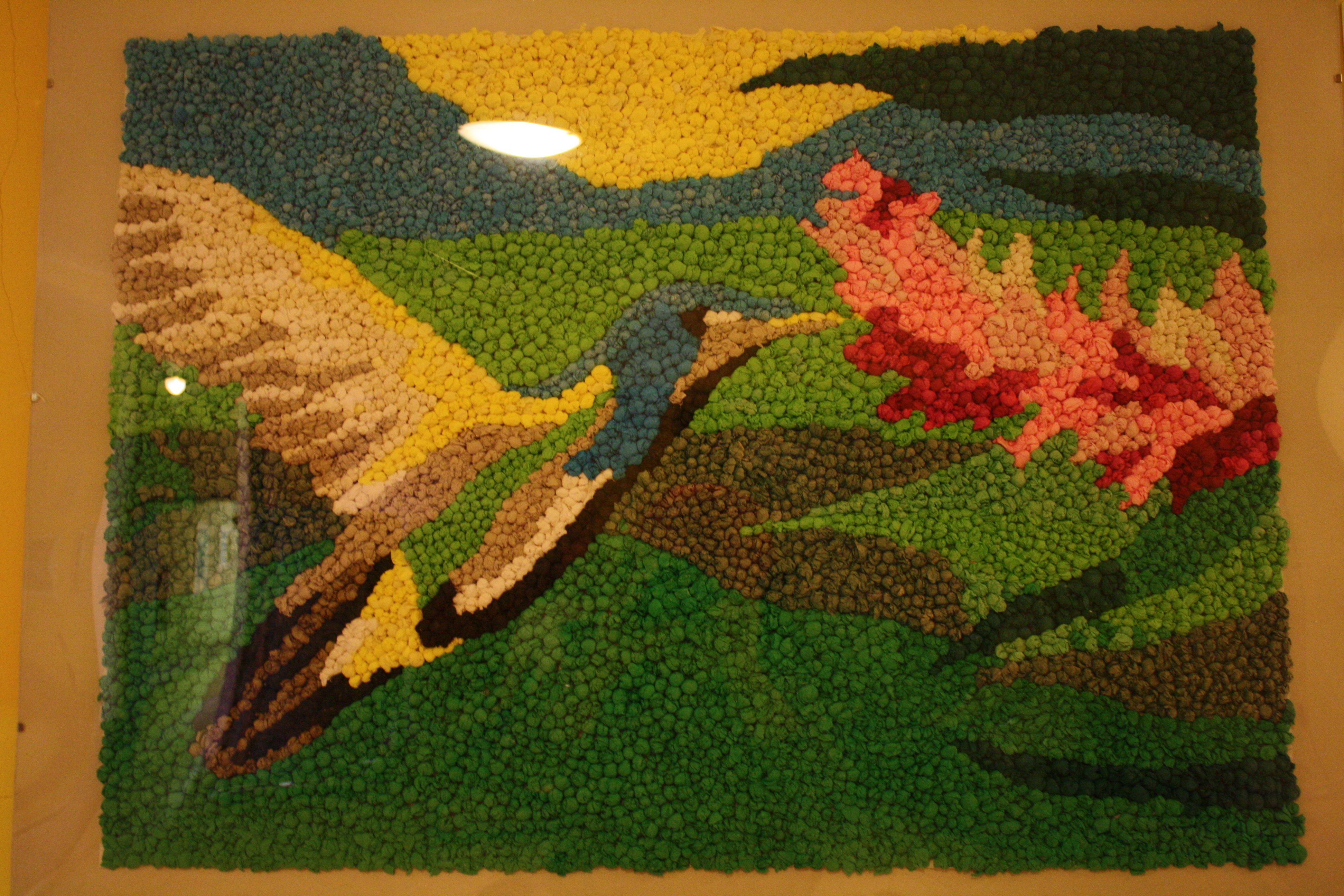 Na korytarzu ( II piętro) możemy oglądać barwną wystawę „Świat z kuleczek składany”. Powstałe prace to 31 gobelinów, wykonanych przez mieszkańców Centrum Pomocowego Caritas im. Jana Pawła II w Gdańsku. To wyjątkowa wystawa, która nie tylko skupia tak liczną ilość prac, ale również zaskakuje pozytywną energią i bogatą paletą kolorystyczną. Prace powstały w pracowni terapii zajęciowej pod okiem terapeutek, które narysowały projekty. Można zobaczyć kolekcję z ptakami, krajobrazy, kwiaty, zwierzęta. Podczas codziennych zajęć terapeutycznych liczna grupa pięciu mieszkańców Domu, przycina krepinę w małe kwadraty, następnie zwija je w kuleczki. Wszystkie prace wyklejała pani Bożena Borkowska, utalentowana mieszkanka, która z wielką pasją i cierpliwością składa barwne kompozycje. Jeden gobelin wykonuje się około miesiąca. Mimo tak żmudnej pracy seniorzy nie wyobrażają sobie dnia bez przyjścia do pracowni i poddania się papierowemu szaleństwu. Dzięki ich zaangażowaniu, moja głowa jest pełna kolejnych pomysłów. Co będzie motywem następnej pracy?…to będzie niespodzianka.
