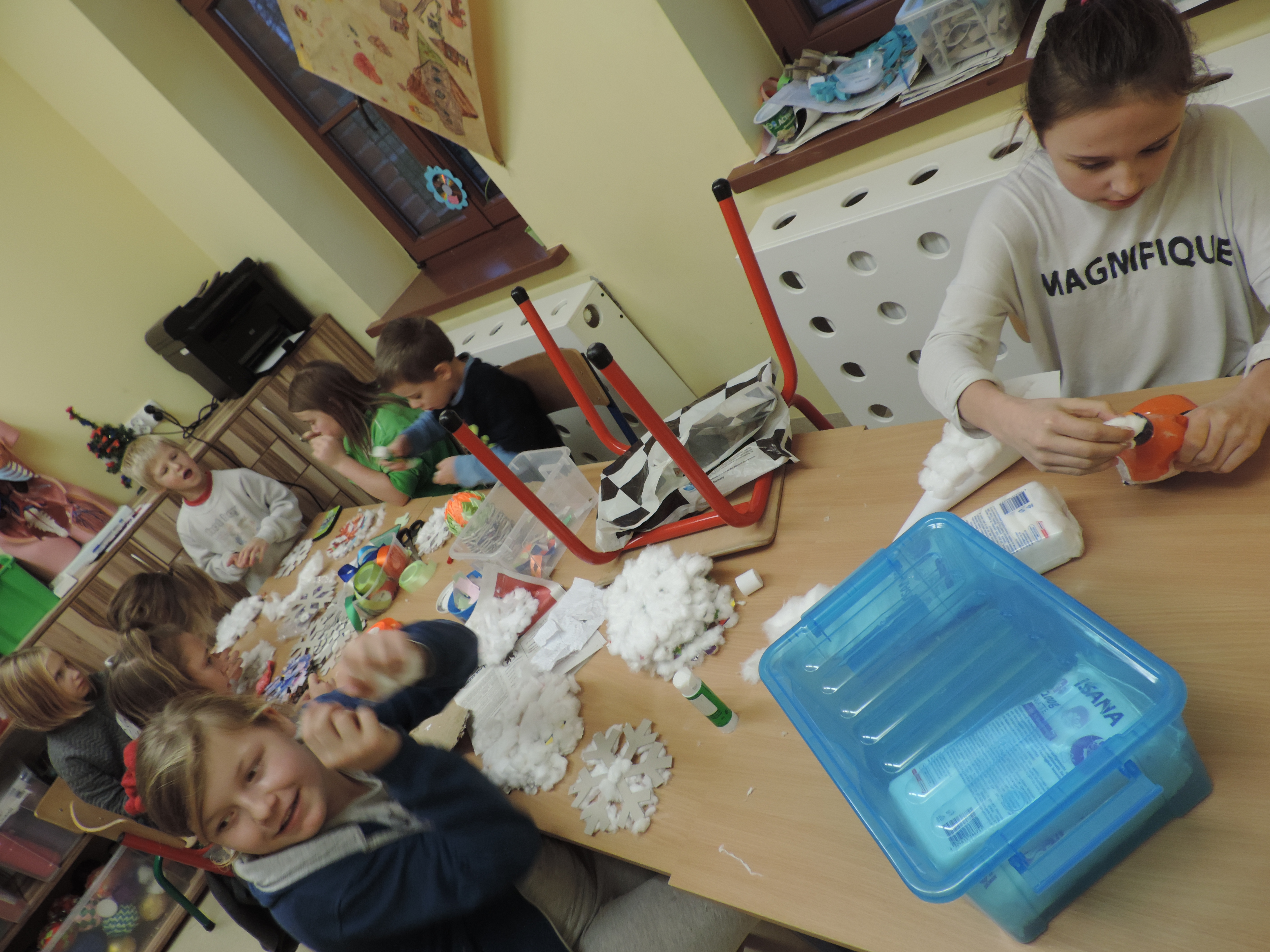 Kolejny dzień z kalendarza wigilijnego i kolejne zadanie: ułożenie figury z naszych ciał. Udało się! Dzisiaj w świetlicy panował zimowo-świąteczny klimat. Choć za oknem śniegu brak, u nas na zajęciach powstały ozdoby w postaci śnieżynek. Opracowywaliśmy też program artystyczny na naszą wigilię. Grunt to współpraca.