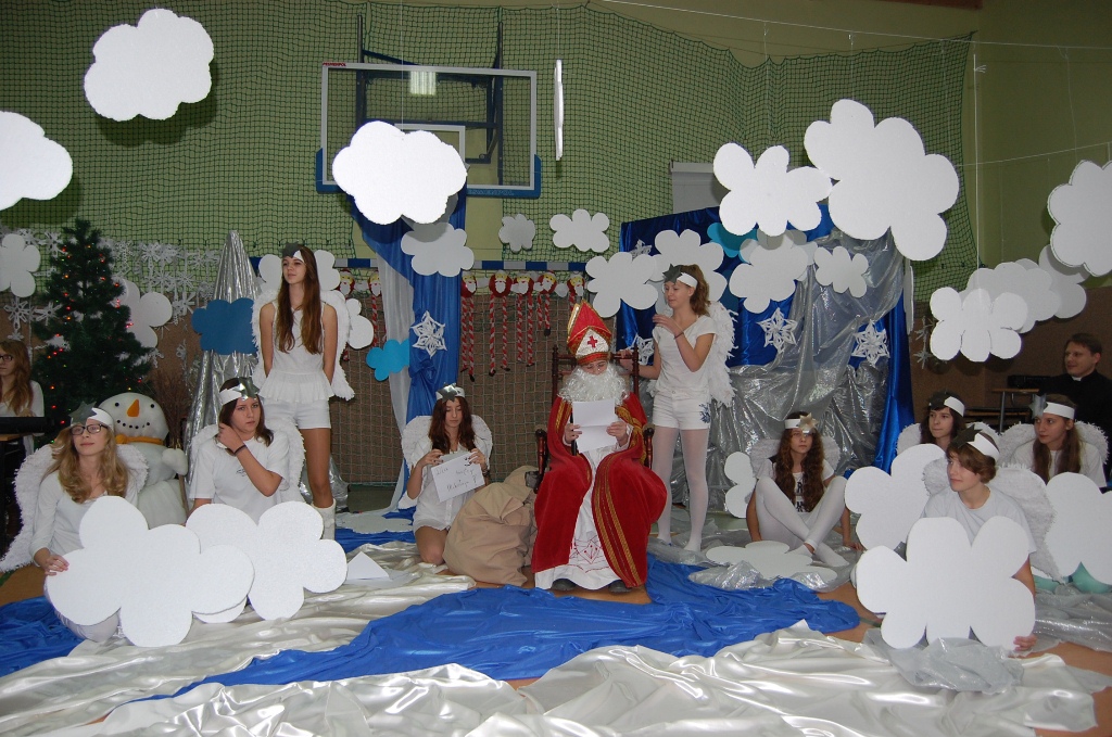 Tegoroczne spotkanie uświetnili występami wolontariusze ze Szkolnego Koła Caritas z Gimnazjum nr 1 w Rumi. Żeby wprowadzić nas w klimat świąt przygotowali krótkie, ale wiele mówiące przedstawienie o Świętym Mikołaju. W stworzeniu świątecznej atmosfery pomogły również piękne dekoracje przygotowane przez młodzież z gimnazjum i dzieci ze świetlicy w Skrzeszewie. Po występie młodych aktorów był czas na podsumowanie naszych całorocznych działań i prezentację zdjęć z różnych wydarzeń. Najwięcej emocji wśród wszystkich uczestników wzbudziły konkursy i zabawy świąteczne przygotowane przez naszych gospodarzy – czyli dzieci i wychowawców ze świetlicy w Skrzeszewie. Zadaniem uczestników było zrobienie czapki Mikołaja, zapakowanie prezentu, zrobienie bałwana i rzucanie kulami do celu. Do ostatniego konkursu polegającego na wykonaniu wspólnego łańcucha dzieci zaprosiły też naszych dorosłych gości. Zabawa była super, a wykonany łańcuch okazał dłuższy niż cała sala gimnastyczna.