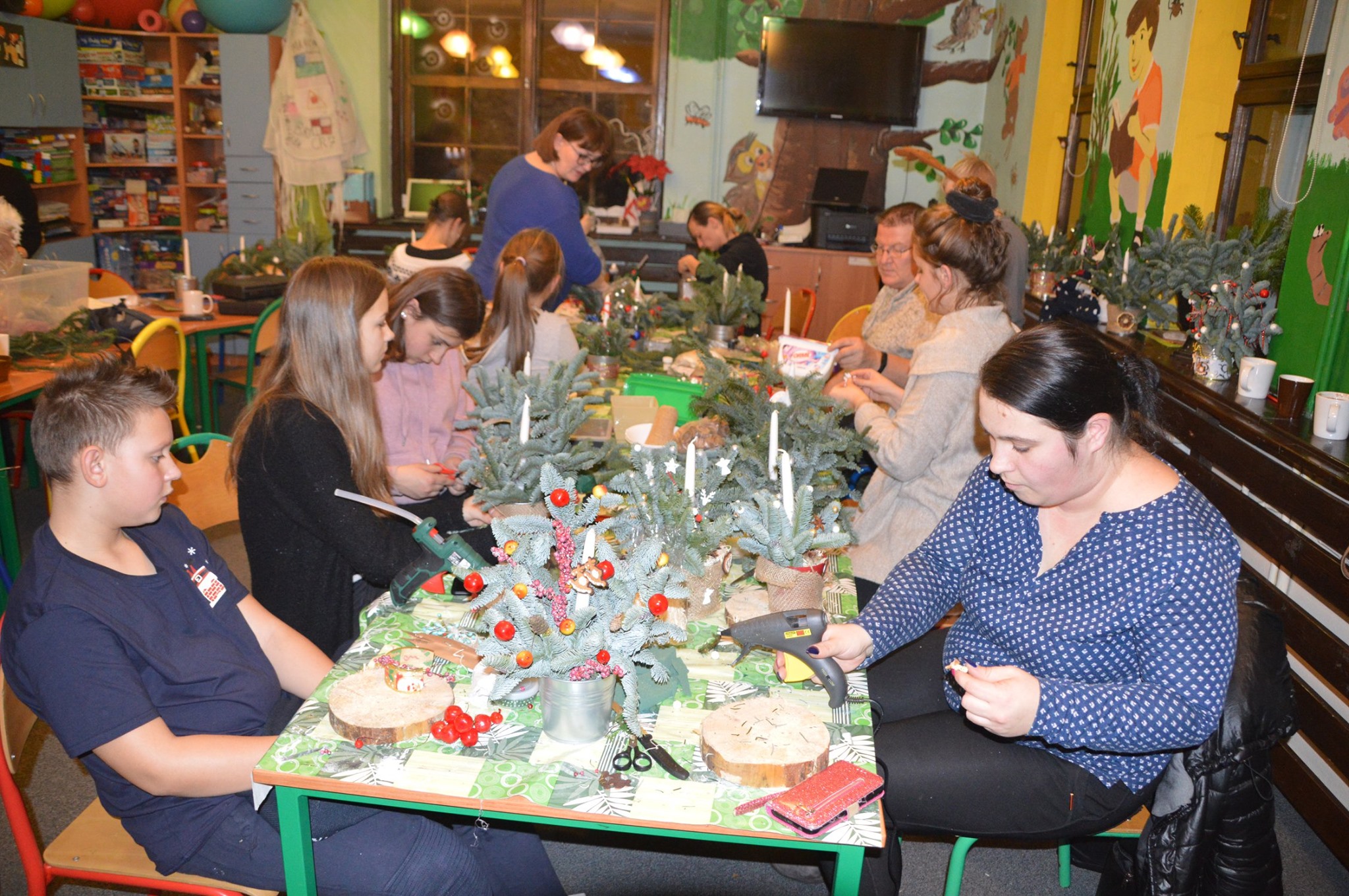 Otóż robiliśmy wspólnie z dziećmi świąteczne stroiki, które następnie zostały przekazane na świąteczny kiermasz. Nie zabrakło nam przy tym kreatywnych pomysłów. Z rąk dzieci powstawały choinki z szyszek, świąteczne stroiki, bombki oraz wieńce.