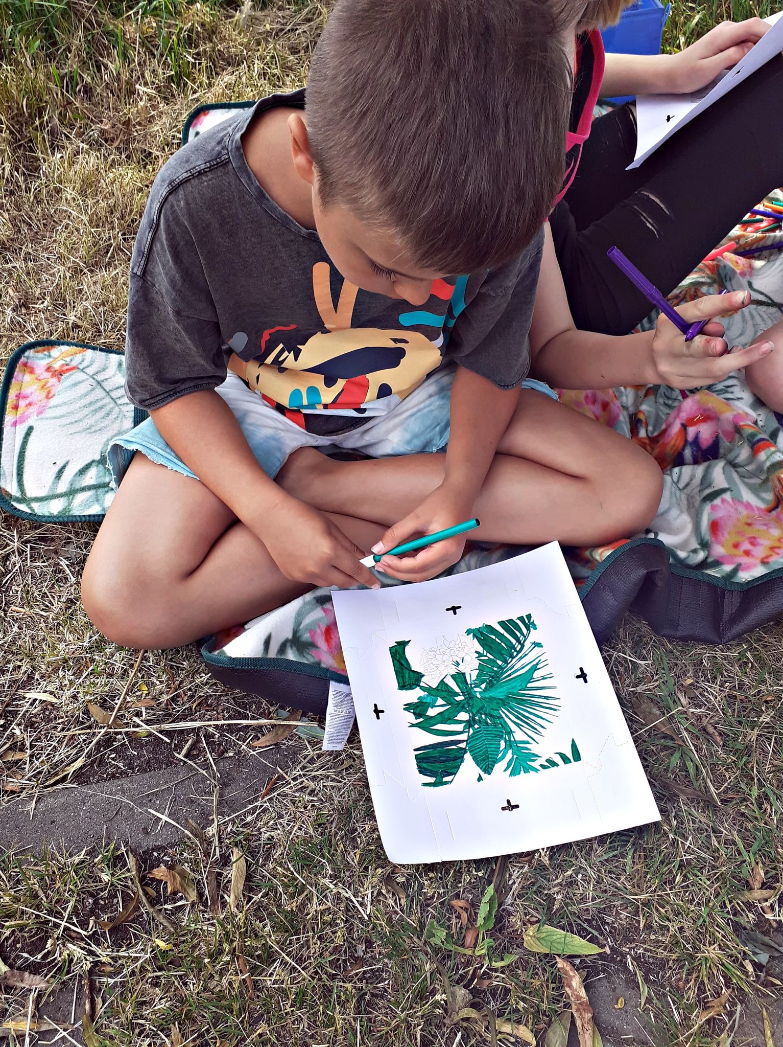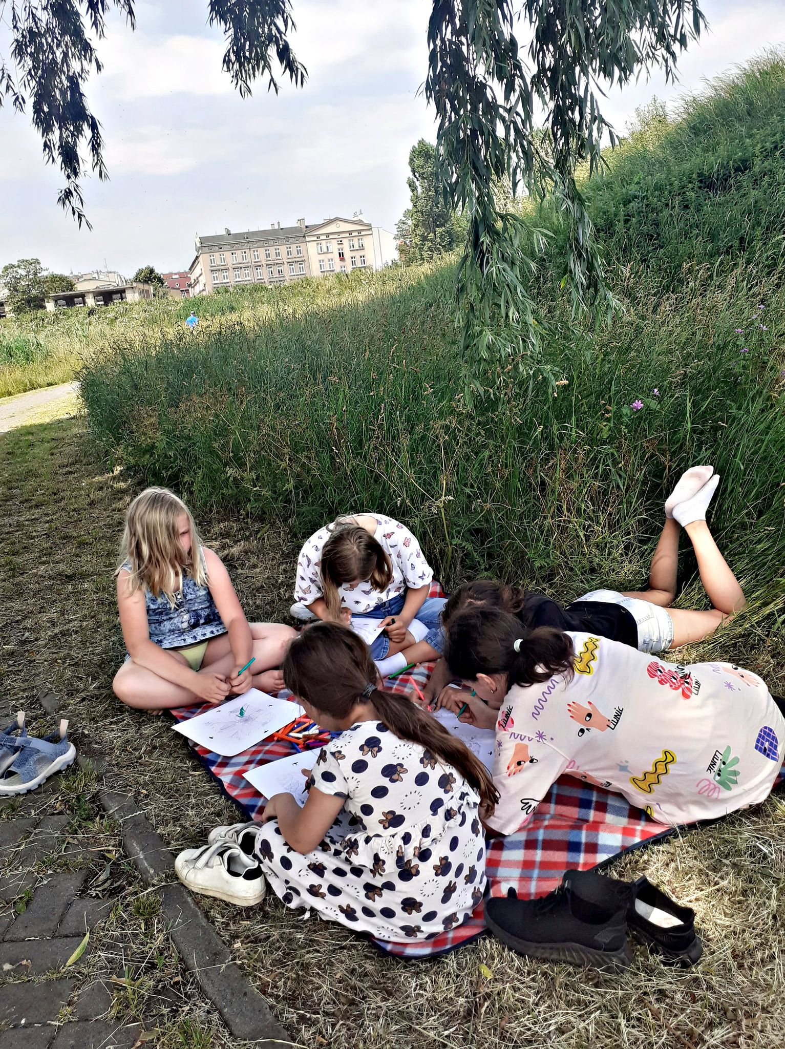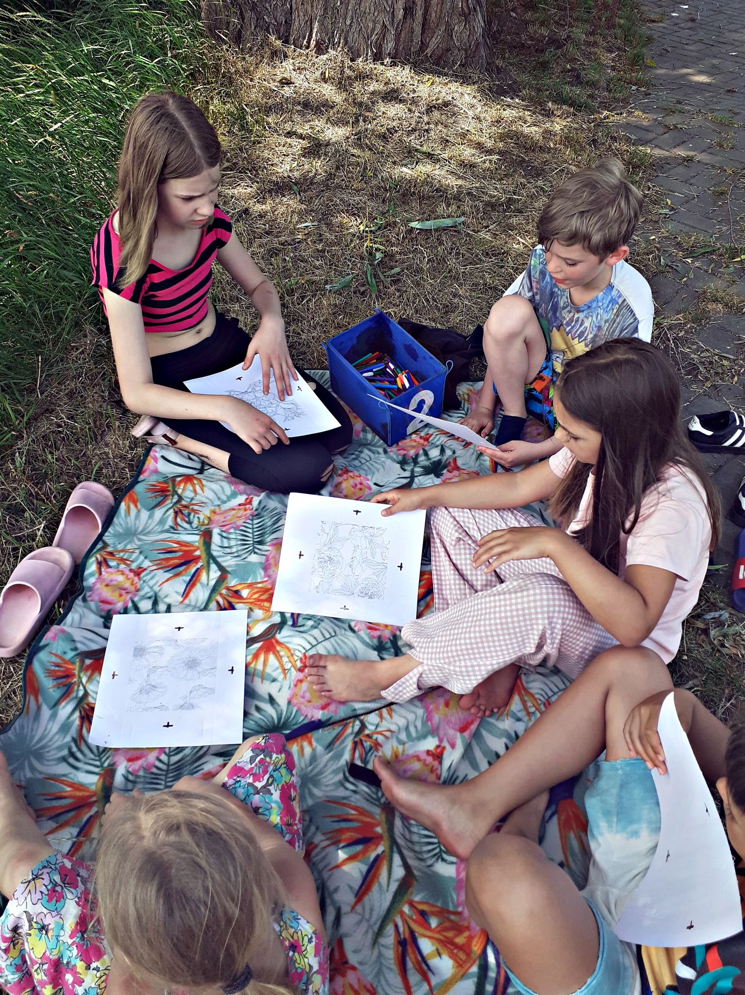 W minionym tygodniu podziwialiśmy uroki naszej pięknej dzielnicy. Wybraliśmy się w teren, gdzie odbyły się zajęcia plastyczne w miłych okolicznościach przyrody. Ciepło, jednak w cieniu drzew pracowało się bardzo przyjemnie. Zrobiliśmy sobie papierowe składanki kanva, które po pokolorowaniu i złożeniu wyglądały jak małe obrazki na płótnie. Wszystkie w motywach roślinnych, co doskonale wpasowuje się w wakacyjny klimat. Podczas wyjścia spotkaliśmy Faustyna – naszego dawnego psa terapeutę. To było na prawdę miłe spotkanie i cały dzień.