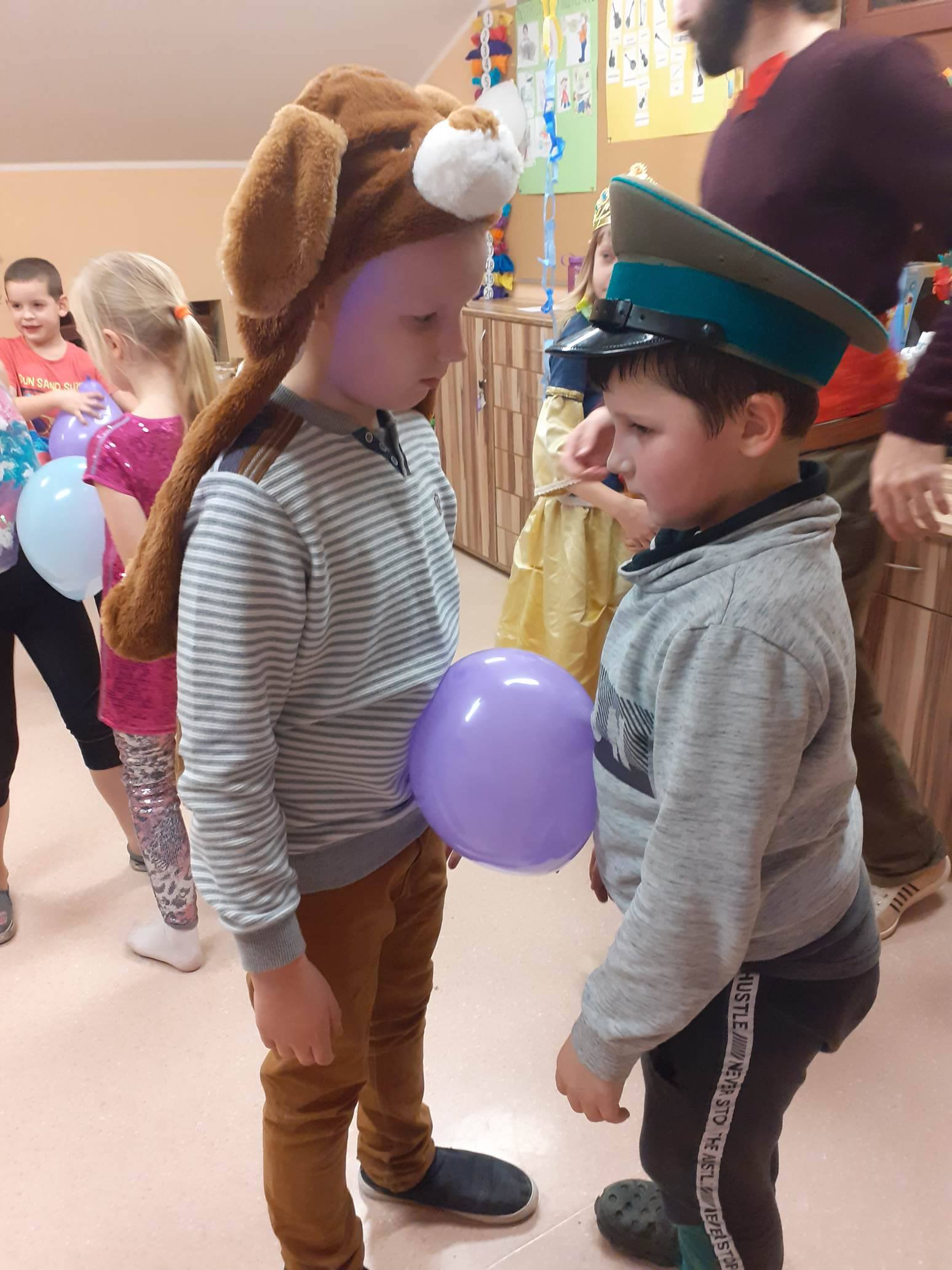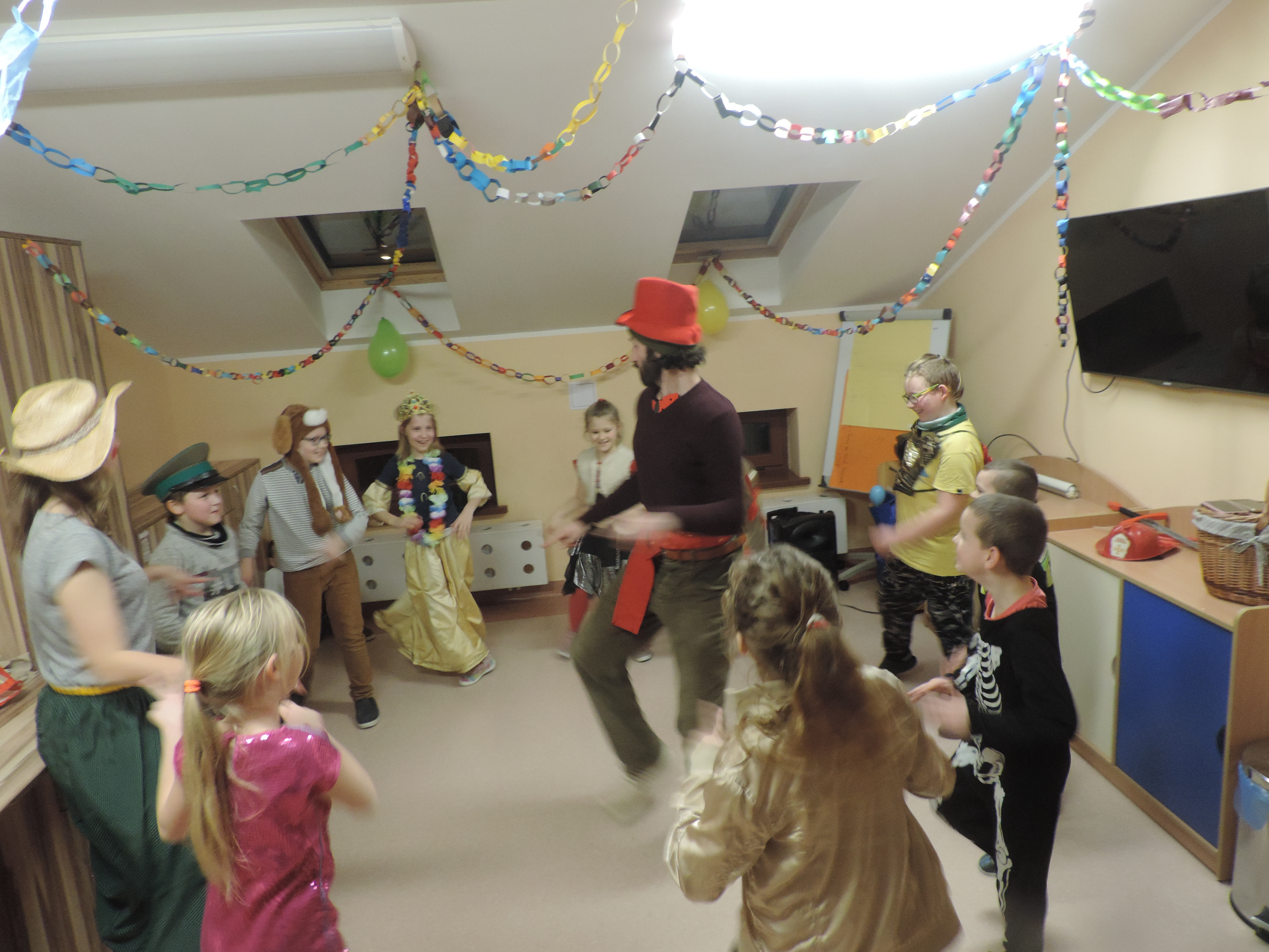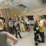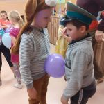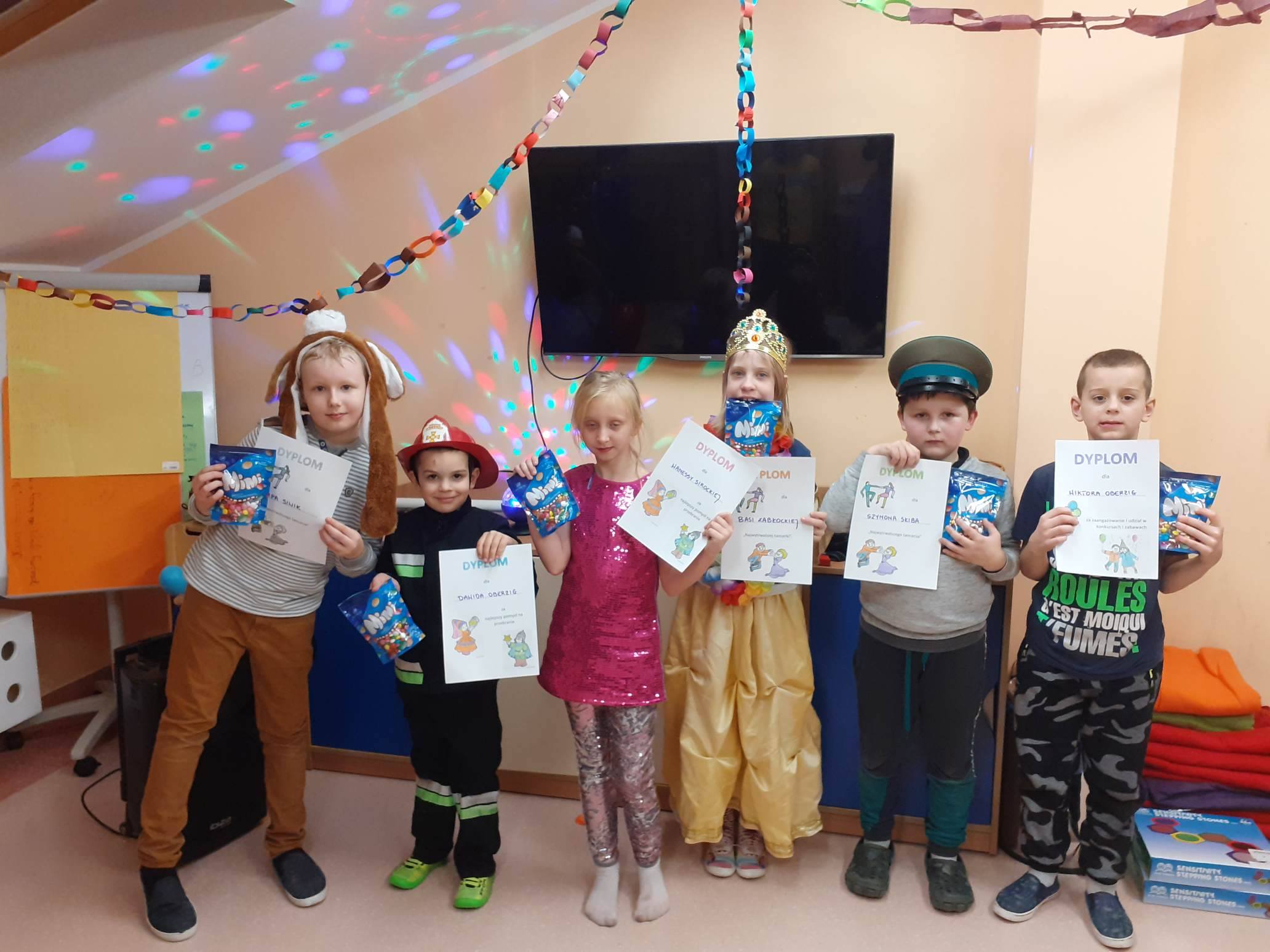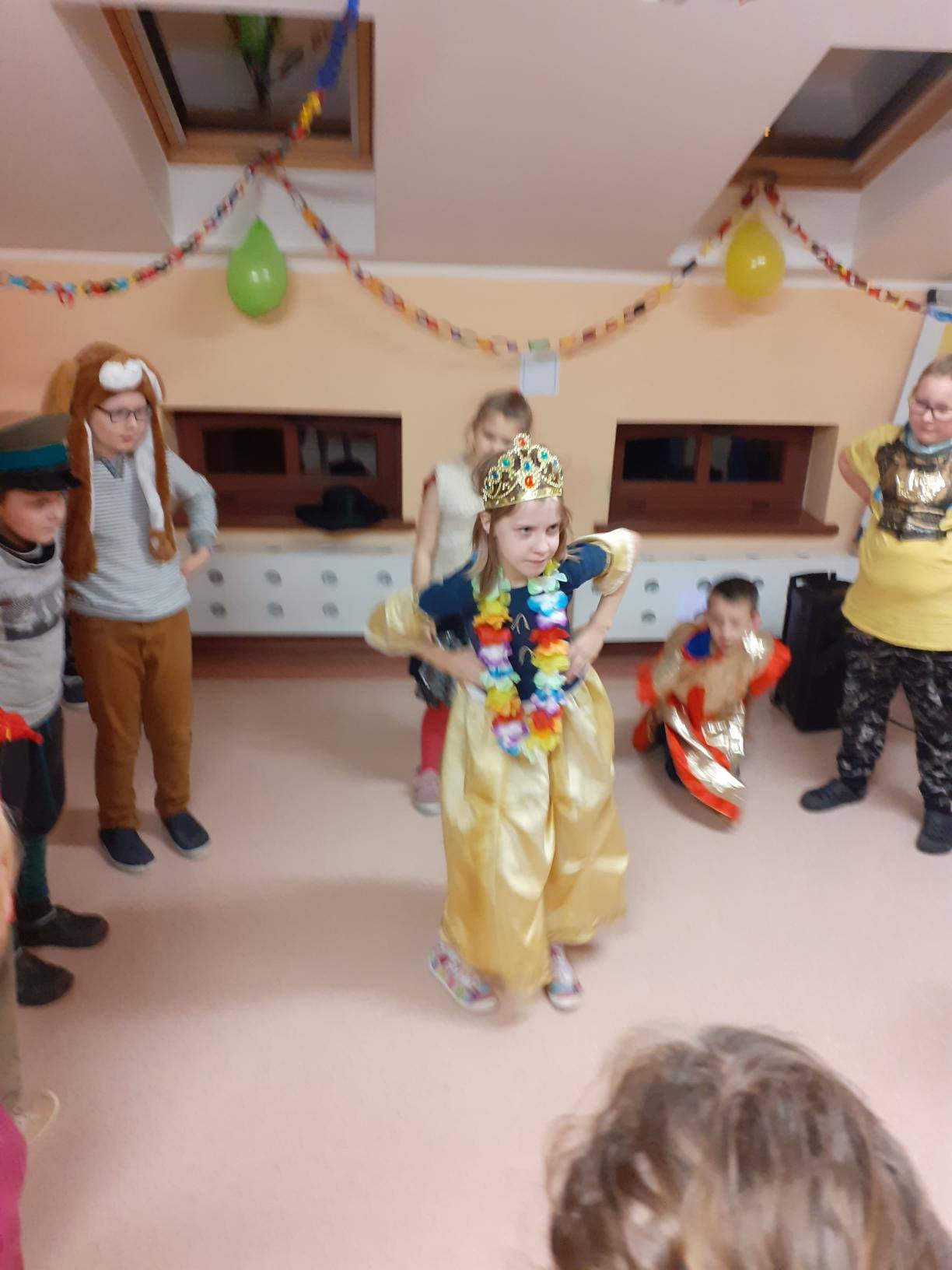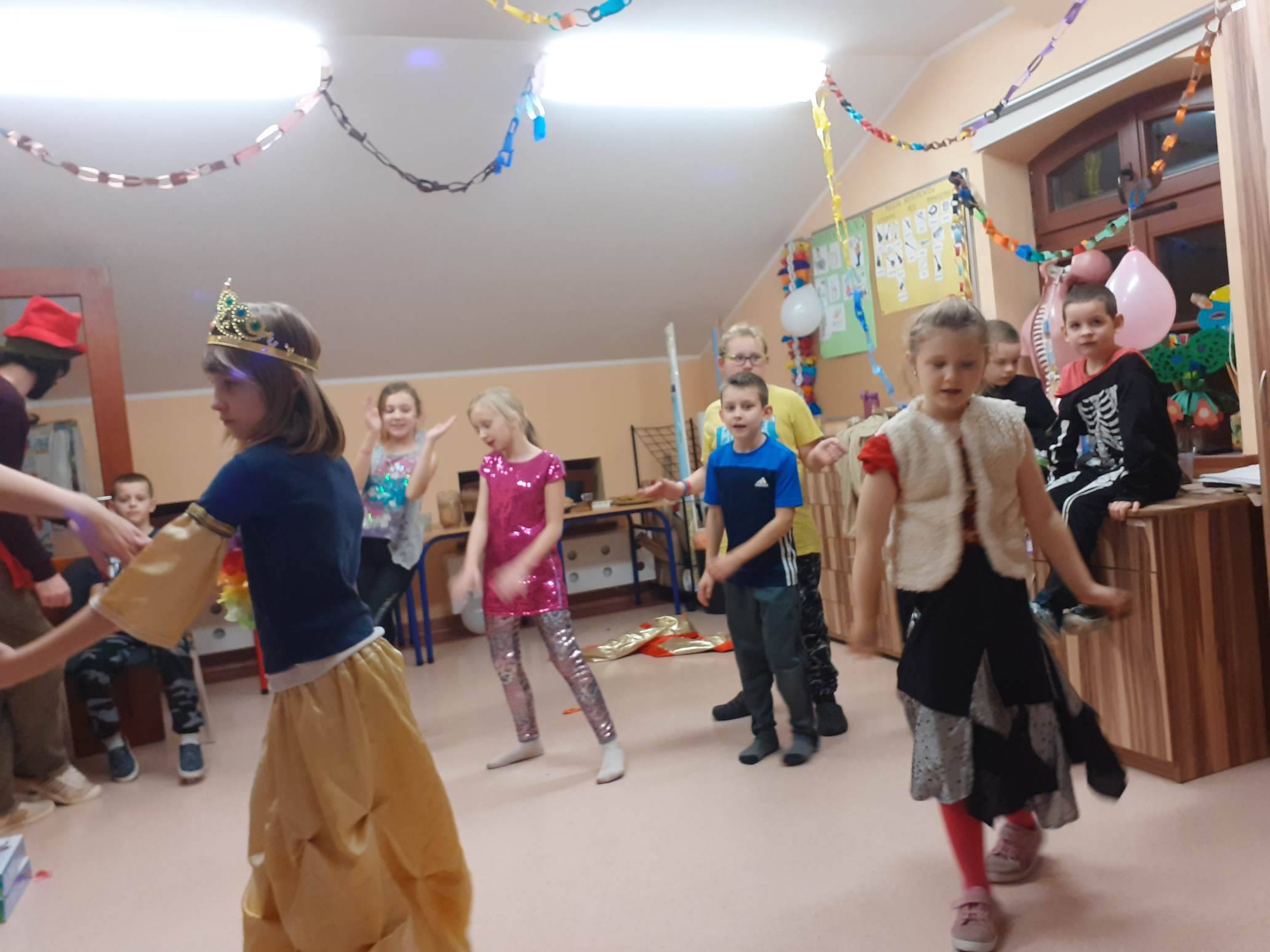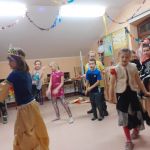 Ale w piątek dużo się u nas działo! Byli żołnierze, księżniczki, tancerki disco polo, strażak, szkielet, rycerz, piesek. Było barwnie i kolorowo. Zaczęło się od rozgrzewki w tanecznym rytmie. A później już trudno było nas przegonić z parkietu. Zabawa w krzesełka, taniec w parach z balonem. zabawa „ludzie do ludzi”, tańce do piosenek „Chocolate”, „Makarena”, „Baby shark”, „Jedzie pociąg z daleka”. To tylko niektóre z niespodzianek, które na nas czekały. Koniec balu był smutnym momentem, ale osłodziły nam go trochę nagrody przyznane za najlepsze przebrania, dla króla i królowej parkietu, dla zwycięzców w konkursach.