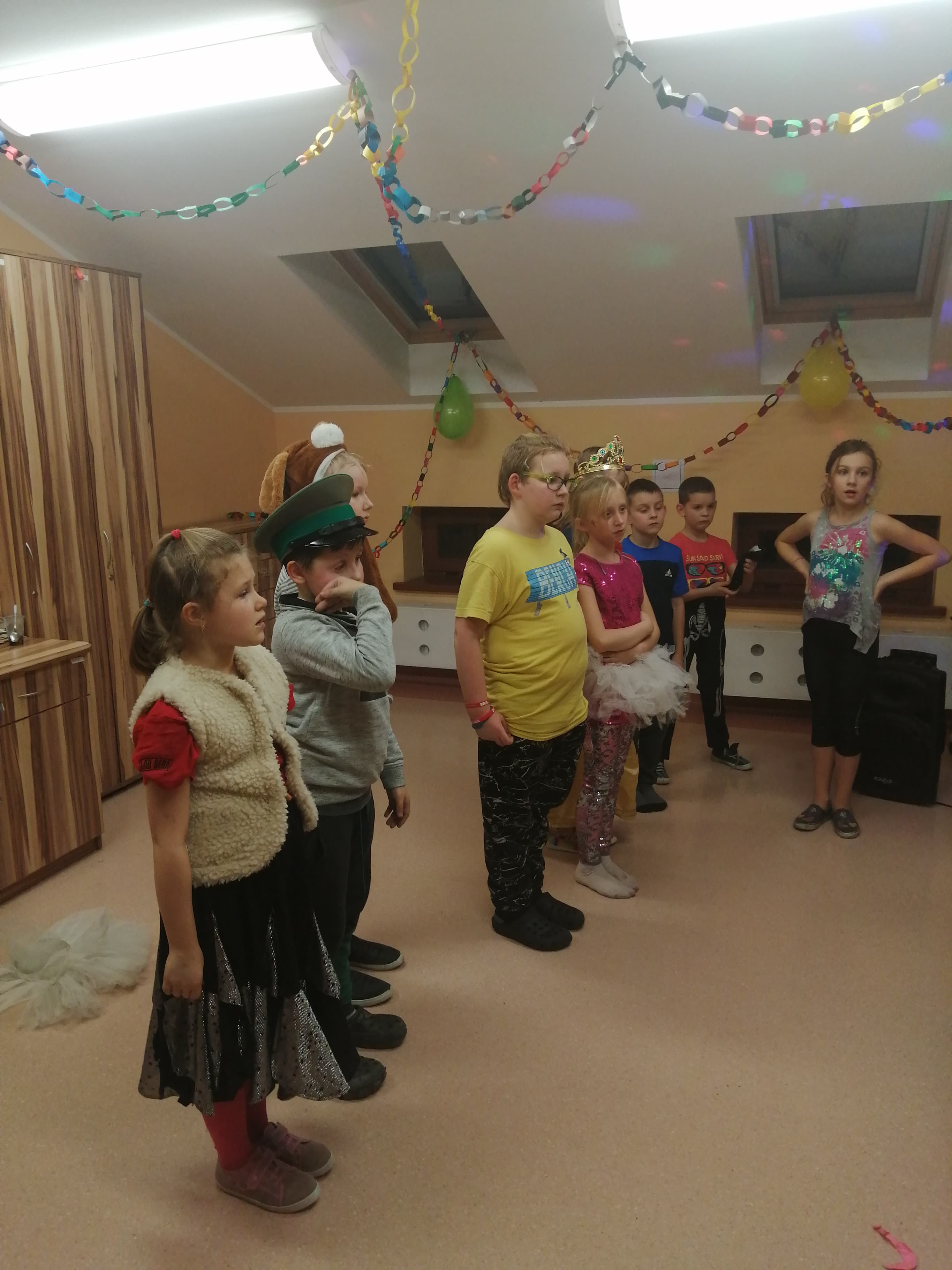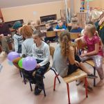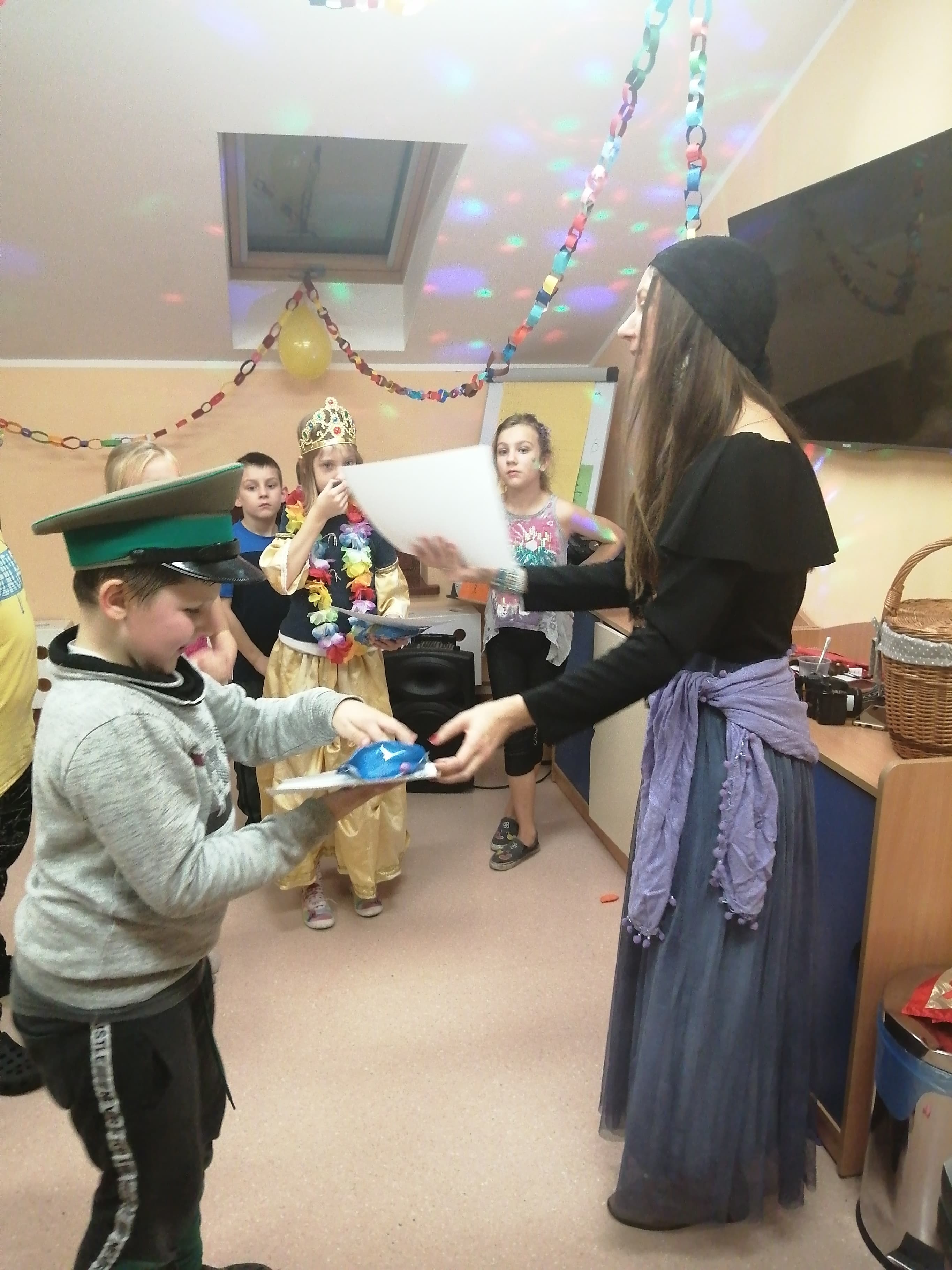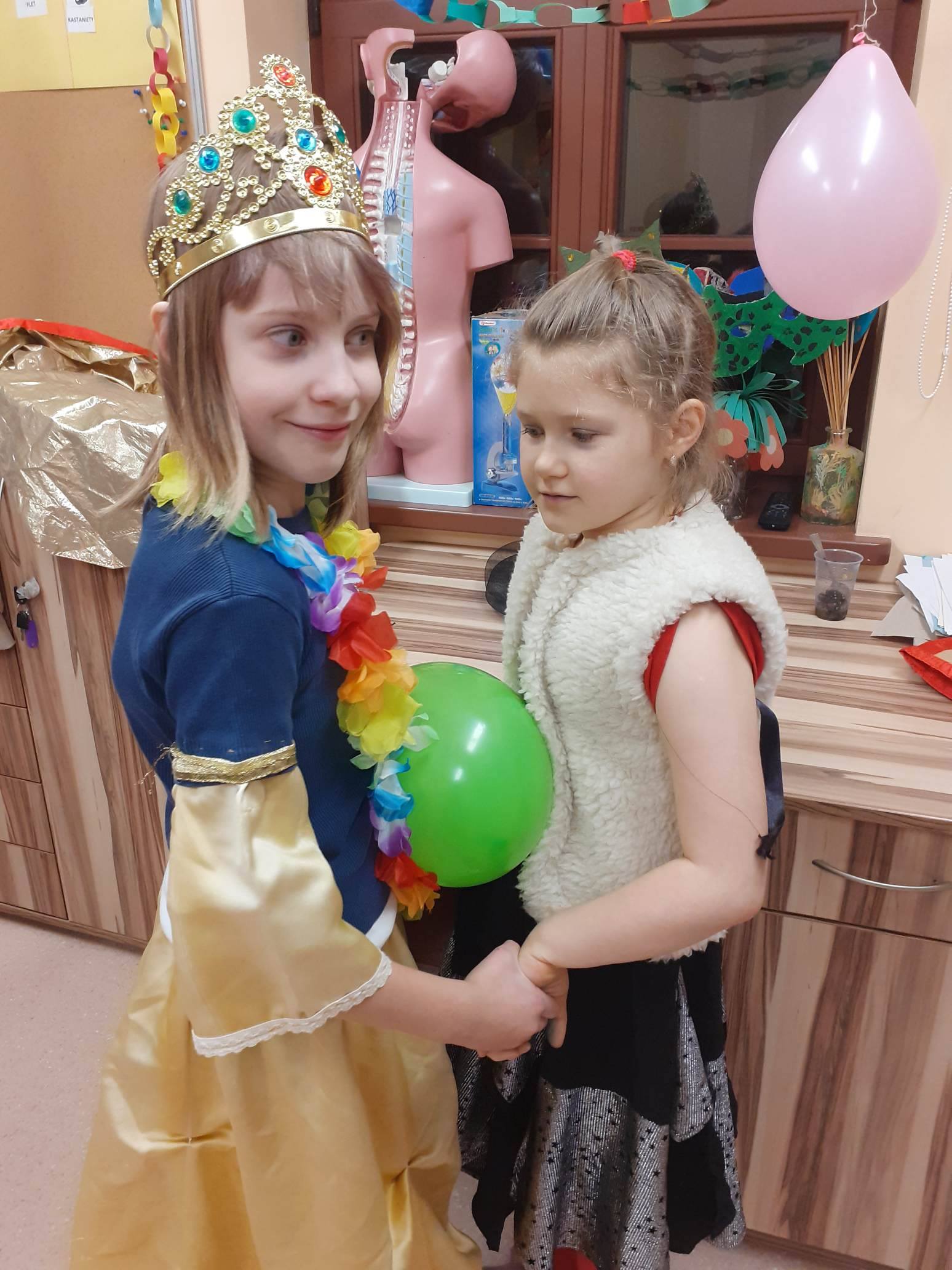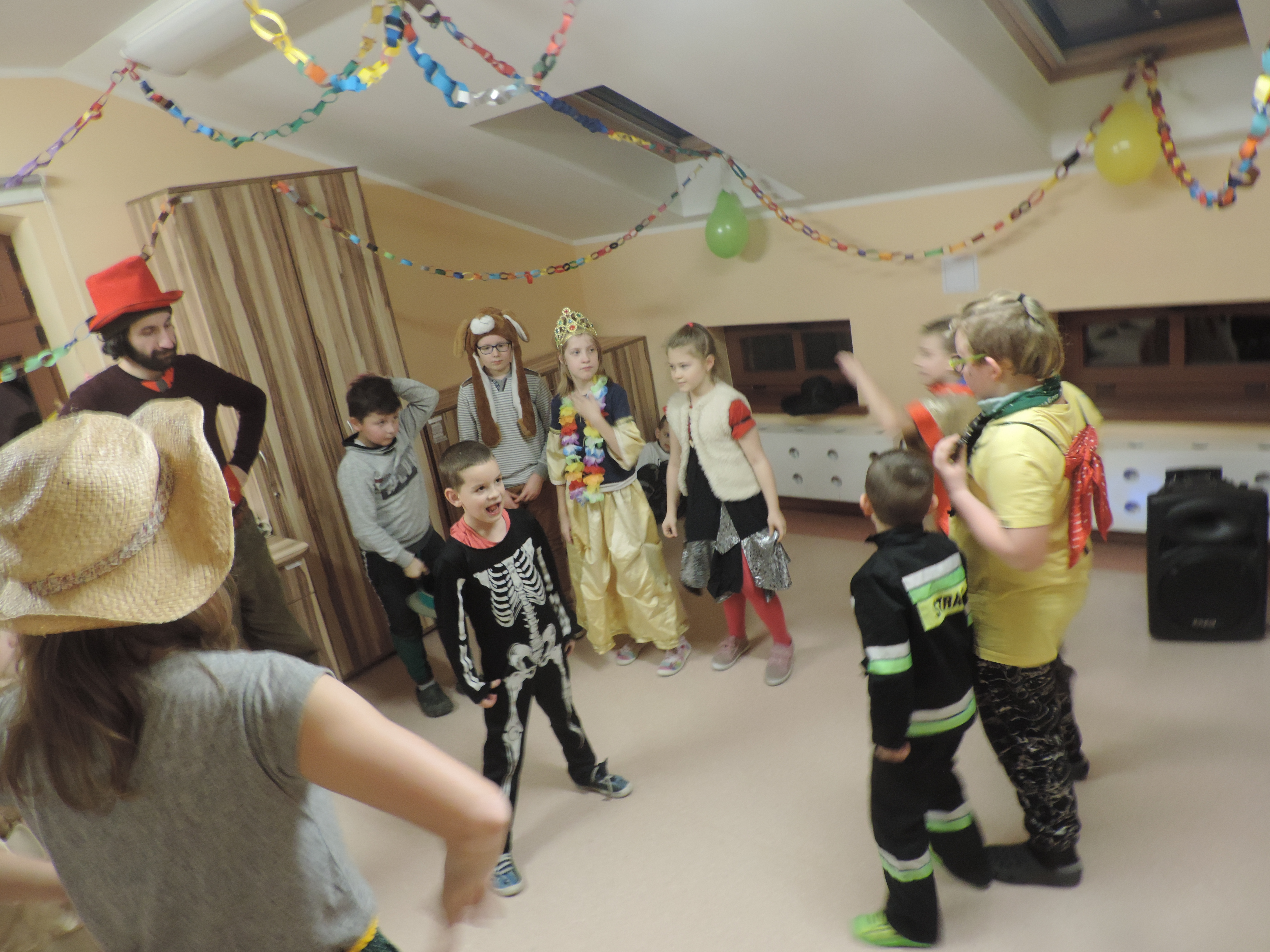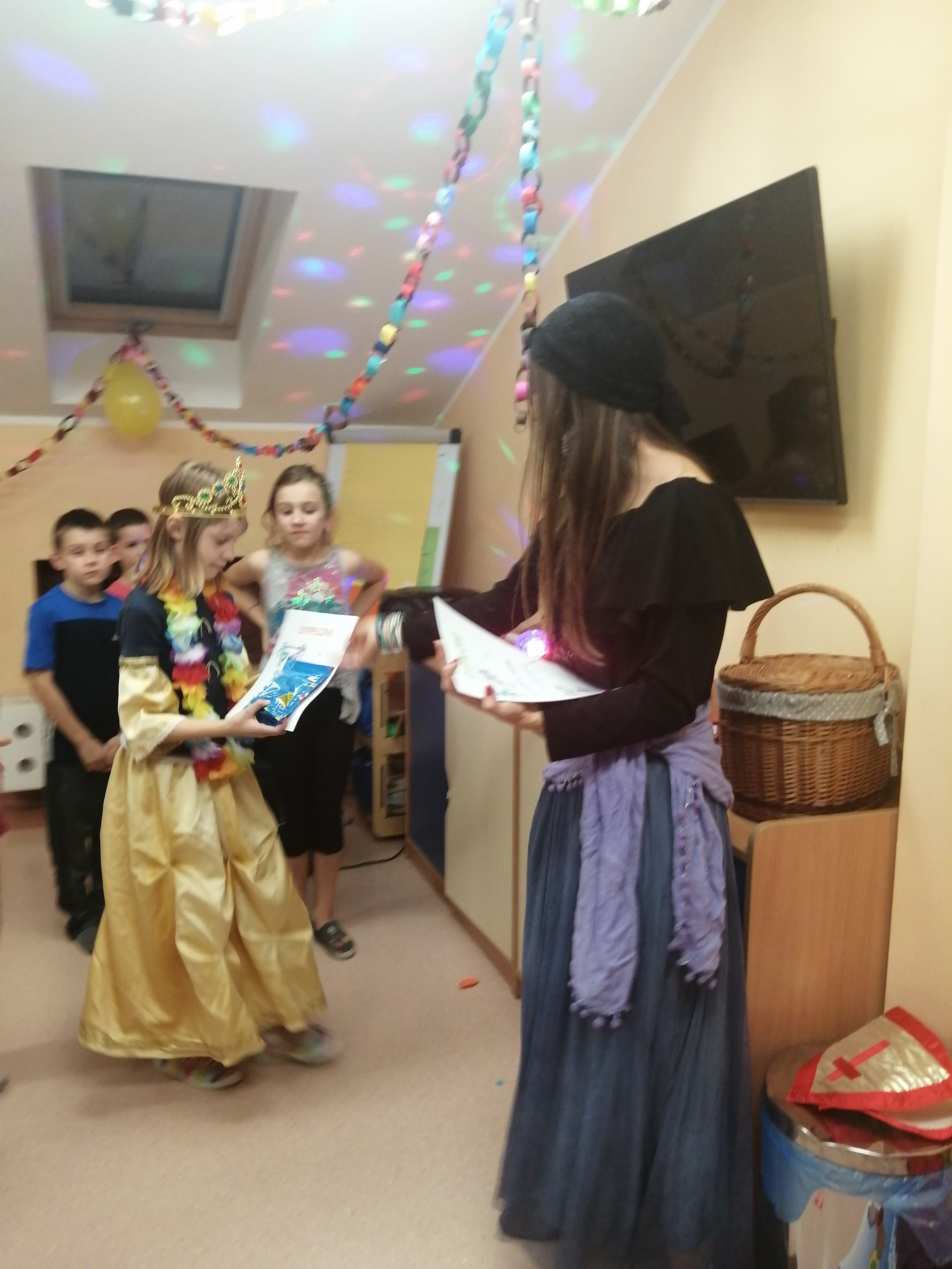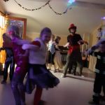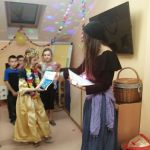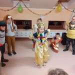 Ale w piątek dużo się u nas działo! Byli żołnierze, księżniczki, tancerki disco polo, strażak, szkielet, rycerz, piesek. Było barwnie i kolorowo. Zaczęło się od rozgrzewki w tanecznym rytmie. A później już trudno było nas przegonić z parkietu. Zabawa w krzesełka, taniec w parach z balonem. zabawa „ludzie do ludzi”, tańce do piosenek „Chocolate”, „Makarena”, „Baby shark”, „Jedzie pociąg z daleka”. To tylko niektóre z niespodzianek, które na nas czekały. Koniec balu był smutnym momentem, ale osłodziły nam go trochę nagrody przyznane za najlepsze przebrania, dla króla i królowej parkietu, dla zwycięzców w konkursach.