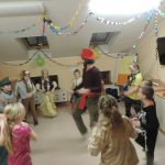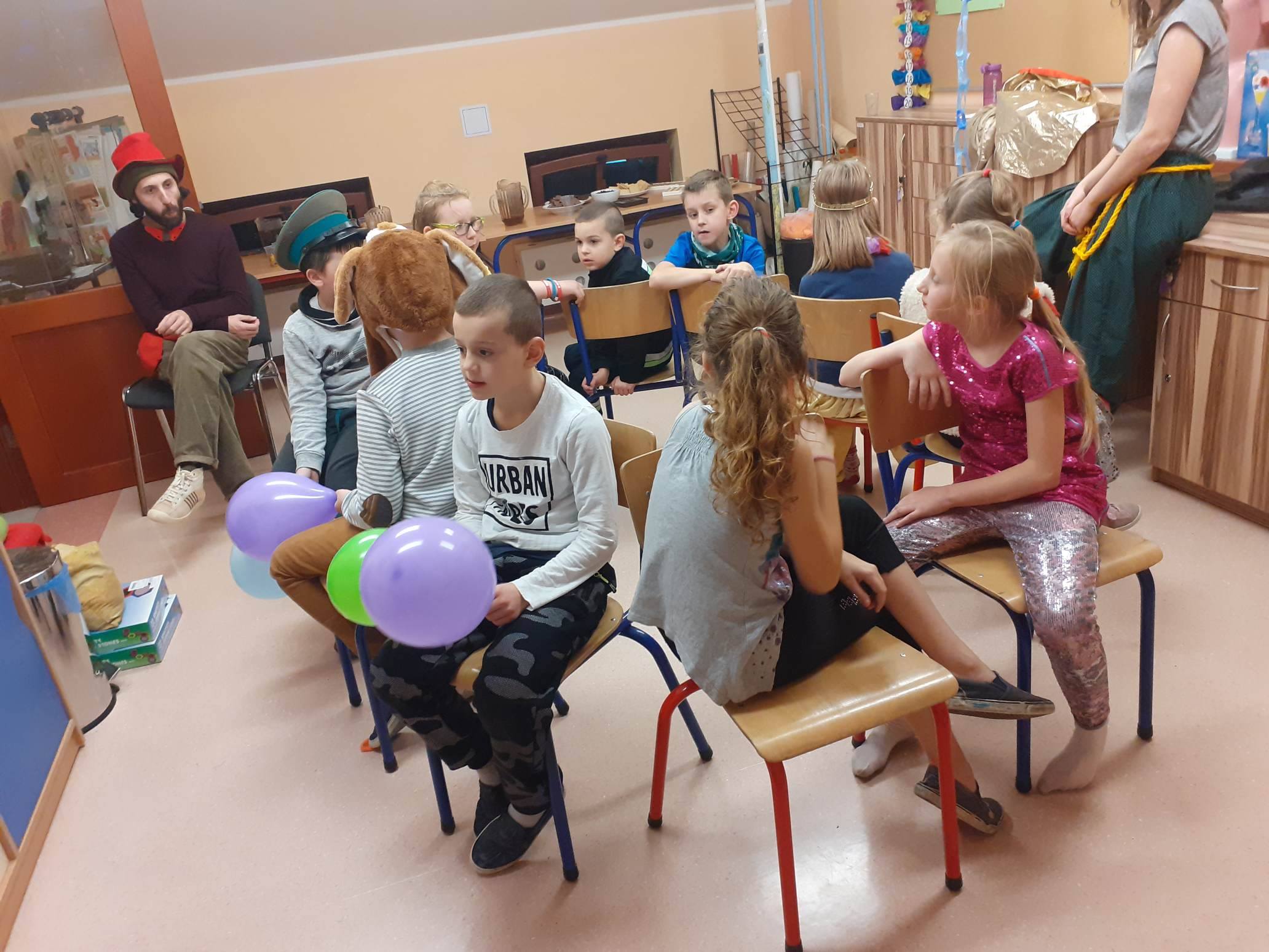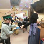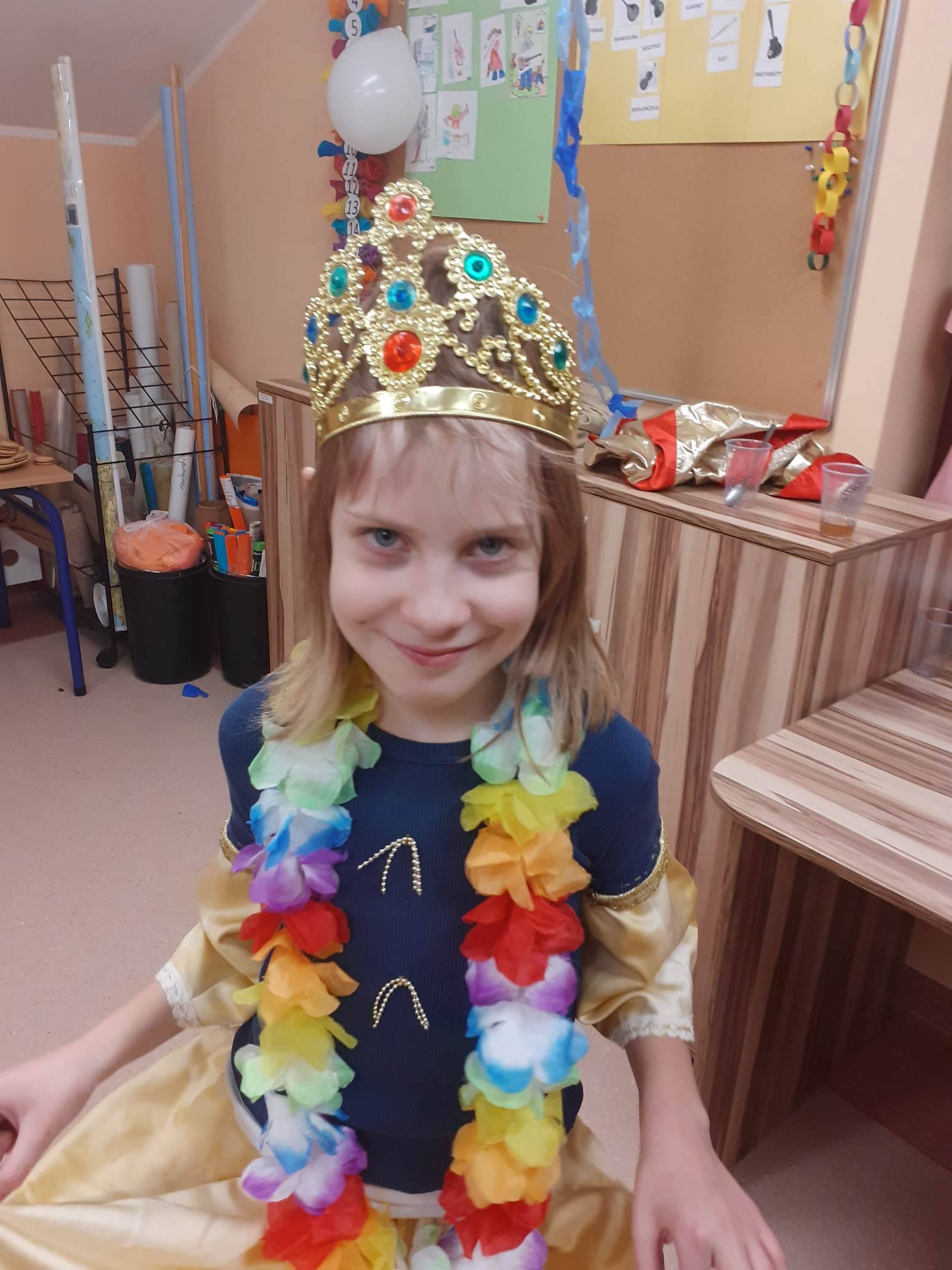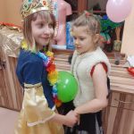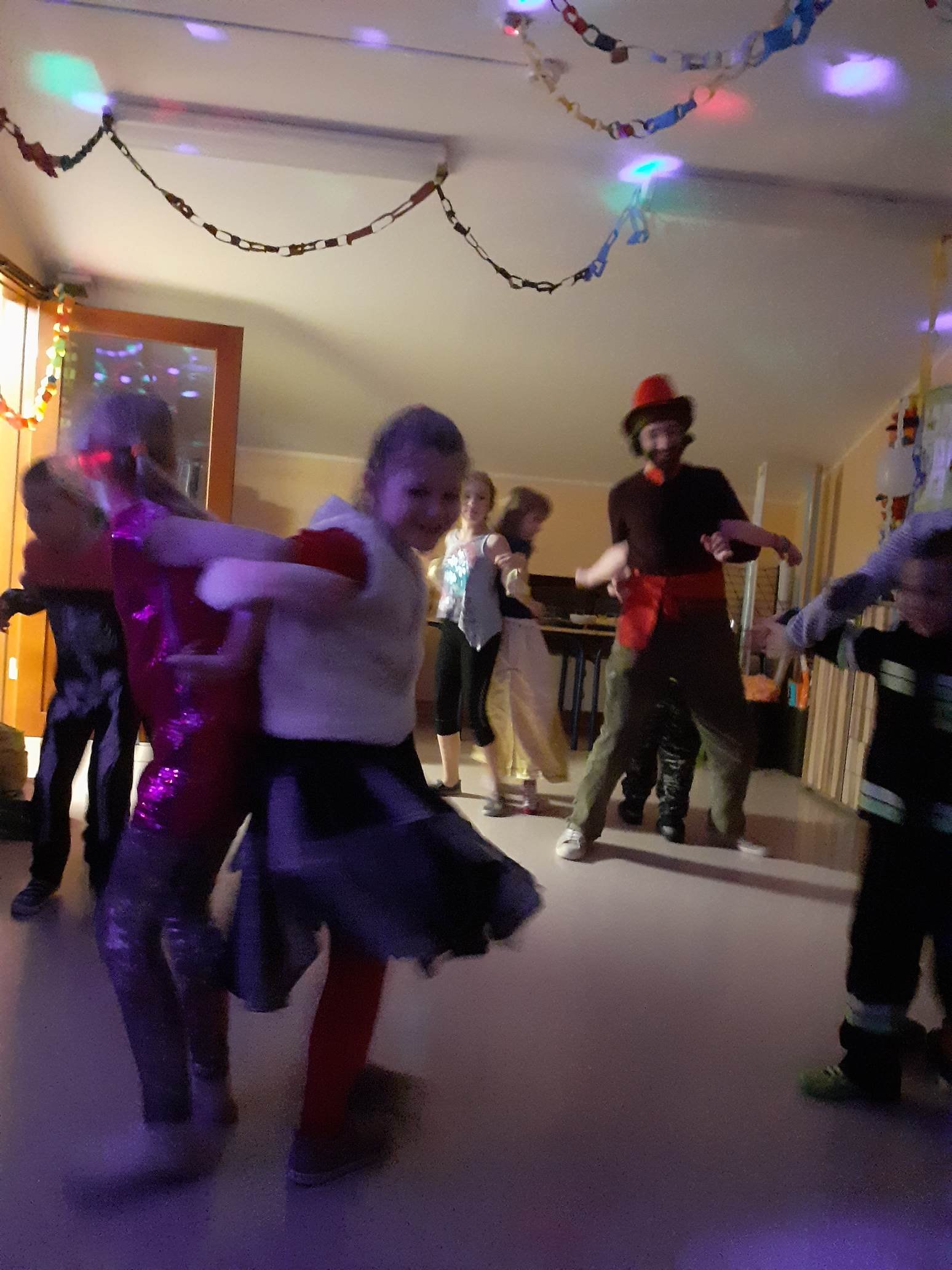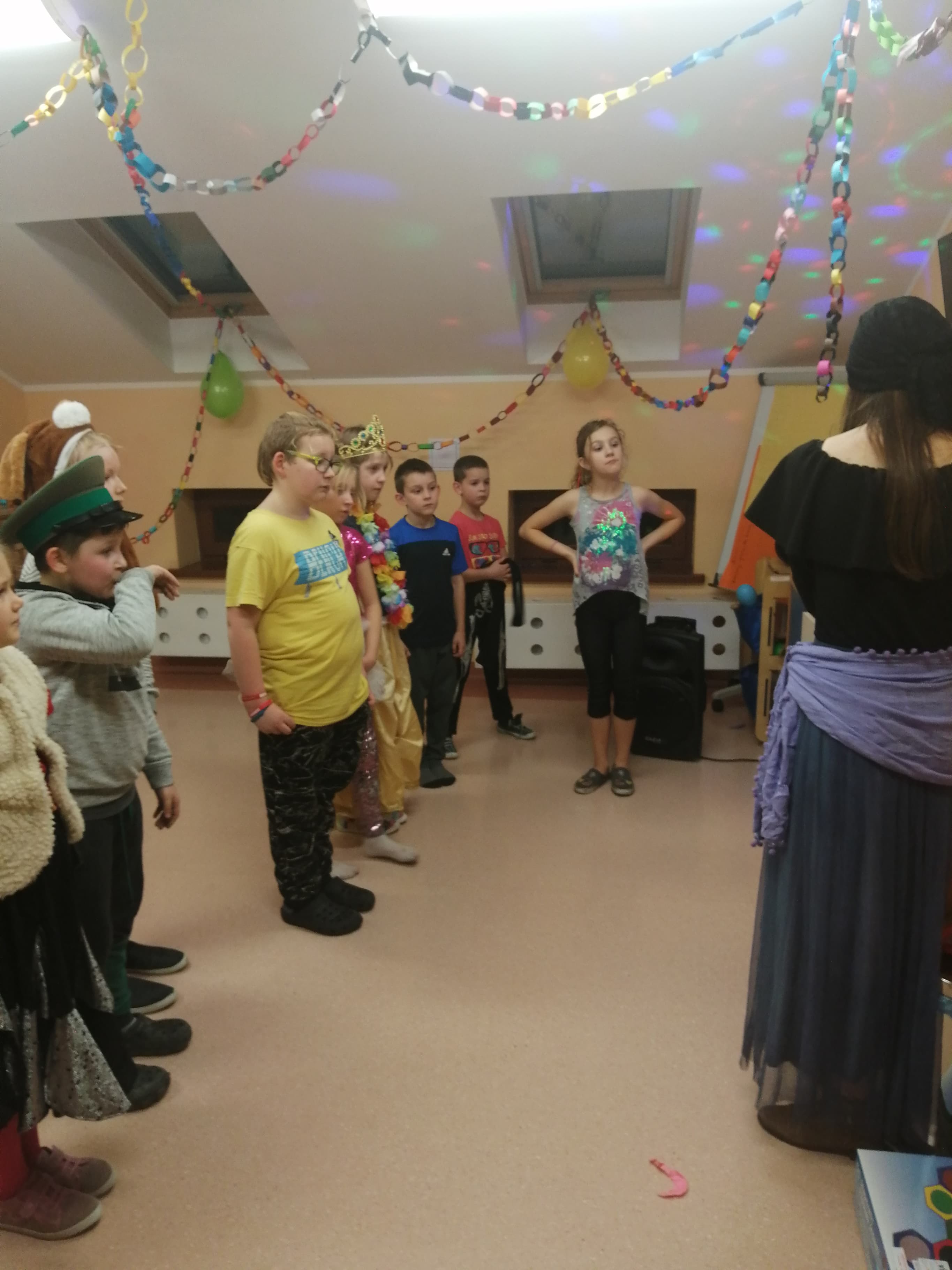 Ale w piątek dużo się u nas działo! Byli żołnierze, księżniczki, tancerki disco polo, strażak, szkielet, rycerz, piesek. Było barwnie i kolorowo. Zaczęło się od rozgrzewki w tanecznym rytmie. A później już trudno było nas przegonić z parkietu. Zabawa w krzesełka, taniec w parach z balonem. zabawa „ludzie do ludzi”, tańce do piosenek „Chocolate”, „Makarena”, „Baby shark”, „Jedzie pociąg z daleka”. To tylko niektóre z niespodzianek, które na nas czekały. Koniec balu był smutnym momentem, ale osłodziły nam go trochę nagrody przyznane za najlepsze przebrania, dla króla i królowej parkietu, dla zwycięzców w konkursach.