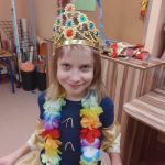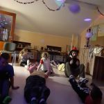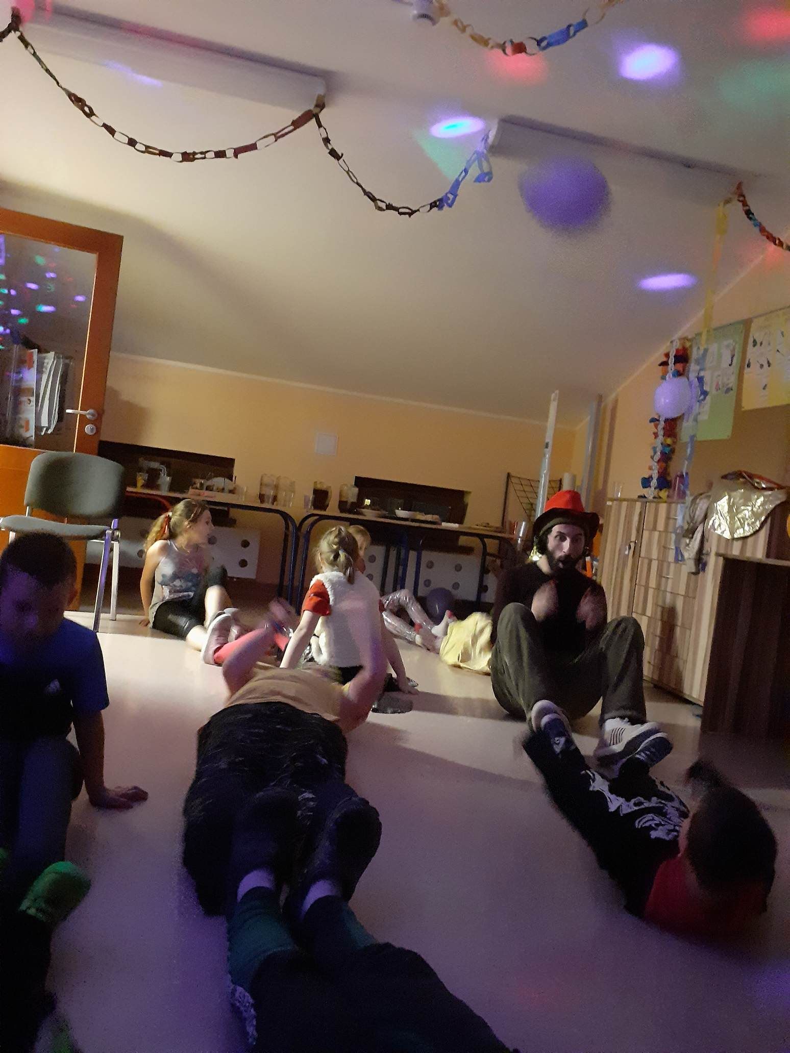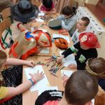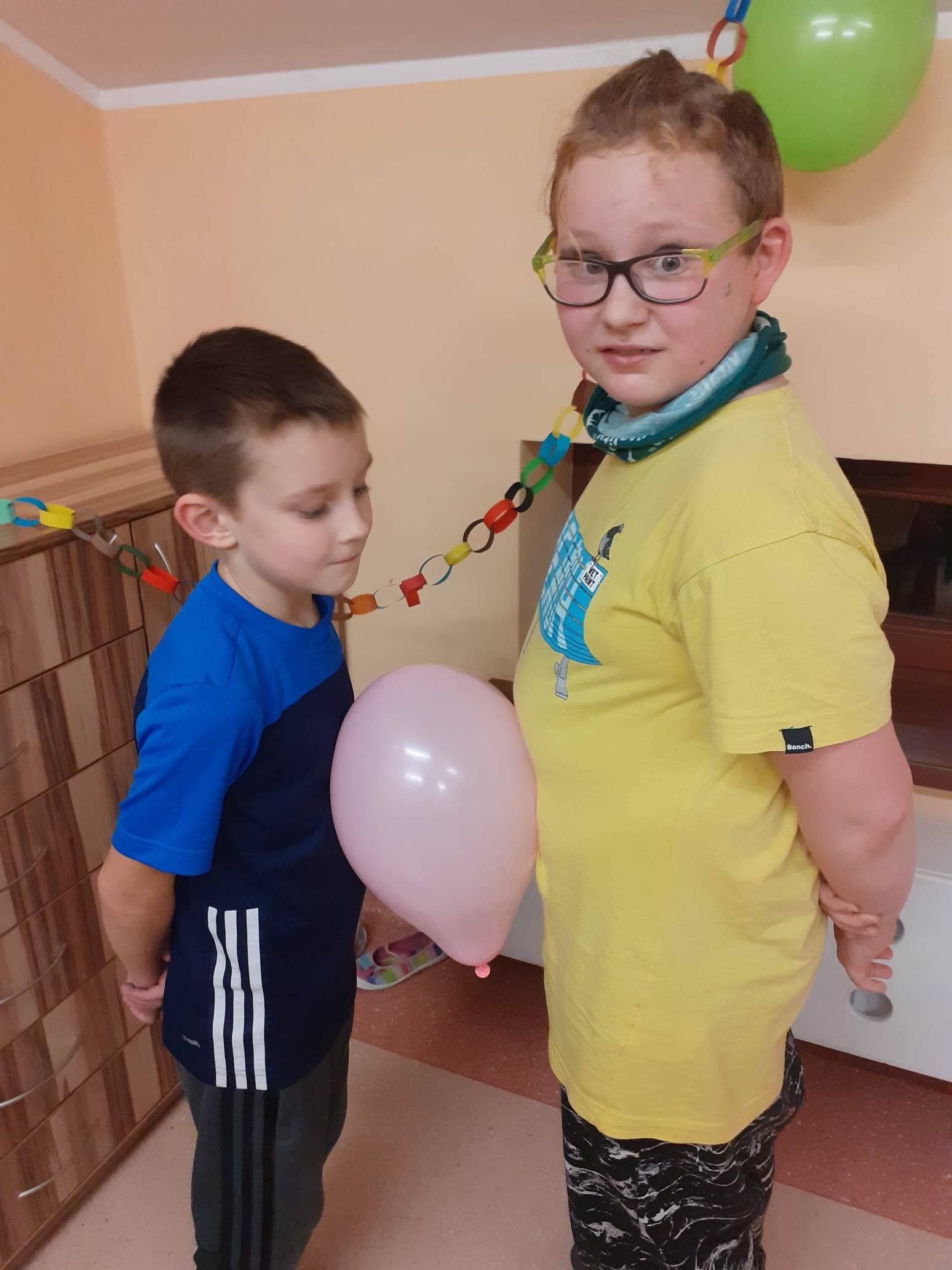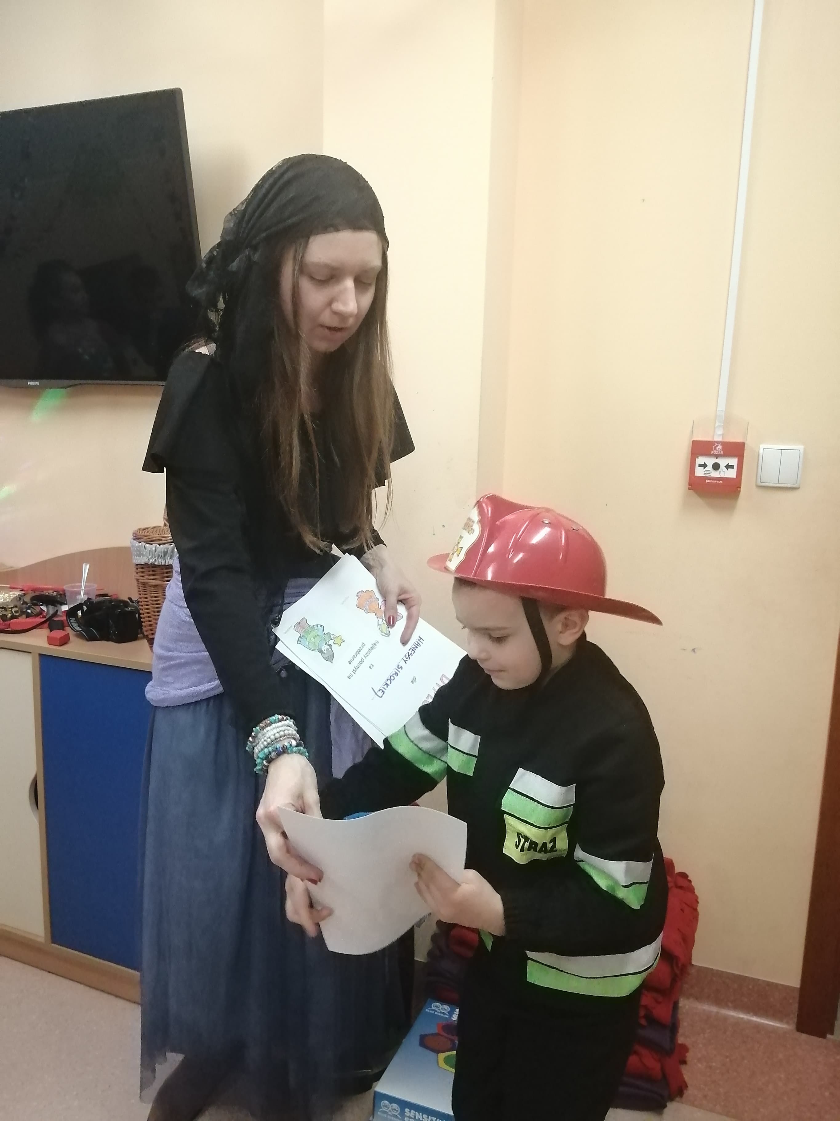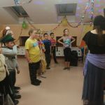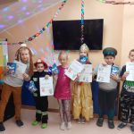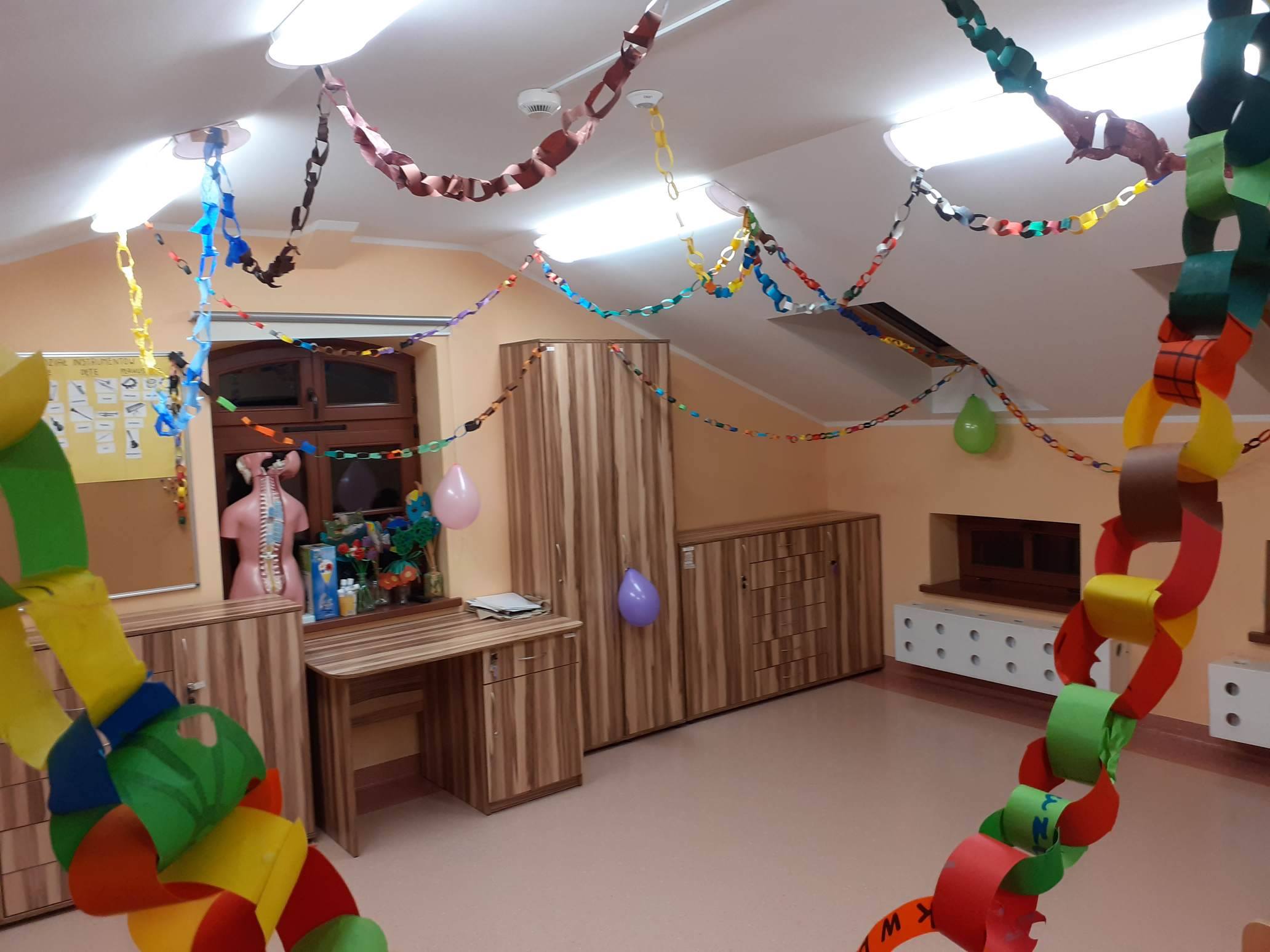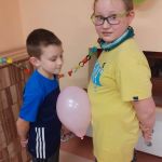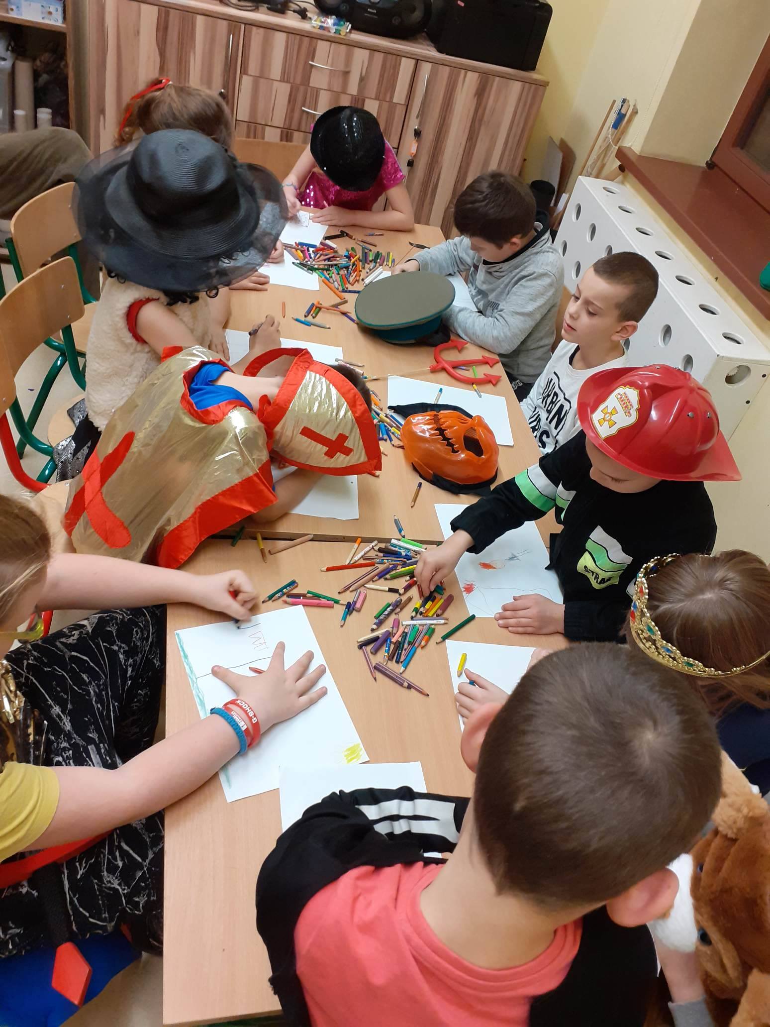 Ale w piątek dużo się u nas działo! Byli żołnierze, księżniczki, tancerki disco polo, strażak, szkielet, rycerz, piesek. Było barwnie i kolorowo. Zaczęło się od rozgrzewki w tanecznym rytmie. A później już trudno było nas przegonić z parkietu. Zabawa w krzesełka, taniec w parach z balonem. zabawa „ludzie do ludzi”, tańce do piosenek „Chocolate”, „Makarena”, „Baby shark”, „Jedzie pociąg z daleka”. To tylko niektóre z niespodzianek, które na nas czekały. Koniec balu był smutnym momentem, ale osłodziły nam go trochę nagrody przyznane za najlepsze przebrania, dla króla i królowej parkietu, dla zwycięzców w konkursach.