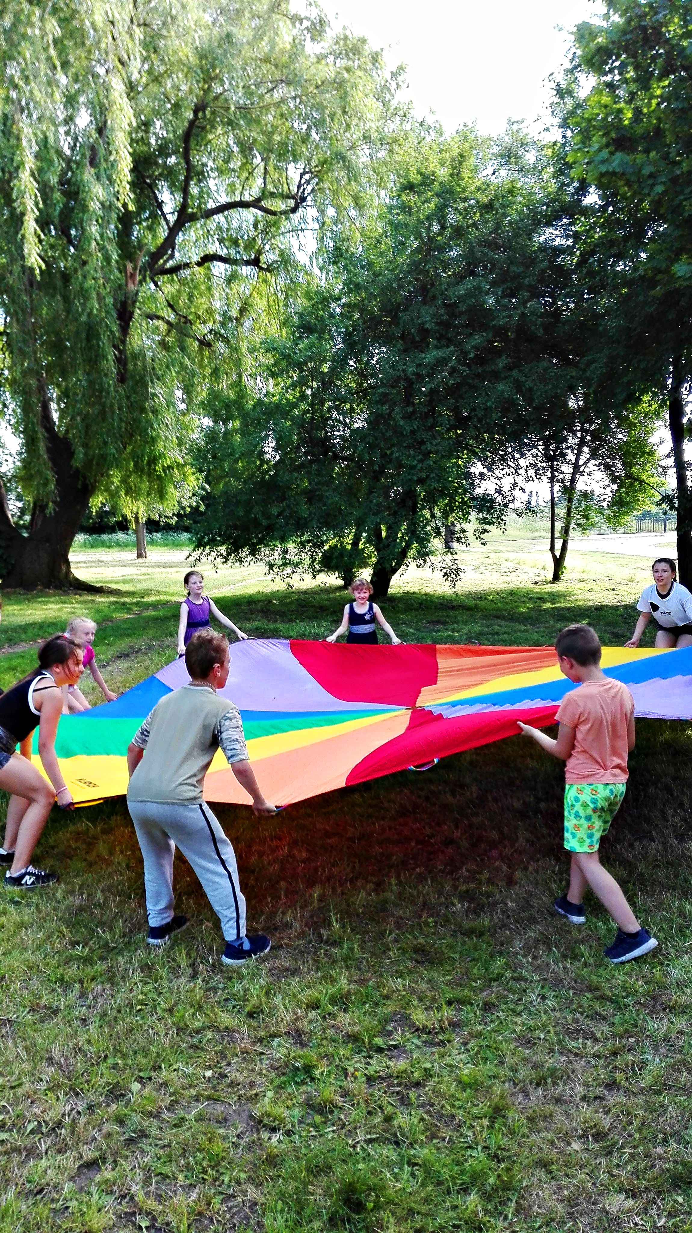 Chusta animacyjna wczoraj zdominowała nasz dzień. Mimo panującego upału znaleźliśmy kawałek cienia i poszliśmy się pobawić – w cukierka, kolory, kotka i myszkę. Było dużo śmiechu, naładowaliśmy się dużą dawką pozytywnej energii. Dobrze rozpoczęliśmy tydzień!