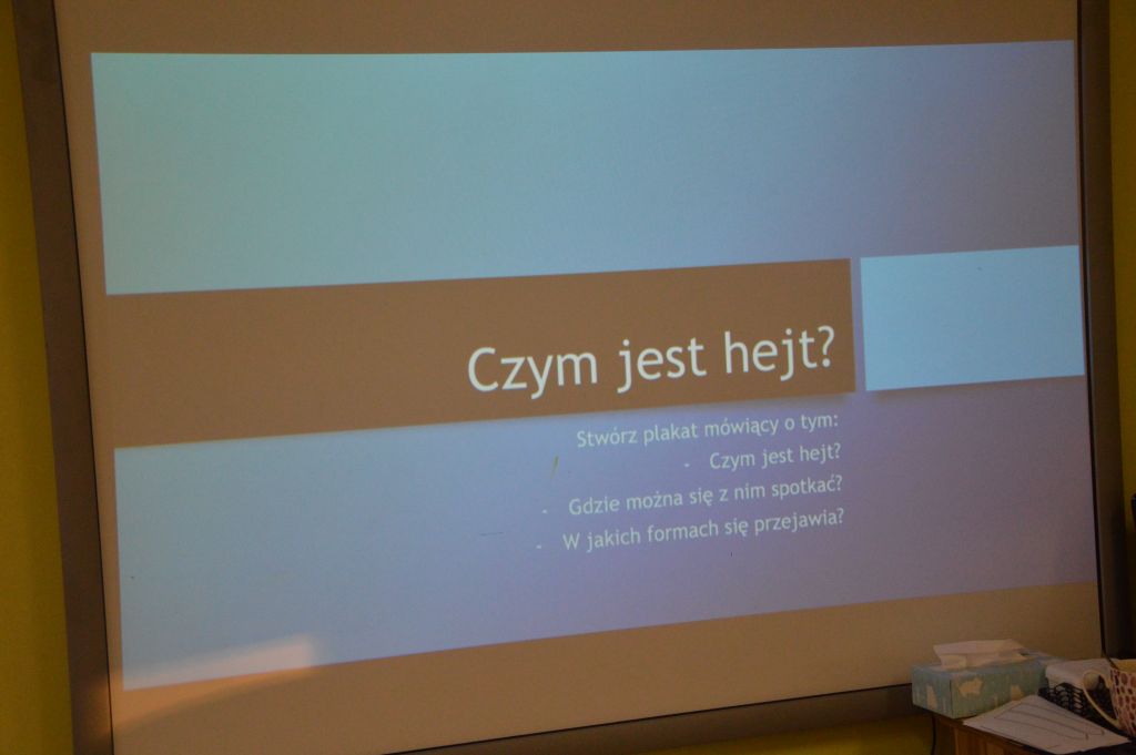 Rozmawiając o bezpieczeństwie w sieci skoncentrowaliśmy się na niebezpiecznym zjawisku, jakim jest „hejt”. Wiemy, że to mowa nienawiści. Wiemy, gdzie możemy się z nim zetknąć – na forach internetowych, portalach społecznościowych, w grach internetowych i wielu innych. Wiemy też, że przejawia się w postaci komentarzy, memów, gifów, filmików. Najtrudniejsze jednak dla nas było ustalenie jak powinniśmy na niego reagować i gdzie zwrócić się o pomoc, kiedy dotknie nas bezpośrednio.