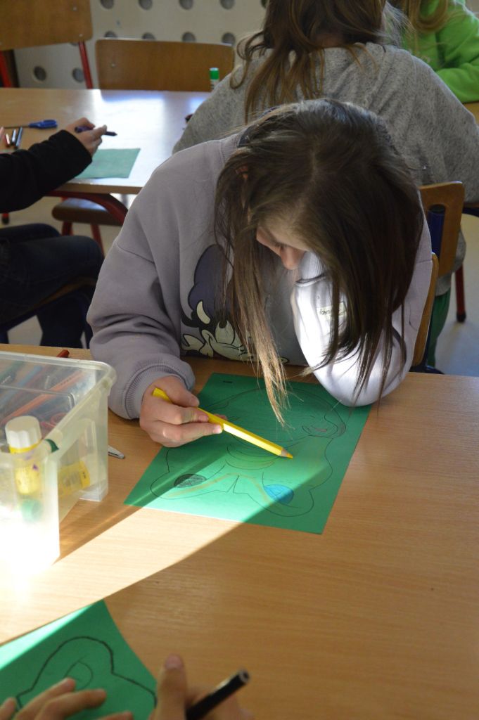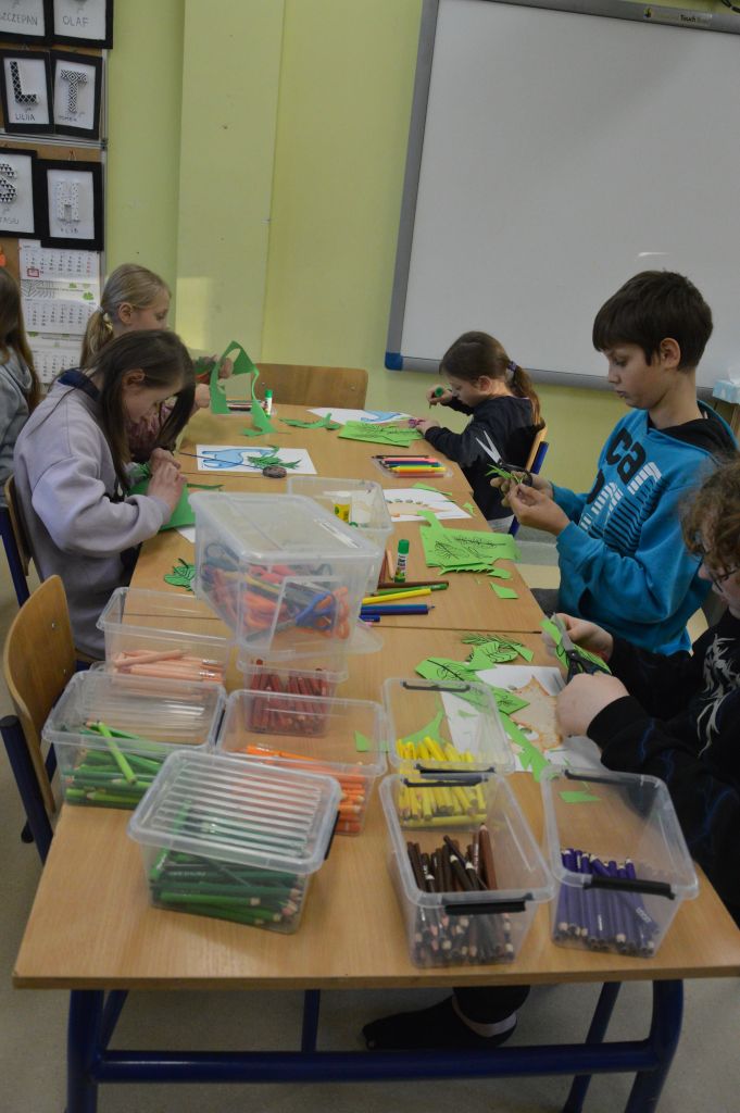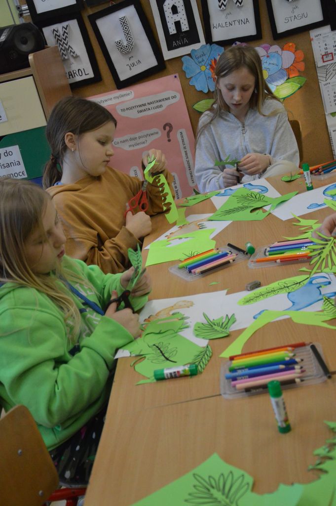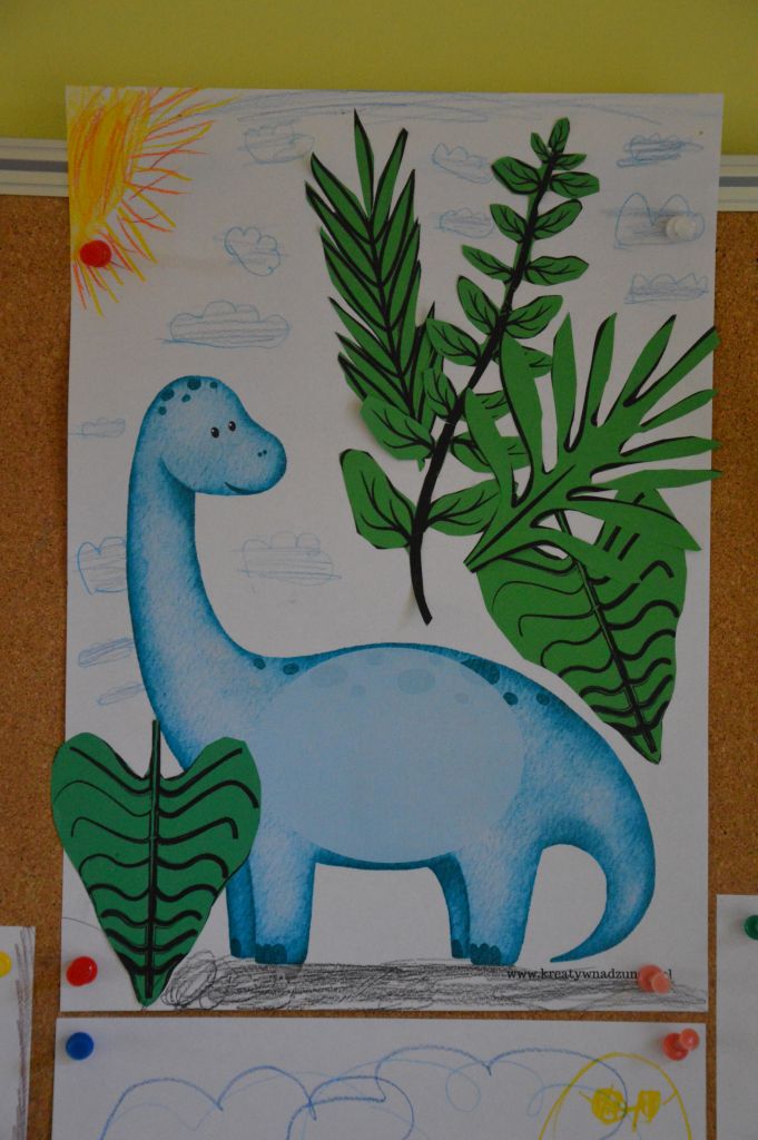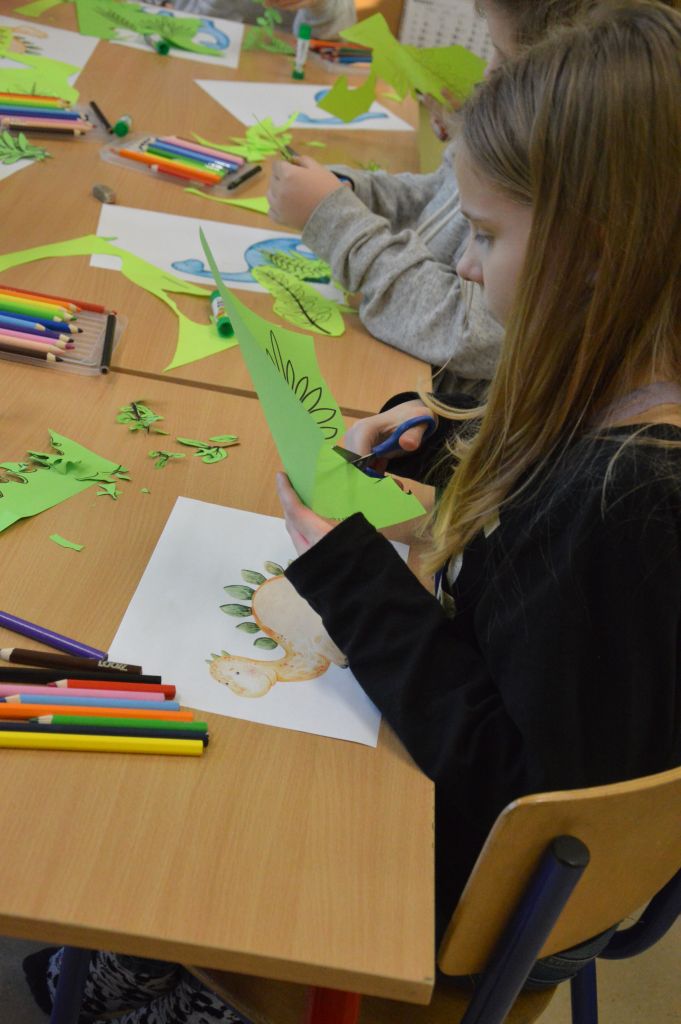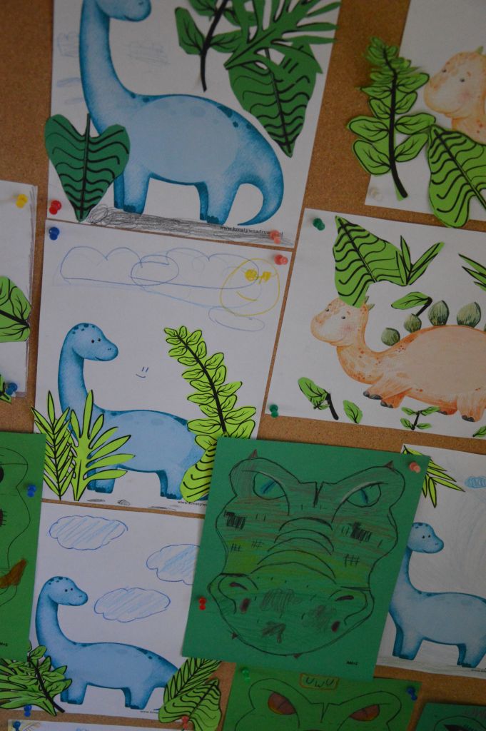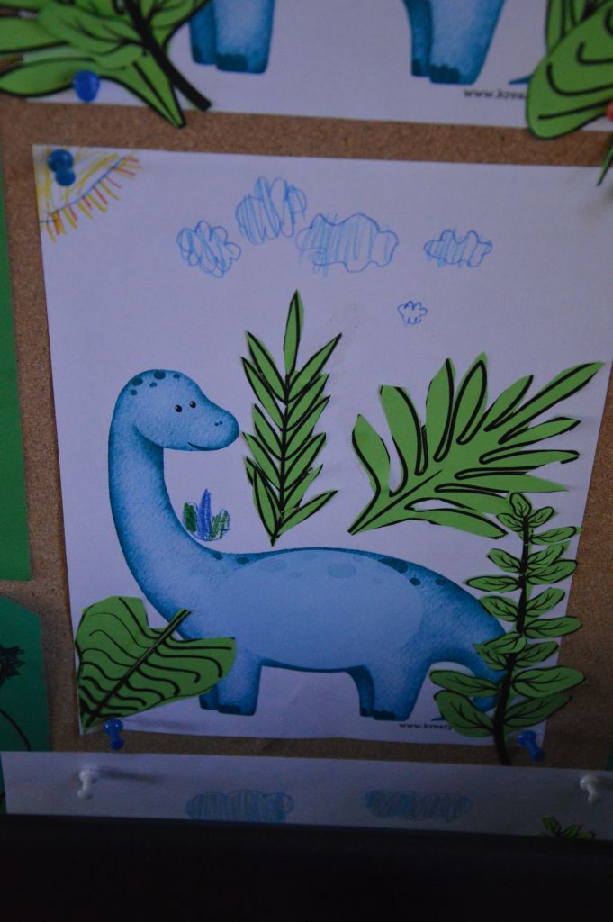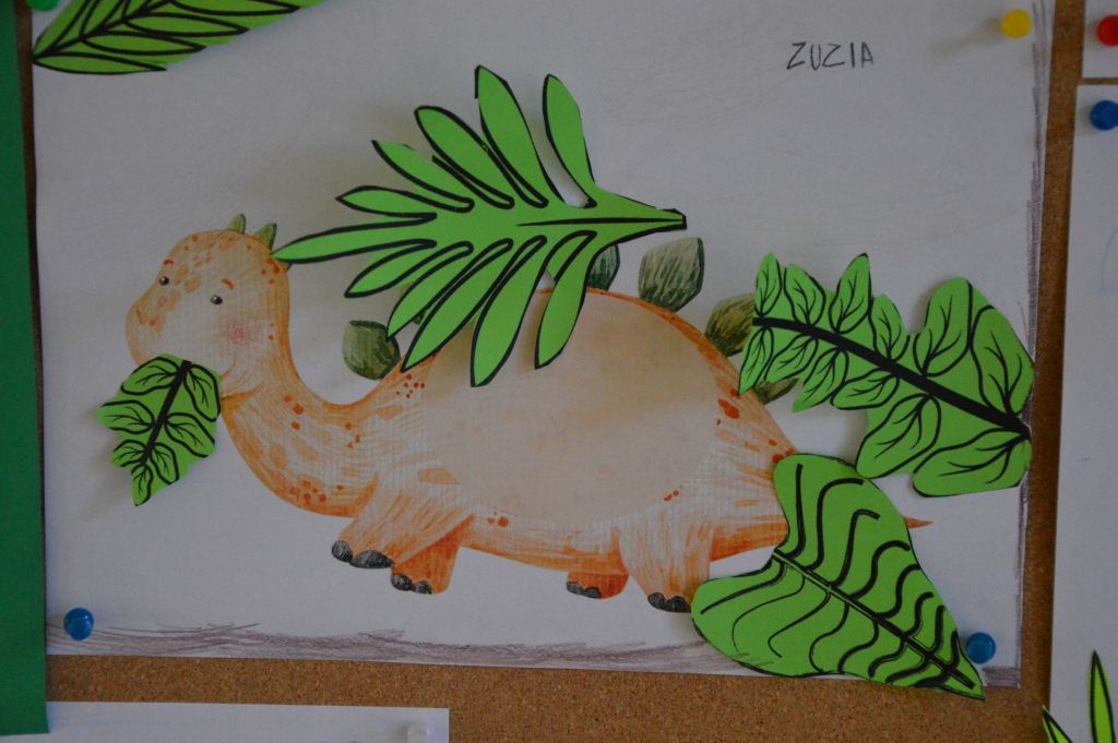 To nie był koniec artystycznej części zajęć – dla kolejnych dinozaurów stworzyliśmy sprzyjające im warunki do życia – skupiliśmy się na tych roślinożernych, dlatego na naszych pracach pojawiło się mnóstwo roślin i liści.
