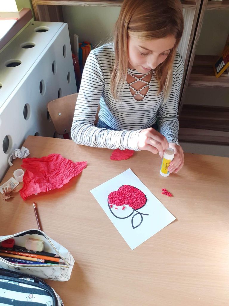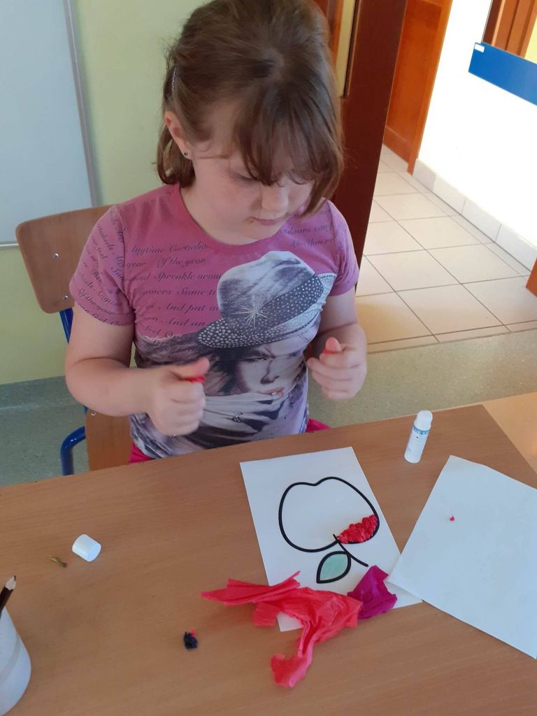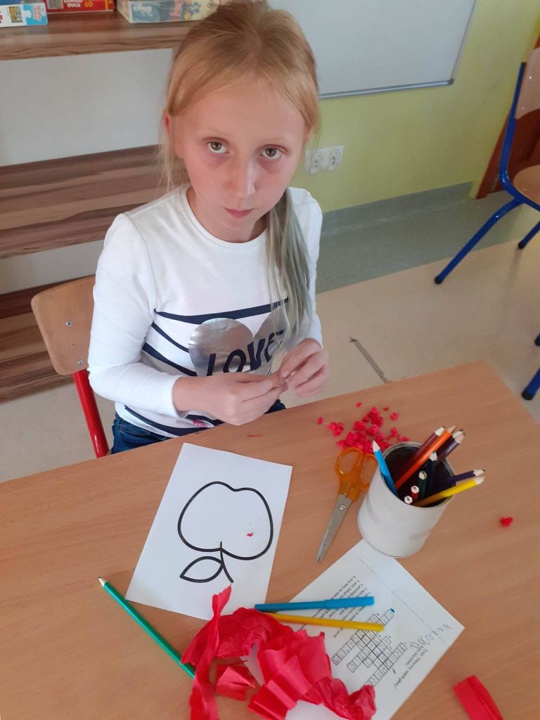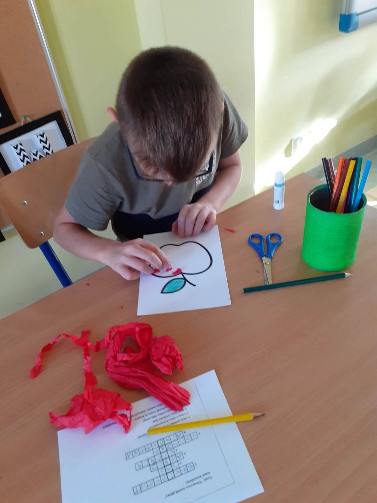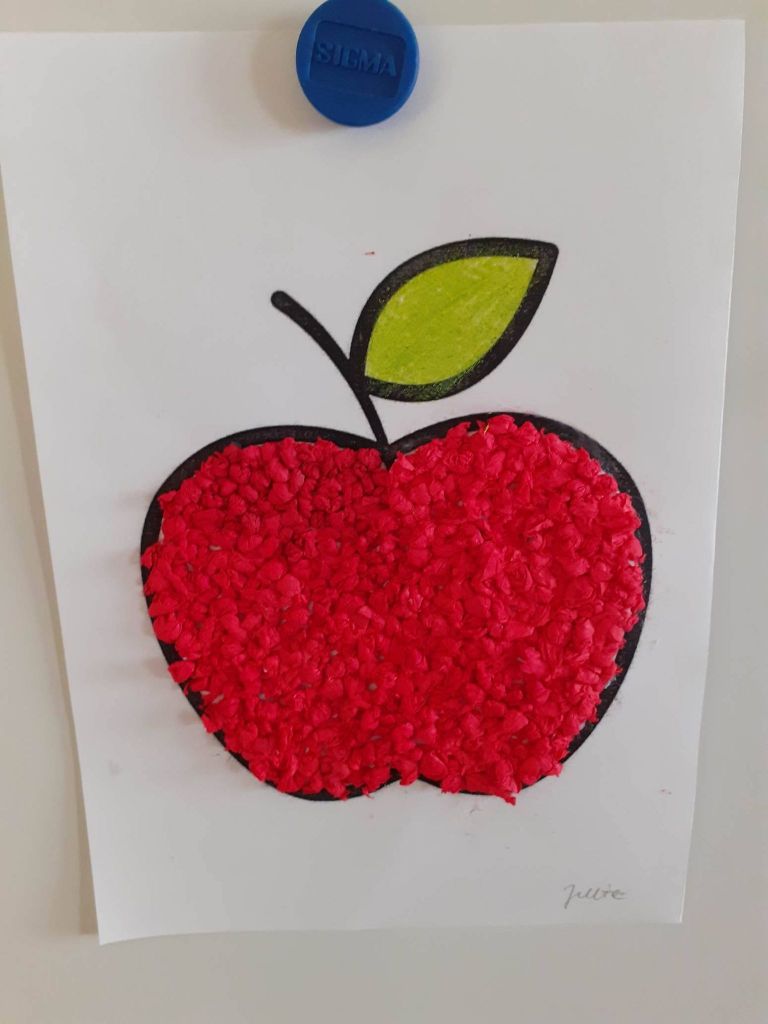 Wiemy też jak nazywają się poszczególne części jabłka – wiemy gdzie jest szypułka, owocnia czy komora nasienna. Nie mogło oczywiście zabraknąć pracy plastycznej, której głównym bohaterem było jabłuszko wyklejone kuleczkami z bibuły. Przy okazji poćwiczyliśmy sprawność naszych paluszków.