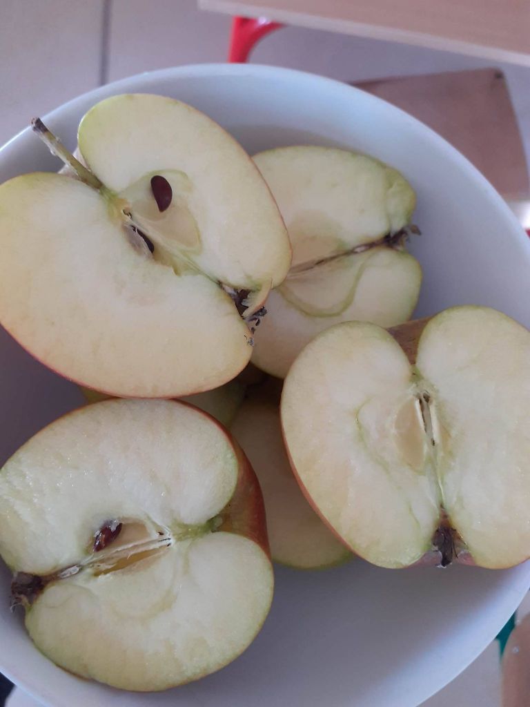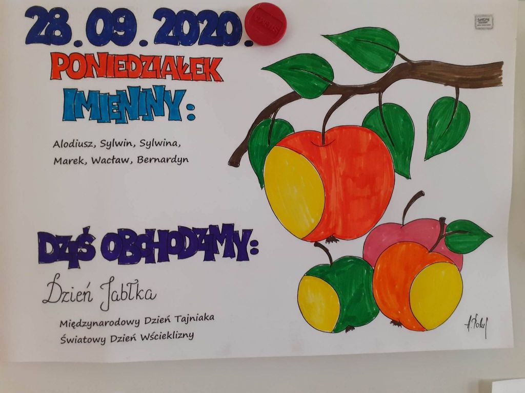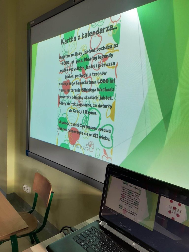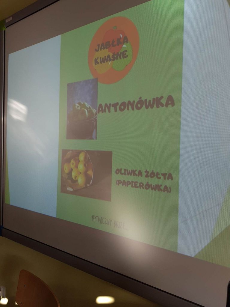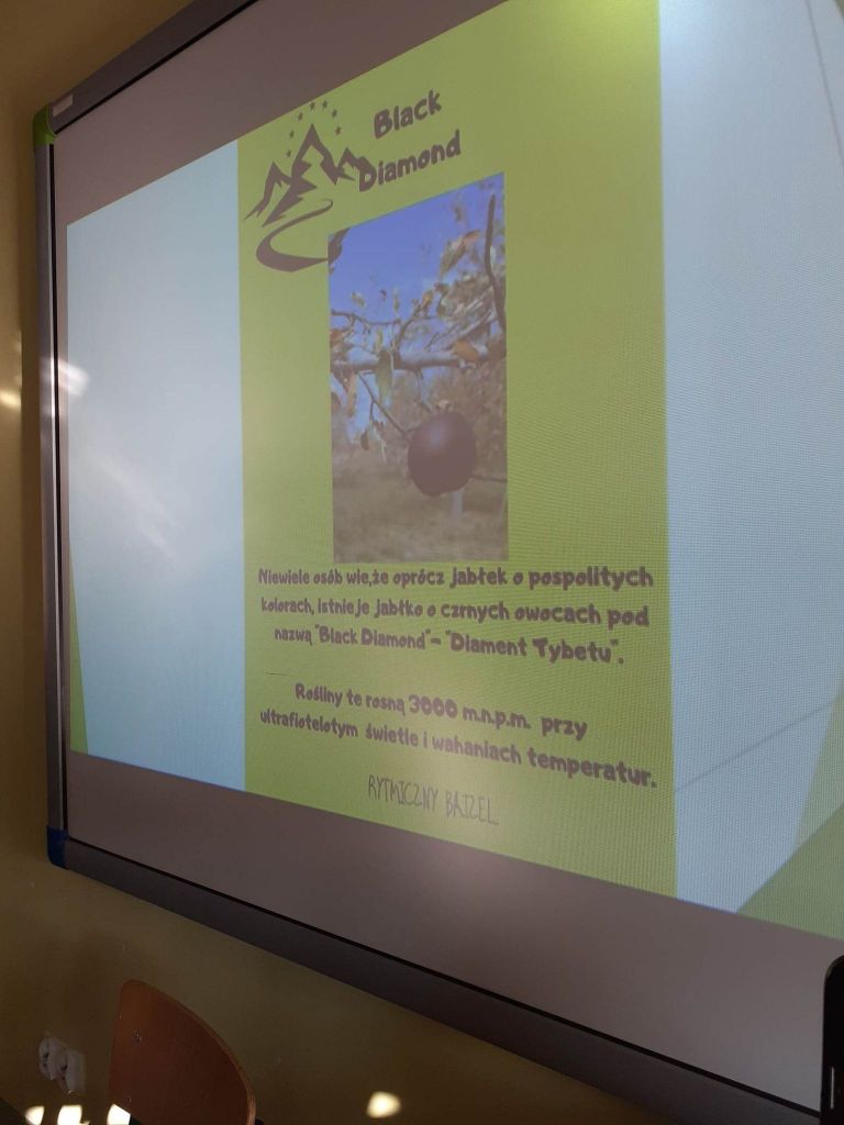 Zaczęliśmy od krzyżówki, aby dowiedzieć się o czym będą zajęcia. Okazało się, ze hasłem jest: jabłko. Dowiedzieliśmy się na jego temat wielu ciekawych rzeczy, np. że Polska jest największym eksporterem jabłek w Europie, że jabłko było sprawcą pojawienia się prawa powszechnego ciążenia, że do Polski jabłka dotarły w XII wieku, że istnieje ok 10 tysięcy odmian, że jabłka są nie tylko czerwone, żółte czy zielone, ale również czarne. I nie chodzi tutaj o zepsute jabłka! O nie! Te czarne jabłka noszą nazwę Diament Tybetu.