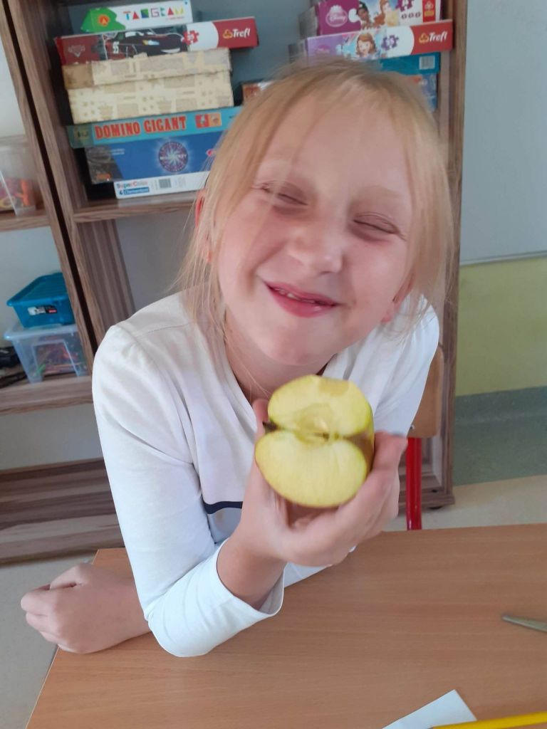 A na koniec miła i smaczna niespodzianka! Jabłka pod różnymi postaciami: owocu, soku i ciastka z jabłkiem.