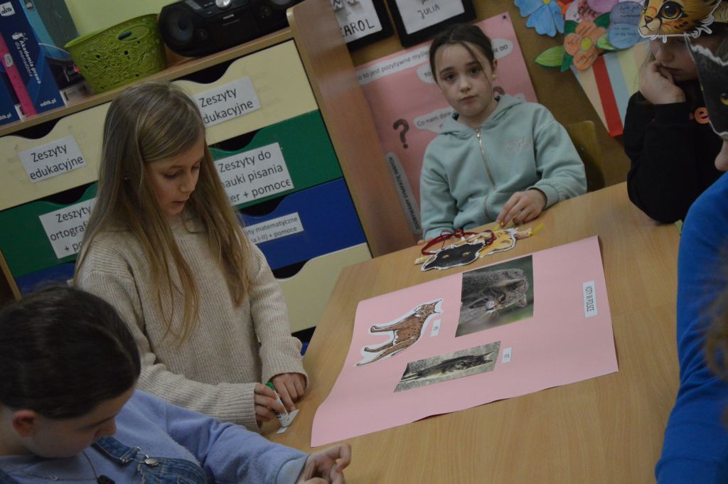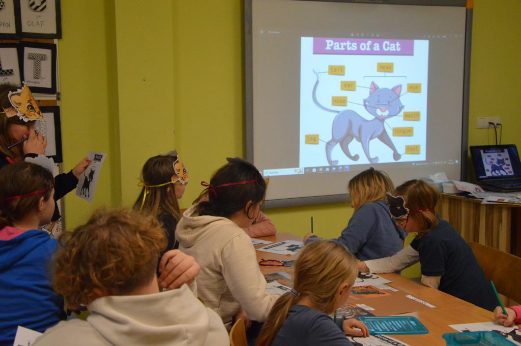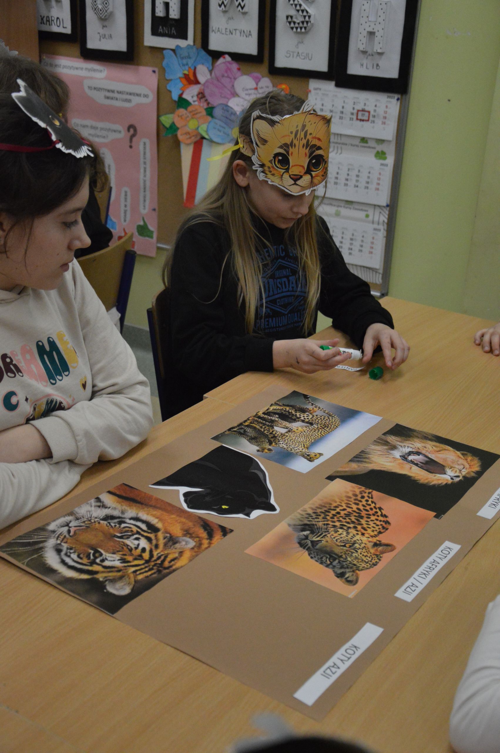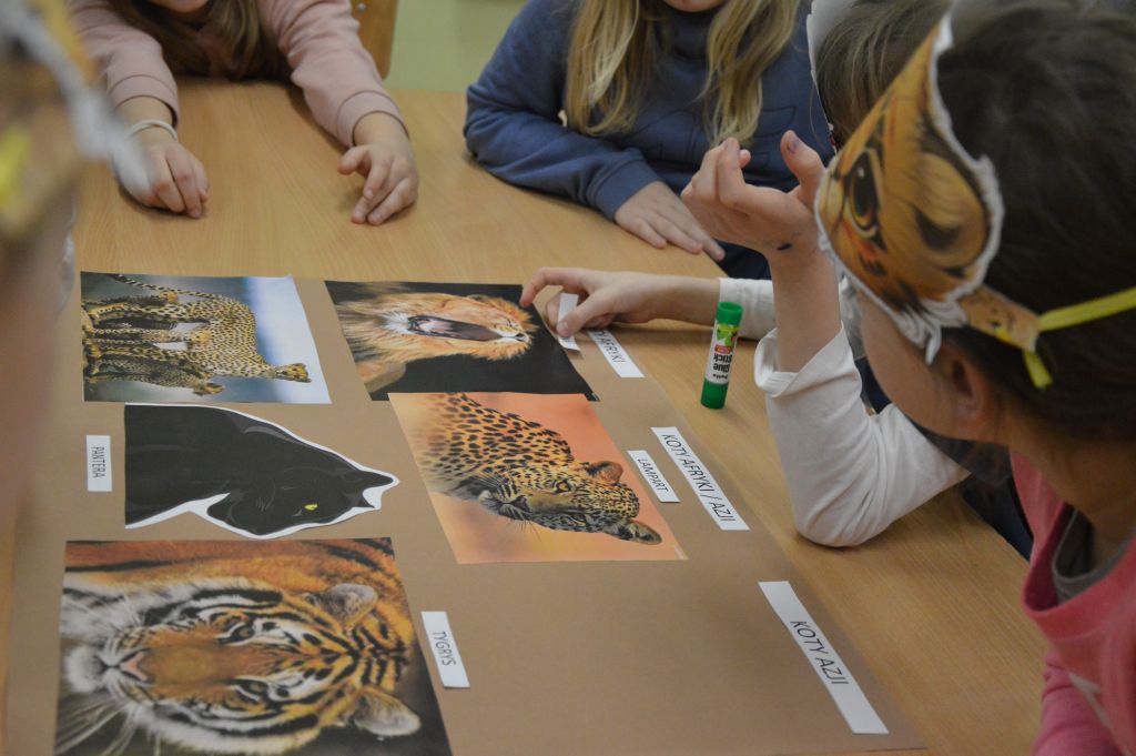 Kot, kotek, kiciuś, kocurek – mnóstwo słów określających naszych futrzanych przyjaciół. W dniu ich święta również zamieniliśmy się w koty, a to za sprawą opasek na głowę – staliśmy się gepardami i panterami – dzikimi kotami. Poznaliśmy również pozostałych członków naszej kociej rodziny – tygrysy, lwy, rysie, żbiki, pumy, gepardy i lamparty. Wiemy też, na jakich obszarach występują najczęśniej. Znamy ich nazwy w języku angielskim i potrafimy nazwać ich części ciała.