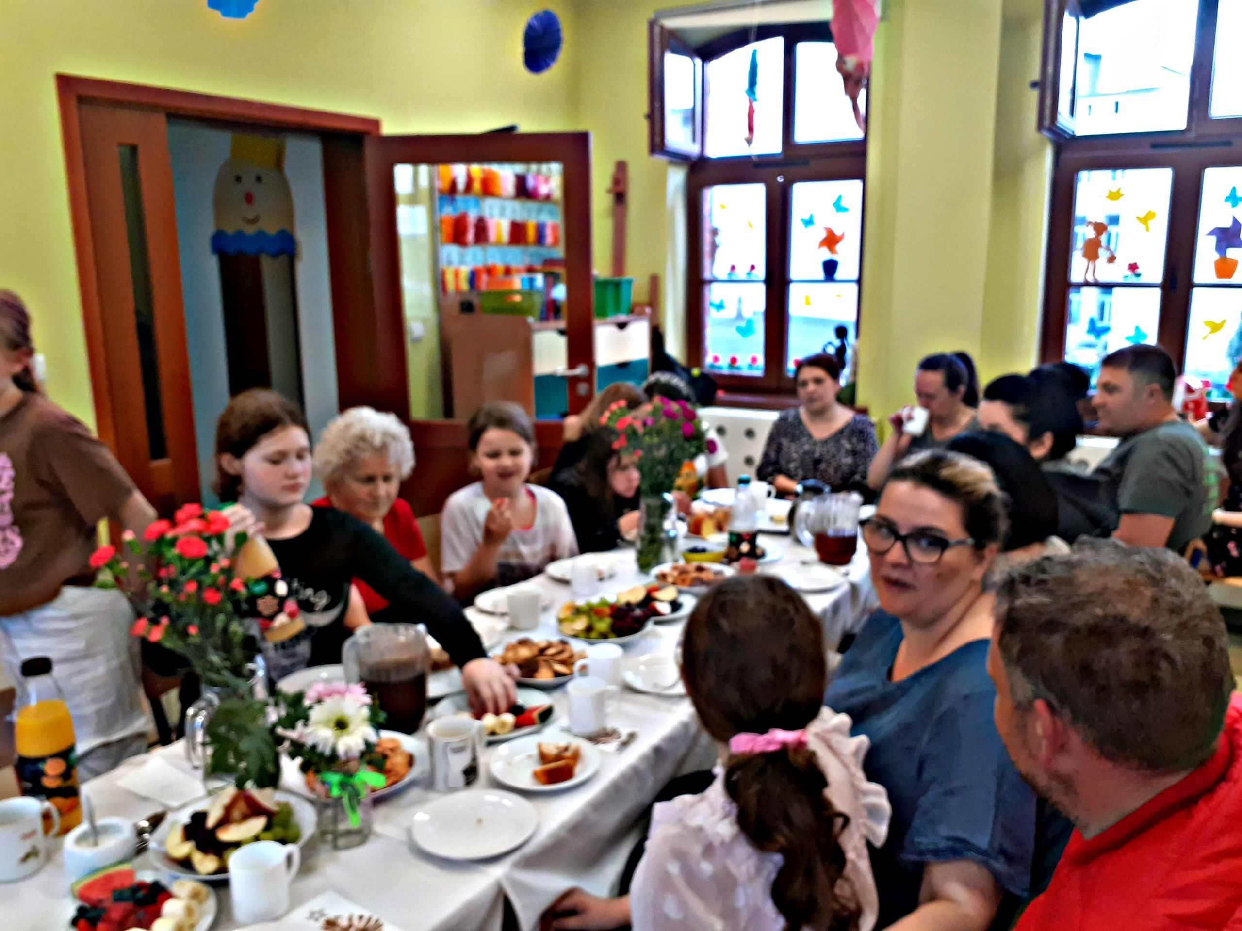 Stoły były bogato zastawione talerzami z owocami i słodkim poczęstunkiem. Postaraliśmy się, aby ten dzień był dla wszystkich wyjątkowy. Po słowach podziękowania i uśmiechach rodziców na koniec wydarzenia wnioskujemy, że udało nam się osiągnąć ten cel.