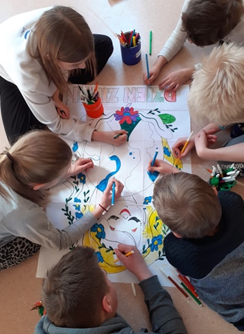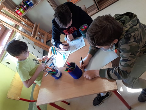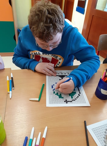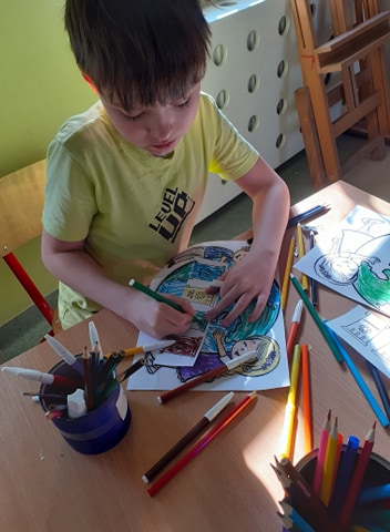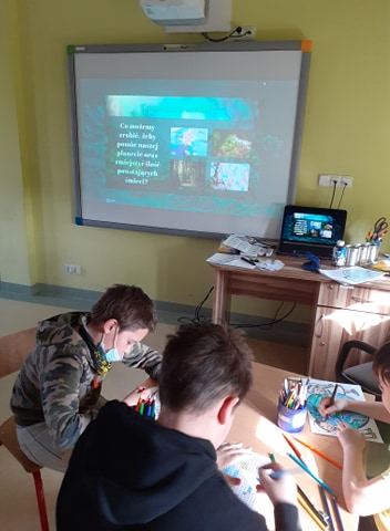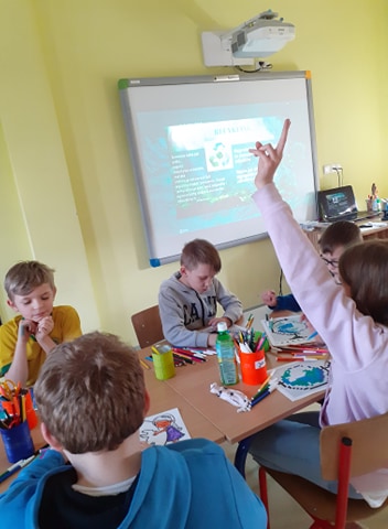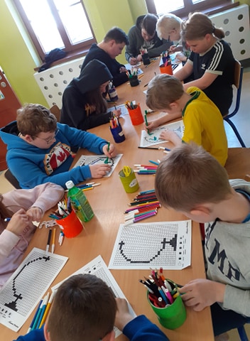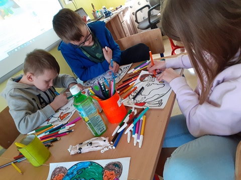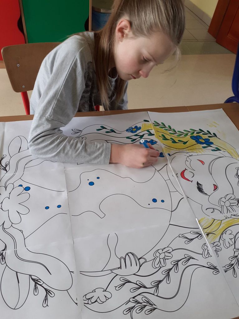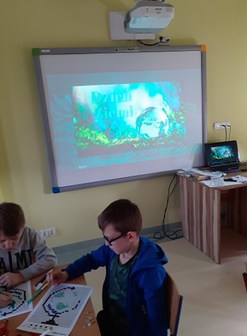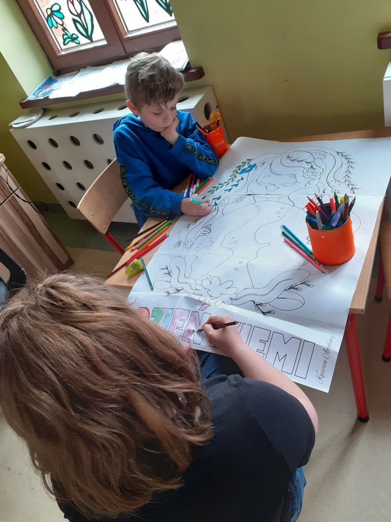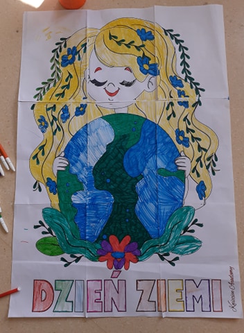 Ostatnio obchodziliśmy Światowy Dzień Ziemi. Ważny dzień, biorąc pod uwagę niektóre działania człowieka. Aby nasz dom – planeta Ziemia – była czysta i zdrowa, a co za tym idzie, abyśmy my ludzie mogli oddychać czystym powietrzem, pić zdrową wodę, spacerować po czystych lasach, łąkach i ulicach, nie kąpać się w brudnym, pełnym śmieci jeziorze – poznaliśmy sposoby na dbanie o Ziemię. Najbardziej zapadł nam w pamięć recycling – prosta rzecz, którą może robić każdy z nas. Wystarczy wykorzystywać powtórnie pewne materiały, a wcześniej wrzucać je do odpowiednich pojemników. To może robić nawet dziecko, czyli my. No i okazało się, że w świetlicy całkiem sprawnie stosujemy recycling – wielokrotnie do różnych celów używaliśmy materiałów, które inni pewnie wyrzuciliby do śmieci. Zanim jednak przeszliśmy do części edukacyjnej otrzymaliśmy kartę do kodowania, pod którą ukrył się globus i pokolorowaliśmy wspólnie plakat przedstawiający człowieka chroniącego planetę. To były bardzo pouczające zajęcia.