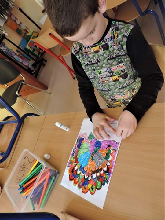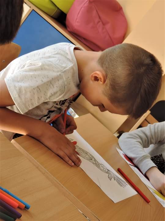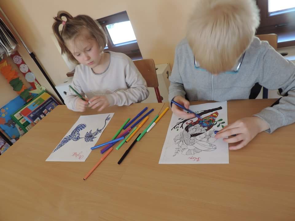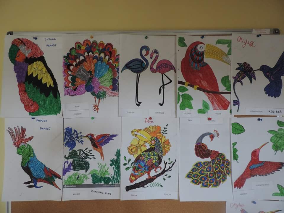 Na ostatnich zajęciach połączyliśmy nasze kolorowanki antystresowe z nauką języka angielskiego. Poznaliśmy nowe ptaki: kolibra, tukana, pawia, papugę, flaminga. To ptaki, które w Polsce można podziwiać tylko w zoo, na wolności jest to niemożliwe. U nas powstały bajecznie kolorowe, jak przystało na ptaki egzotyczne.