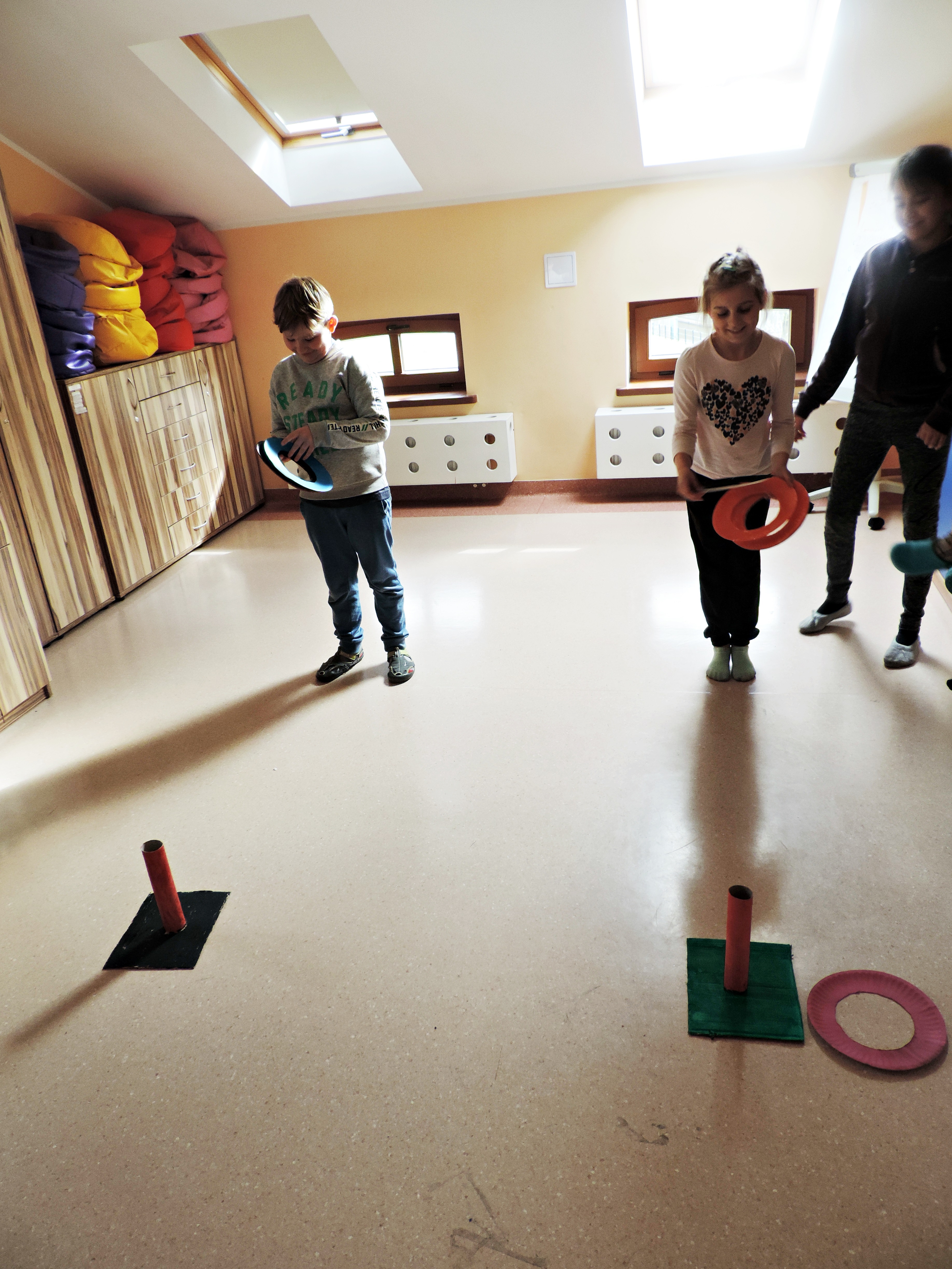Tak jak ostatnio wspominaliśmy – u nas nic się nie marnuje. Guada pomogła nam zrobić grę z tego, co mieliśmy akurat pod ręką: z rolek po papierze kuchennym, kartonów i papierowych talerzy. Powstała nowa gra, czyli rzucanie okręgów na słupki. Już zdążyliśmy nawet naszą nową grę wypróbować!
