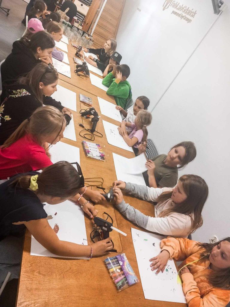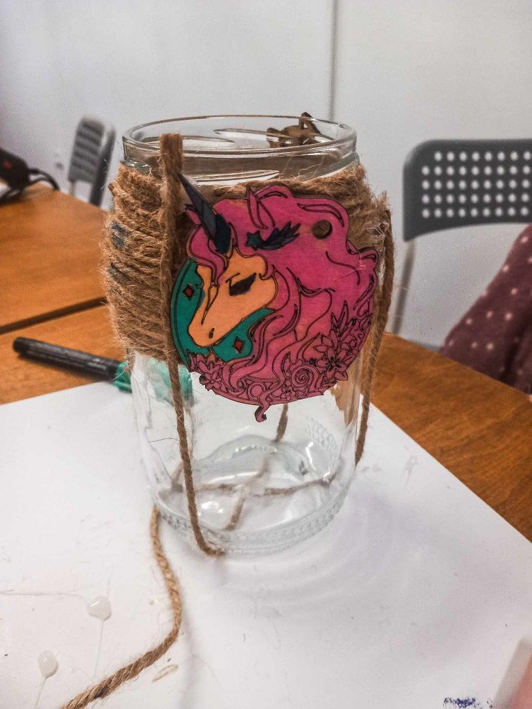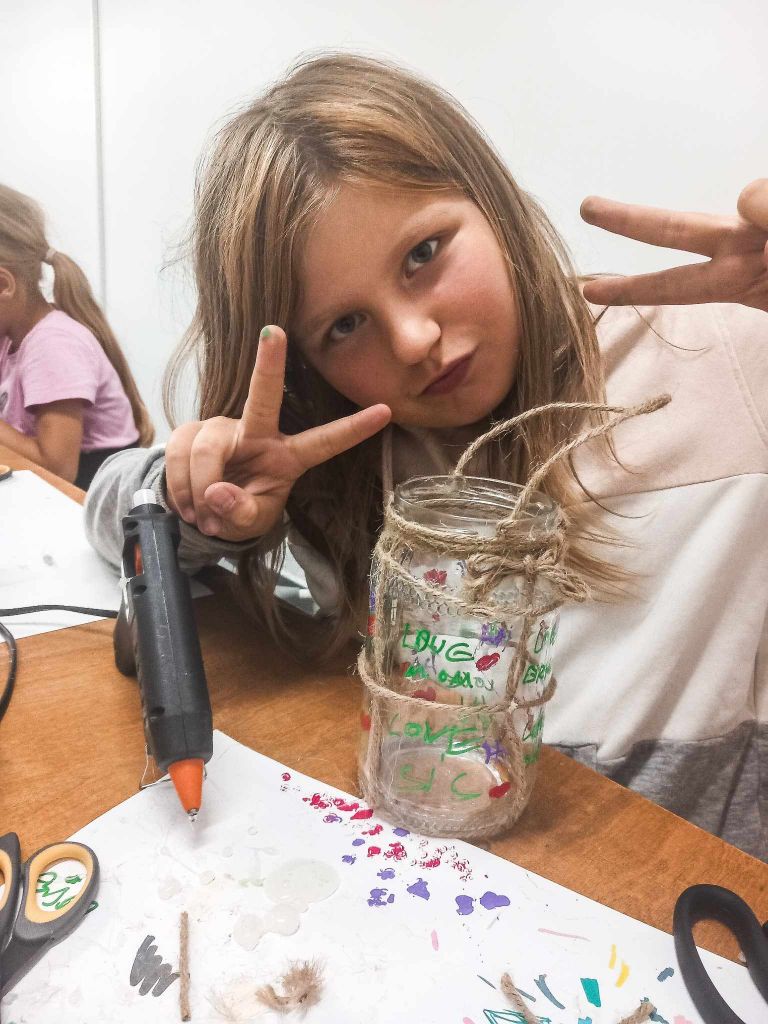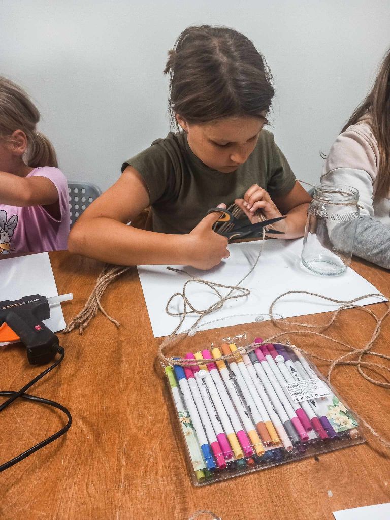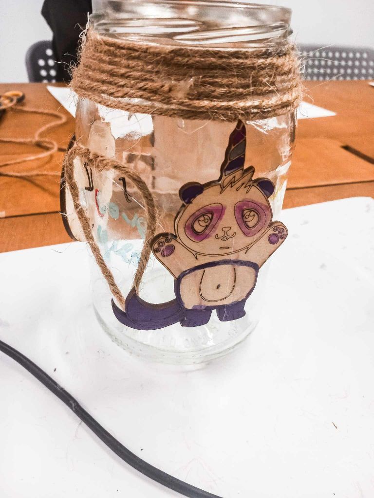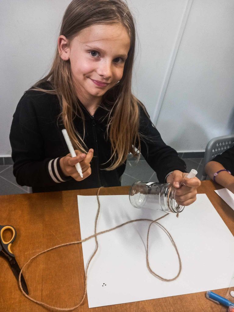 Wtorkowe dodatkowe warsztaty zawdzięczamy zaproszeniu od FabLab Gdańsk powered by Orange, którzy zaproponowali nam zrobienie słoików na przydaśki. Ozdabialiśmy je metodą makramy, choć niewielu podjęło wyzwanie nauczenia się specjalnego splotu, który pokazywała nam Pani Ania. Pozostali na własny sposób owijali słoiki sznurkiem i go do nich przyklejali na gorący klej. Jakby tego było mało, Pan Cyryl przy pomocy plotera laserowego wycinał nam różne kształty – piórka, jednorożce, pokemony, żabki, kaczuszki, wilki, co tylko wymyśliliśmy!