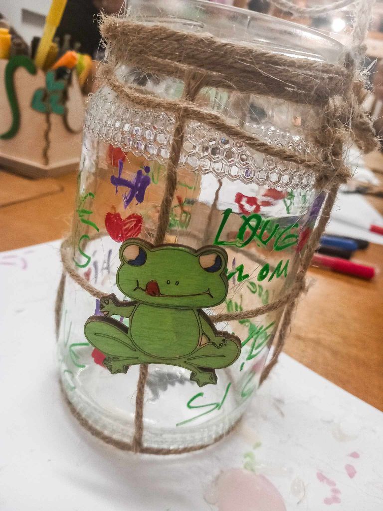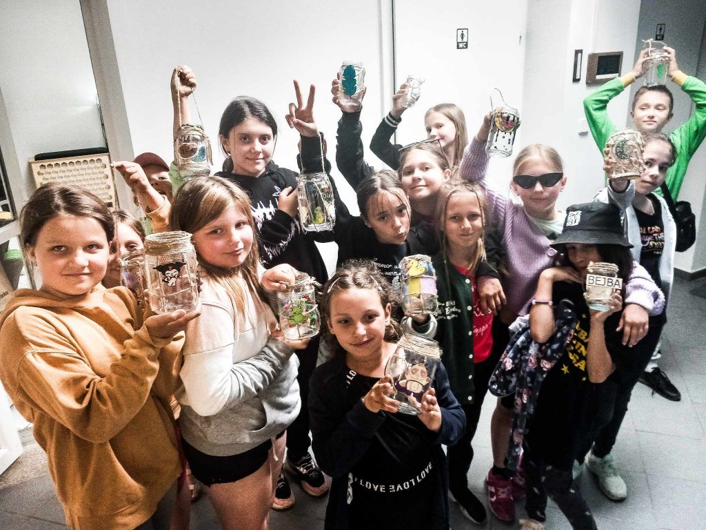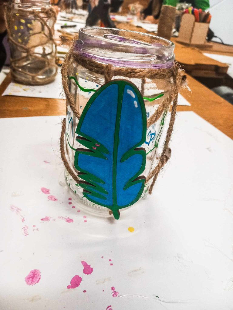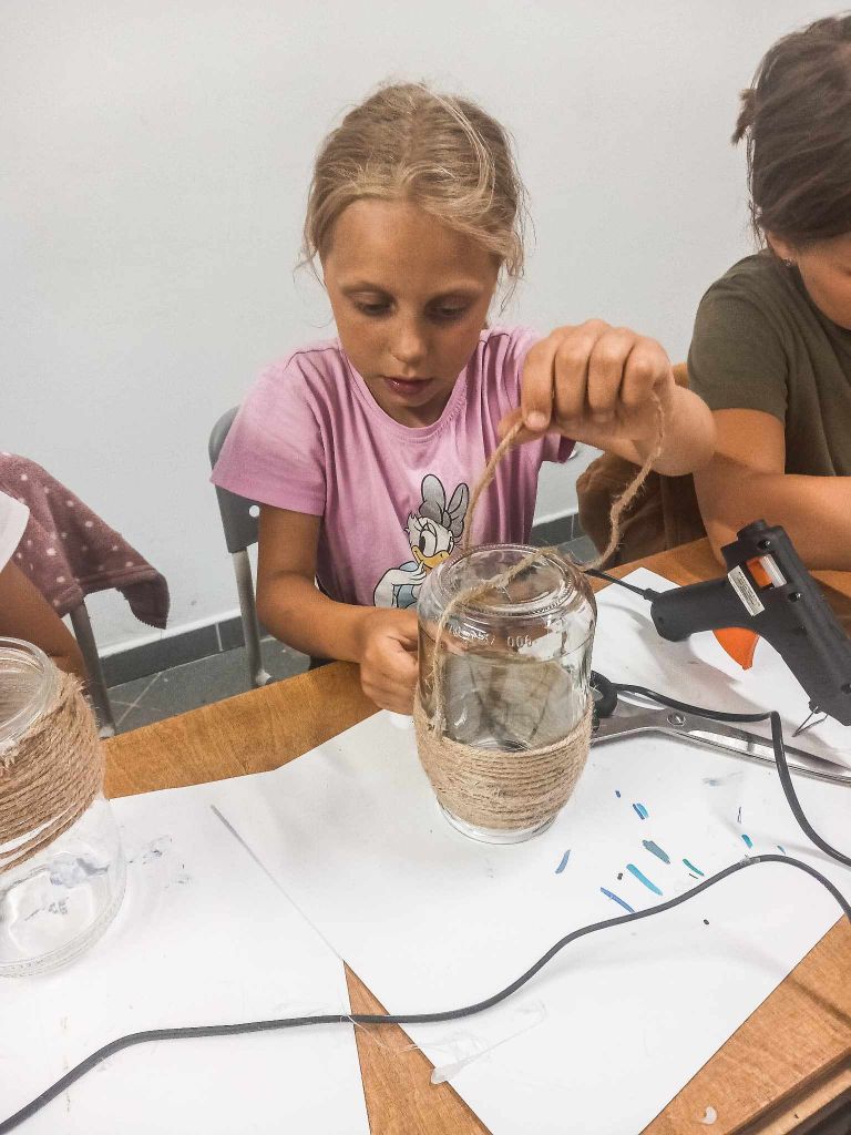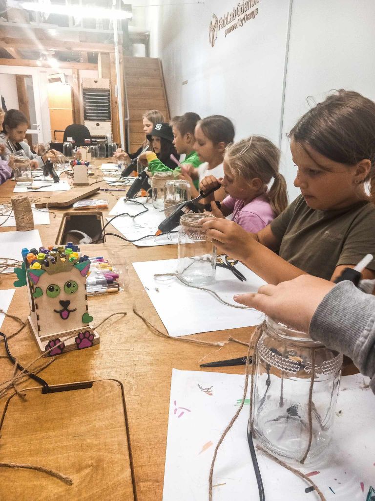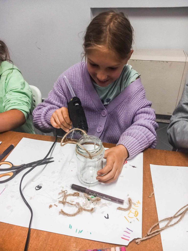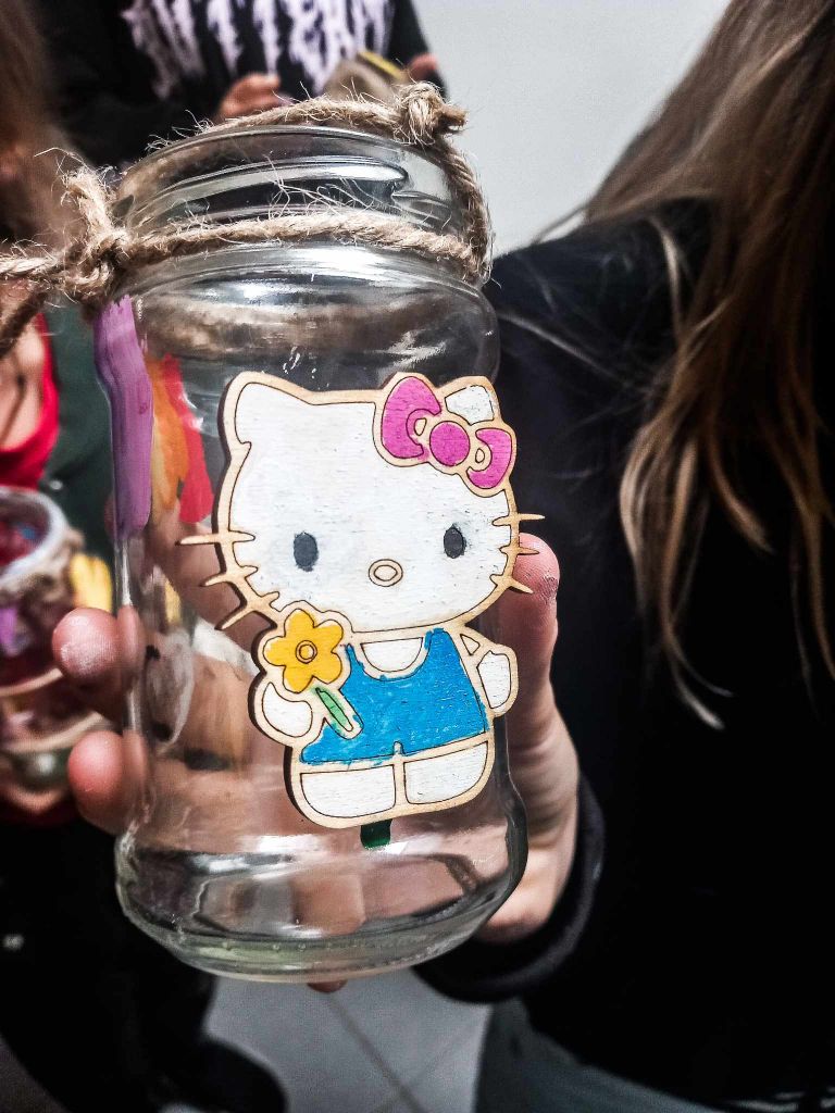 Wtorkowe dodatkowe warsztaty zawdzięczamy zaproszeniu od FabLab Gdańsk powered by Orange, którzy zaproponowali nam zrobienie słoików na przydaśki. Ozdabialiśmy je metodą makramy, choć niewielu podjęło wyzwanie nauczenia się specjalnego splotu, który pokazywała nam Pani Ania. Pozostali na własny sposób owijali słoiki sznurkiem i go do nich przyklejali na gorący klej. Jakby tego było mało, Pan Cyryl przy pomocy plotera laserowego wycinał nam różne kształty – piórka, jednorożce, pokemony, żabki, kaczuszki, wilki, co tylko wymyśliliśmy!