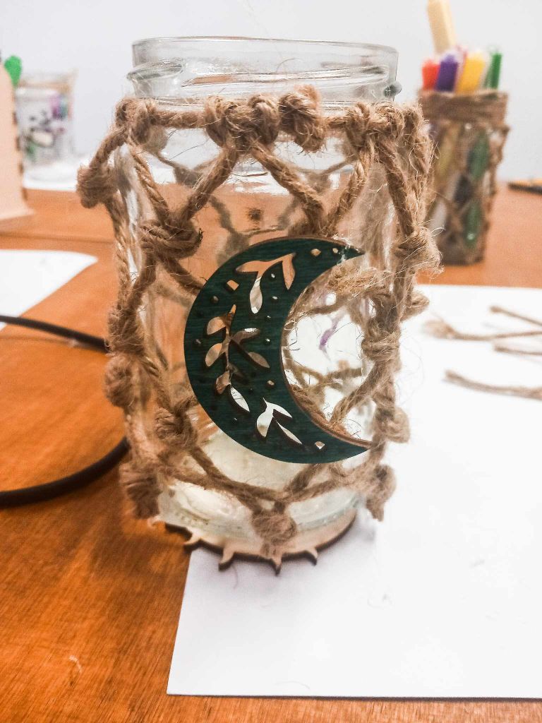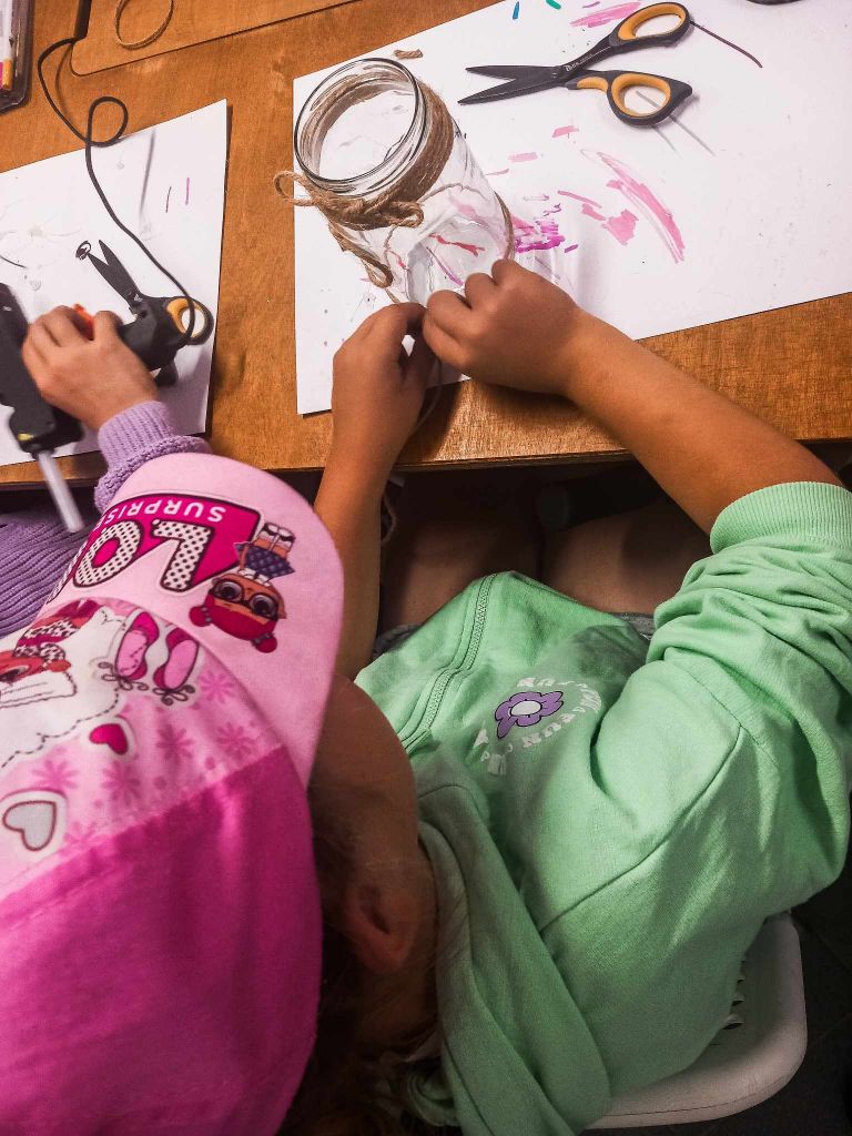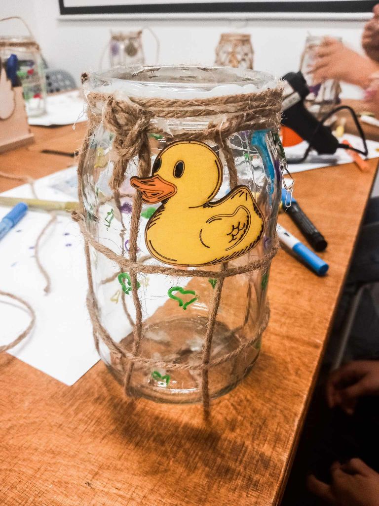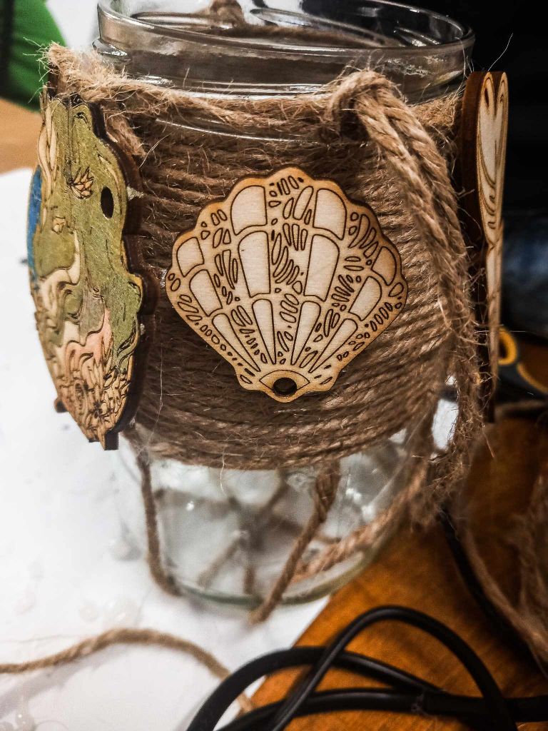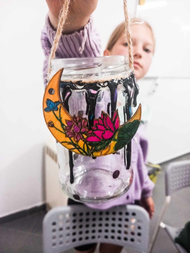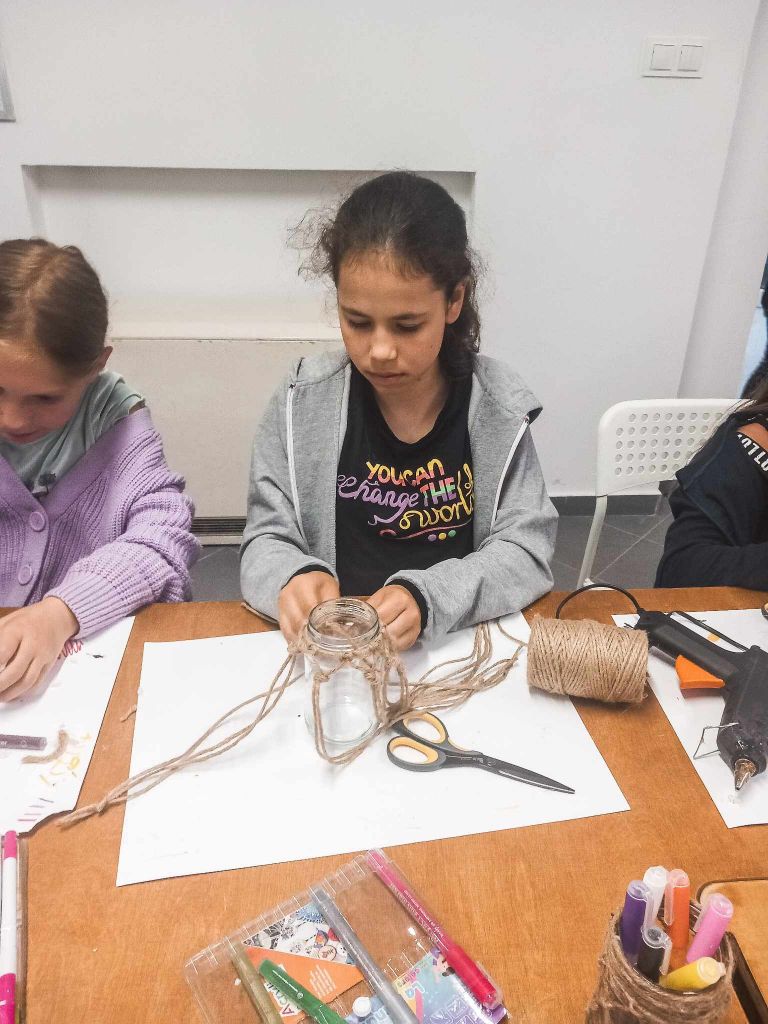 Wtorkowe dodatkowe warsztaty zawdzięczamy zaproszeniu od FabLab Gdańsk powered by Orange, którzy zaproponowali nam zrobienie słoików na przydaśki. Ozdabialiśmy je metodą makramy, choć niewielu podjęło wyzwanie nauczenia się specjalnego splotu, który pokazywała nam Pani Ania. Pozostali na własny sposób owijali słoiki sznurkiem i go do nich przyklejali na gorący klej. Jakby tego było mało, Pan Cyryl przy pomocy plotera laserowego wycinał nam różne kształty – piórka, jednorożce, pokemony, żabki, kaczuszki, wilki, co tylko wymyśliliśmy!