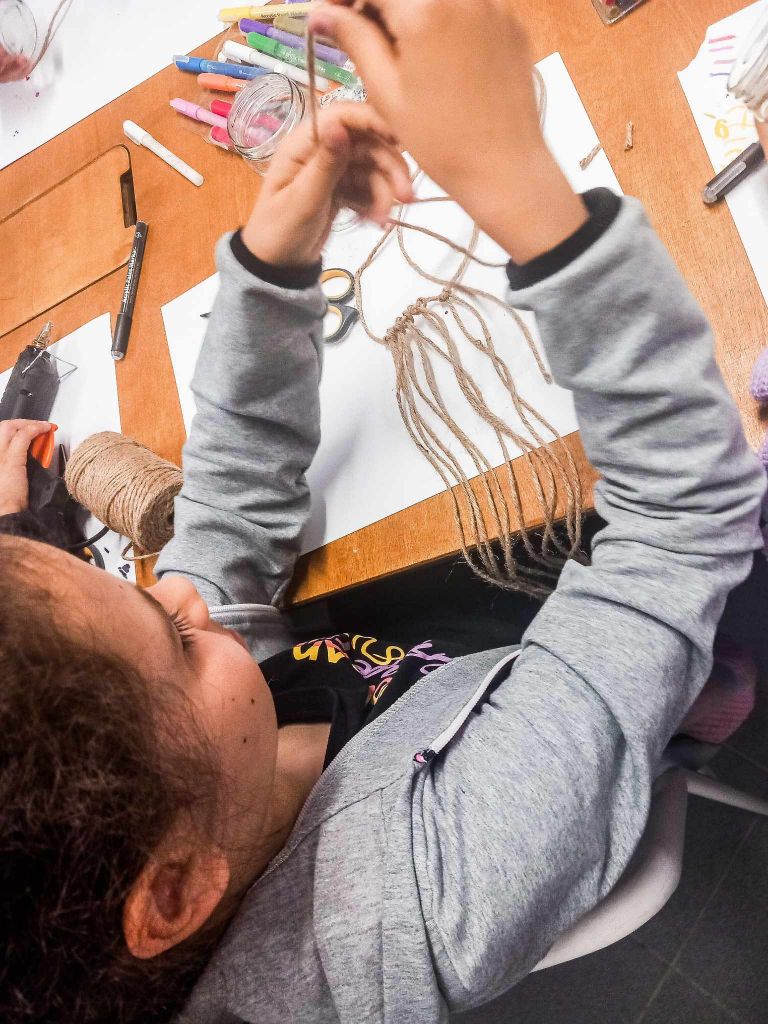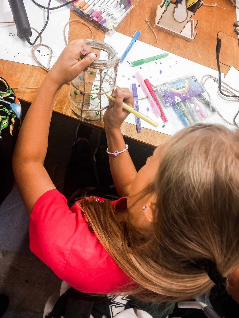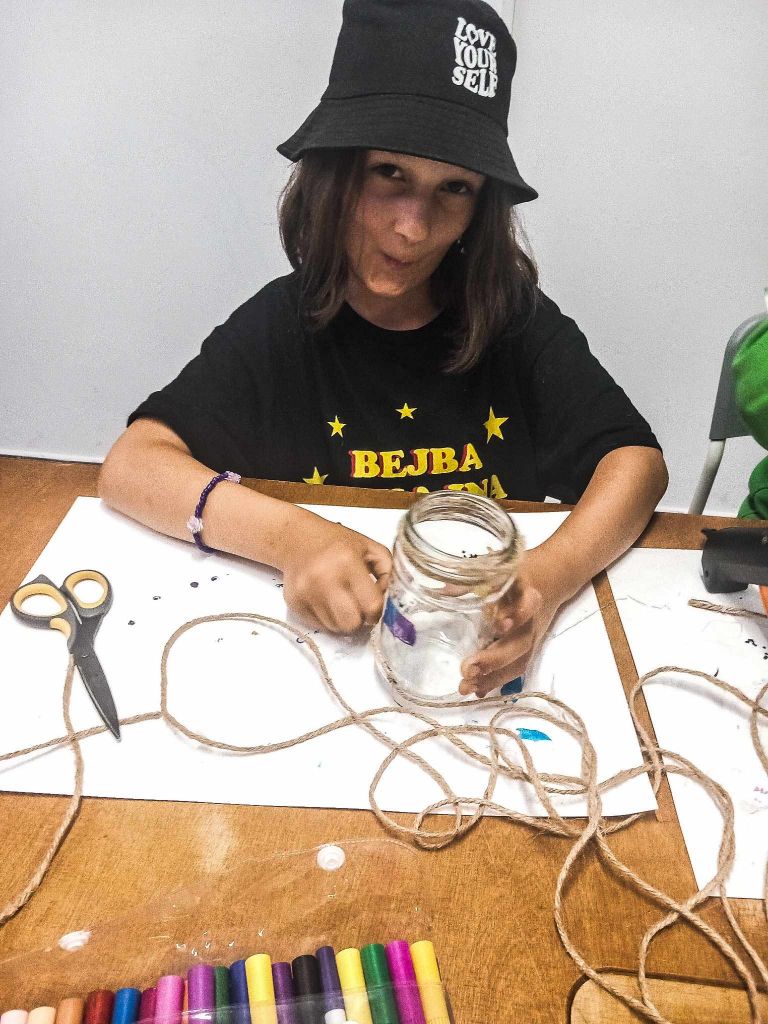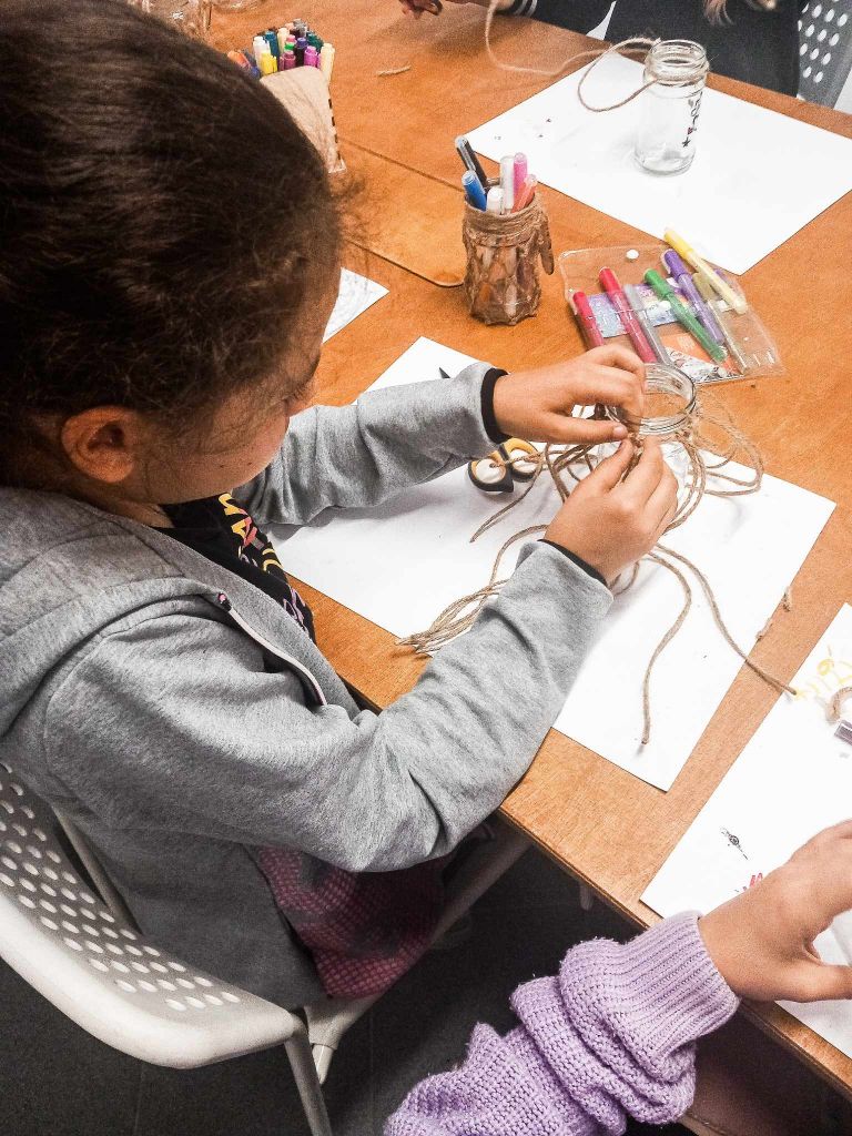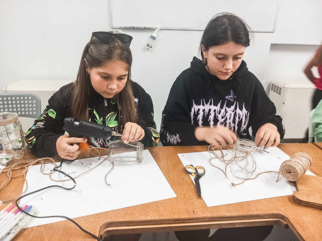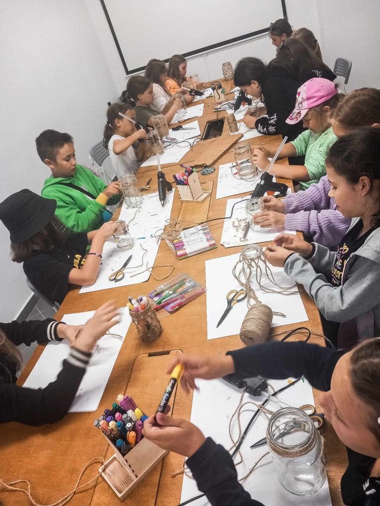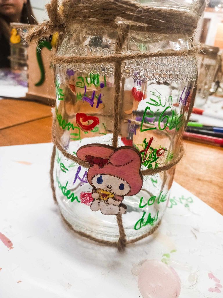 Wtorkowe dodatkowe warsztaty zawdzięczamy zaproszeniu od FabLab Gdańsk powered by Orange, którzy zaproponowali nam zrobienie słoików na przydaśki. Ozdabialiśmy je metodą makramy, choć niewielu podjęło wyzwanie nauczenia się specjalnego splotu, który pokazywała nam Pani Ania. Pozostali na własny sposób owijali słoiki sznurkiem i go do nich przyklejali na gorący klej. Jakby tego było mało, Pan Cyryl przy pomocy plotera laserowego wycinał nam różne kształty – piórka, jednorożce, pokemony, żabki, kaczuszki, wilki, co tylko wymyśliliśmy!