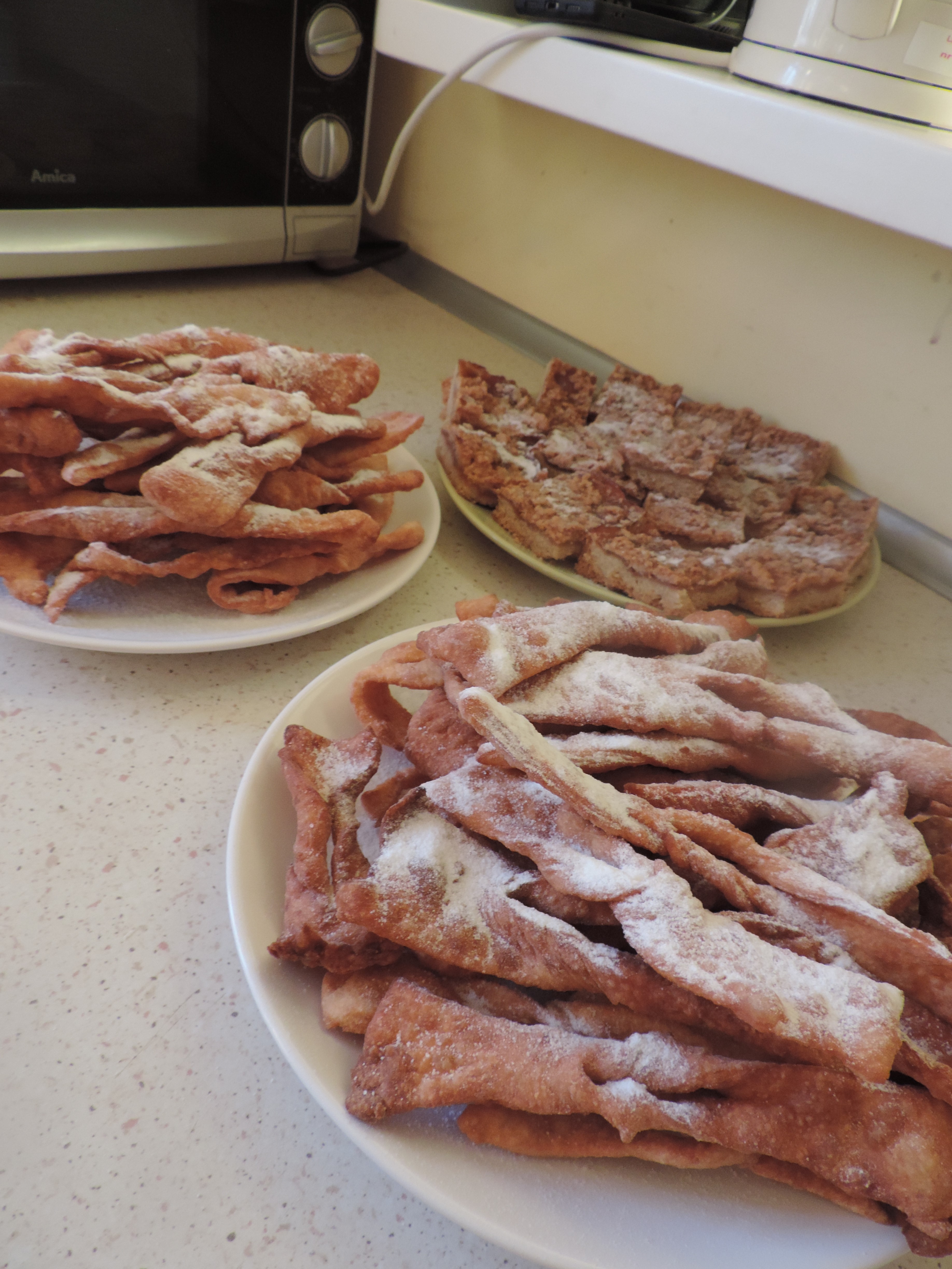 Rozwijamy swoje zdolności kulinarne – tym razem, w związku z Tłustym Czwartkiem, na warsztat wzięliśmy faworki. Nie poszliśmy na łatwiznę i nie kupowaliśmy słodkości w cukierni. Sami zasiedliśmy do zagniatania ciasta, wykrajania pasków i przewlekania ich tak, aby powstały faworki. Ciocie pomogły nam tylko ze smażeniem. Zrobiliśmy też pyszny jabłecznik.